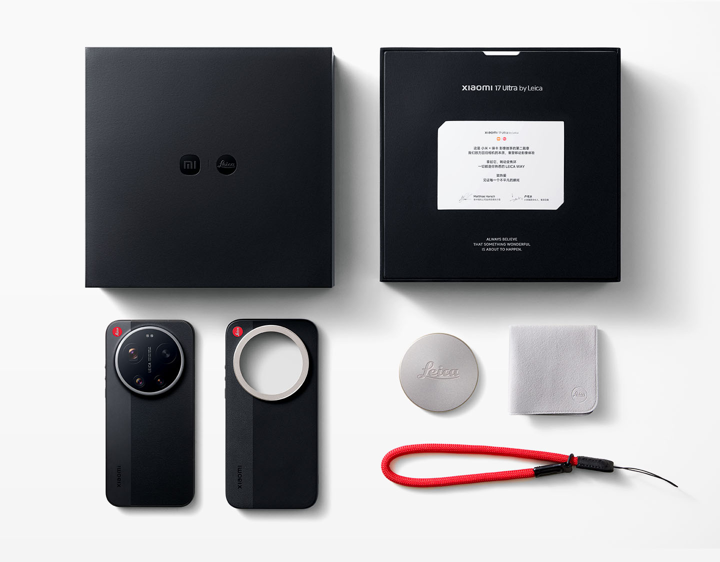 Ещё Xiaomi 17 Ultra by Leica примечателен особым комплектом поставки: девайс подаётся в особой коробке, внутри которого покупателя ждёт сам смартфон, особый фирменный чехол со встроенным магнитом, крышка для «шайбы» камер, ткань для протирания стекла, а также красный ремень для ношения смартфона на кисти. В остальном Xiaomi 17 Ultra by Leica не отличается от обычного Xiaomi 17 Ultra.