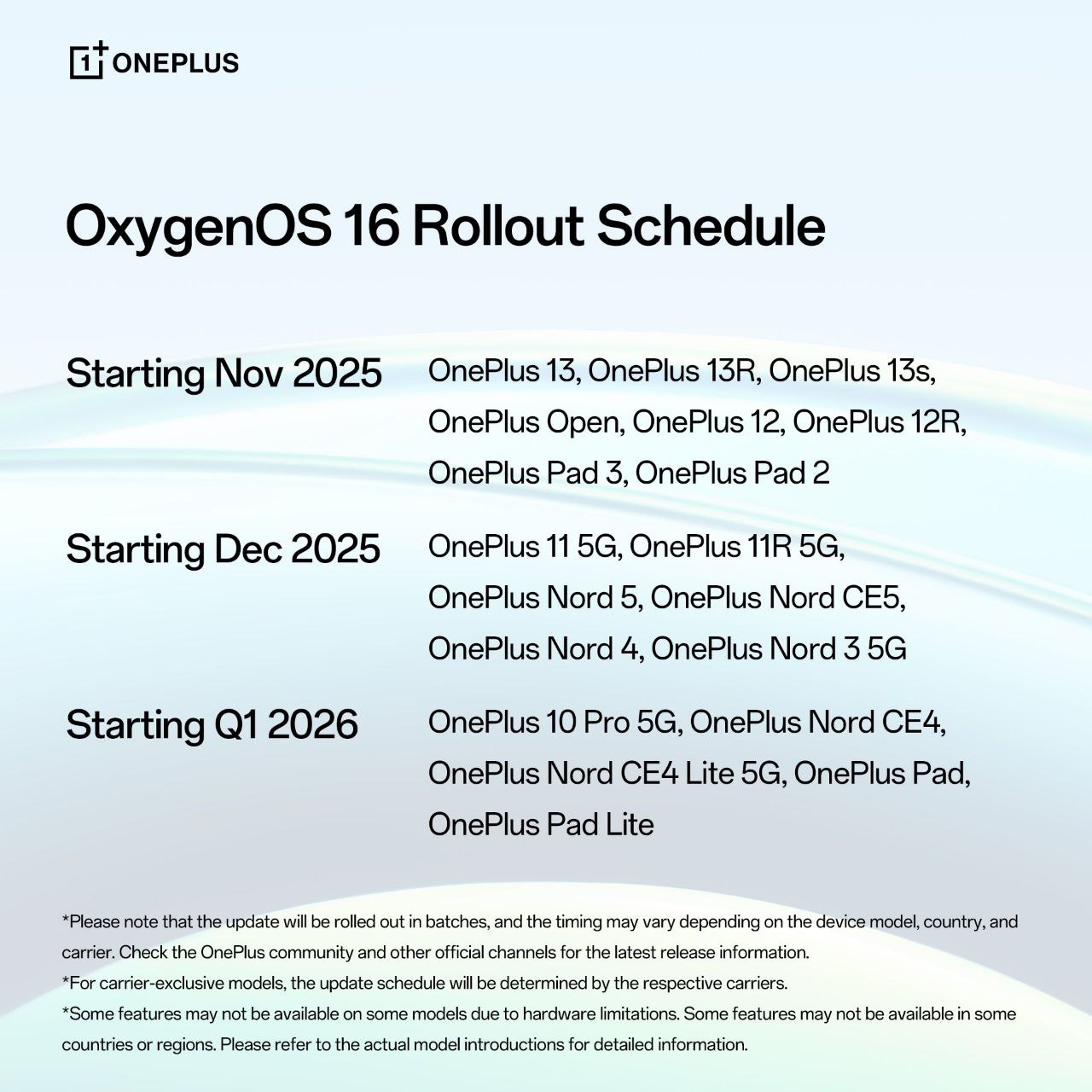 Если не считать OnePlus 15, который получит OxygenOS 16 из коробки, первыми опробовать обновление смогут владельцы предыдущих флагманов OnePlus 12 и 13 и их собратьев 12R, 13R и 13s. На эти устройства апдейт прибудет в ноябре. Тогда же обновление станет доступно для раскладушки OnePlus Open и планшетов OnePlus Pad 2 и Pad 3. В декабре компания осчастливит пользователей более старых устройств, включая OnePlus 11, а в первом квартале 2026 года настанет черёд ещё более древних моделей OnePlus 10 Pro и других.