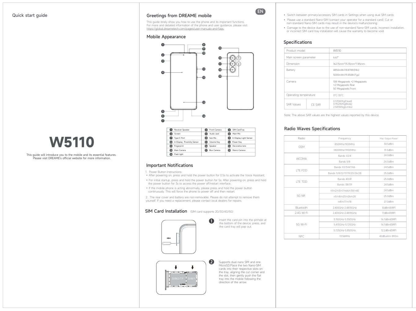 Однако вчера первый смартфон Dreame прошёл сертификацию EU Energy Label, благодаря чему мы узнали некоторые характеристики и индекс новинки — W5110. Также в Сети появилась инструкция к устройству с индексом Dreame W5110, из которой мы узнали коммерческое имя смартфона и ещё больше его характеристик.