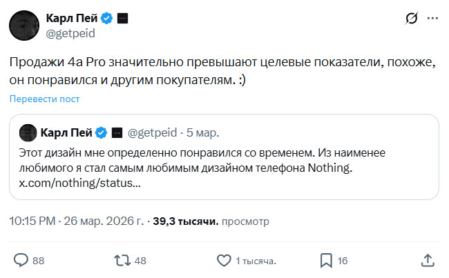 Карл Пэй, возглавляющий компанию Nothing, в очень странной манере вчера похвастался продажами свежевышедшей линейки смартфонов Phone (4a). Точнее говоря, лишь старшего Phone (4a) Pro: якобы модель «продаётся значительно лучше целевых показателей». Из этого Карл делает вывод, что девайс, «похоже, понравился и другим пользователям» помимо него самого.