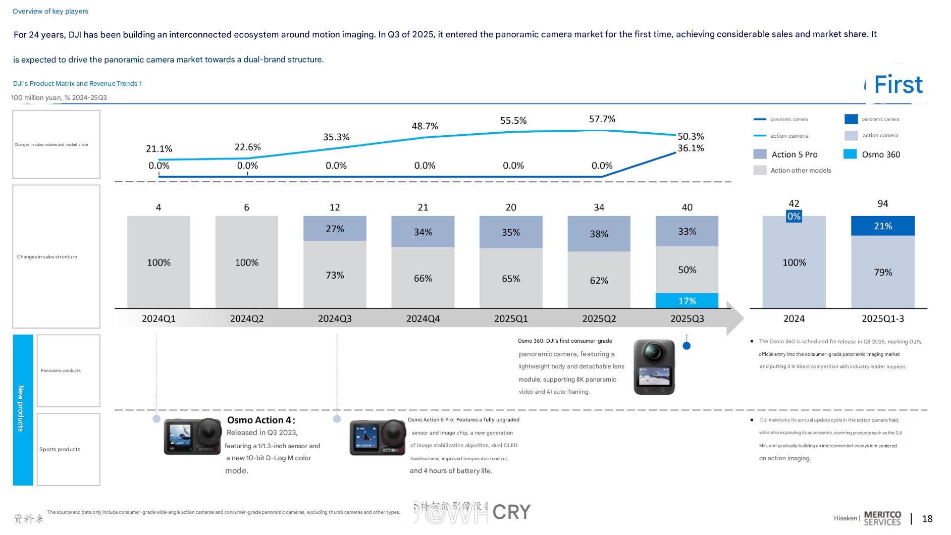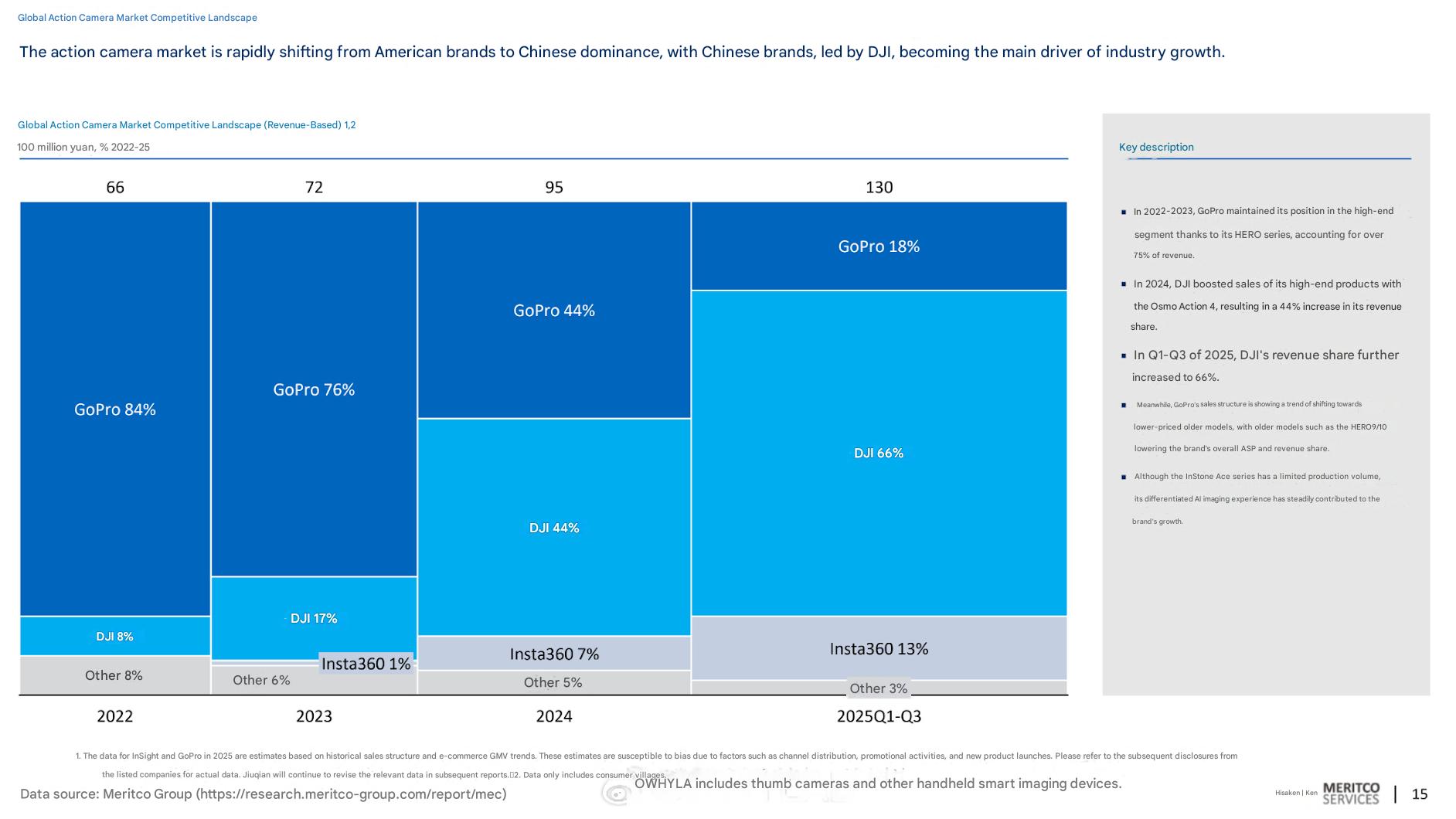 Ну а теперь, согласно отчёту исследователей, в период с первого по третий квартал 2025 года произошёл крайне драматичный слом: доля GoPro рухнула до 18%, опасно приблизившись с набирающей обороты Insta360 с её 13% рынка. Ну а новым лидером стала DJI, занявшая аж 66% мирового рынка экшн-камер. Многим DJI может быть известна как производитель дронов, микрофонов, электронных Gimbal-стабилизаторов и мини-камерами DJI Pocket на Gimbal-стабилизаторах.
