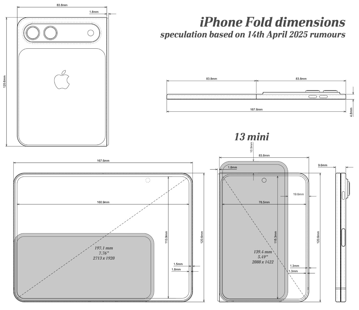 Озвученные диагонали экрана близки к тем, что на днях упоминал авторитетный инсайдер Digital Chat Station. Согласно схемам, слитым в Сеть ещё весной, первая раскладушка Apple будет иметь небольшую высоту 120 мм, но при этом ширина корпуса будет не самой удобной: 83,8 мм. Запуск устройства, напомним, ожидается осенью 2026 года.
