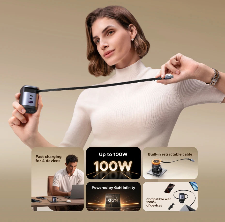Другое популярное решение бренда именуется UGREEN GaN 100W представляет собой удобное зарядное устройство со встроенным втягивающимся кабелем длиной 75 см. Девайс может выдавать до 100 Вт мощности и оснащён парой портов формата USB-C и одним USB-A, за счёт чего может заряжать до 4 устройств одновременно. За безопасность отвечает 8-уровневая система защиты от перенапряжения, короткого замыкания и перегрева.