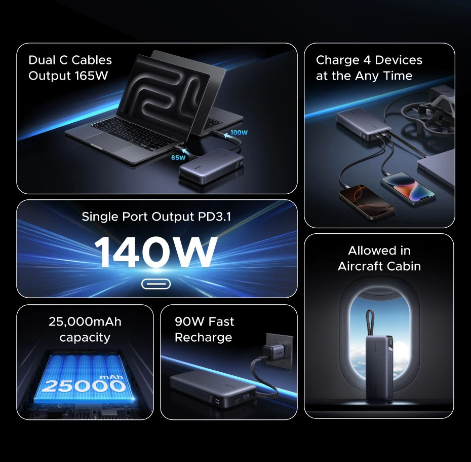 Одним из ведущих гаджетов бренда является сверхмощный пауэрбанк UGREEN Nexode PD 165 Вт, вмещающий в себя 25 000 мАч энергии и оснащённый встроенным кабелем USB-C и удобной петлёй для руки. С его помощью можно легко заряжать сразу пару ноутбуков, а сам он питается от розетки по 90-Вт технологии.