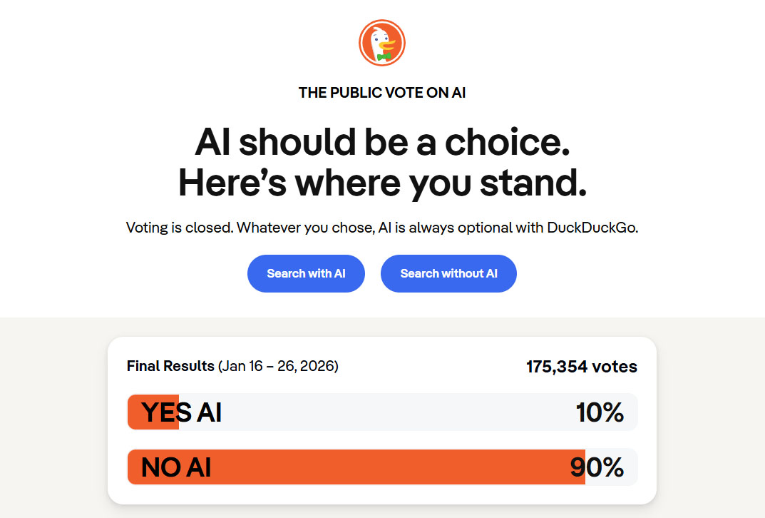 Команда конкурирующего поисковика DuckDuckGo, позиционирующий себя альтернативой Google с упором на конфиденциальность, провела среди своих пользователей простой опрос с двумя вариантами ответа: «поиск с ИИ» и «поиск без ИИ». Результат 10-дневного опроса (с 16 по 26 января 2026 года) оказался красноречивей некуда: 90% из 175 354 респондентов проголосовали за поиск без ИИ.