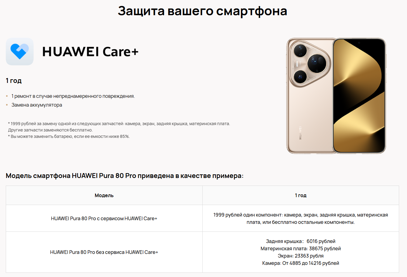 Есть тут небольшая звездочка, о которой лучше знать, чем не знать: замене подлежат аккумуляторы с вычисленной емкостью менее 85%, а бесплатный ремонт затрагивает поломки камер, экрана, крышки и материнской платы, но только один раз. Все остальное обслуживается по стандартной гарантии. Для сравнения – без Huawei Care+ ремонт одной только материнки обошелся бы 38 675 рублей, экрана – 23 363 рубля, камеры – до 14 216 рублей, а крышка ушла бы за 6016 рублей. Да уж… С такими ценами лучше с Care+!