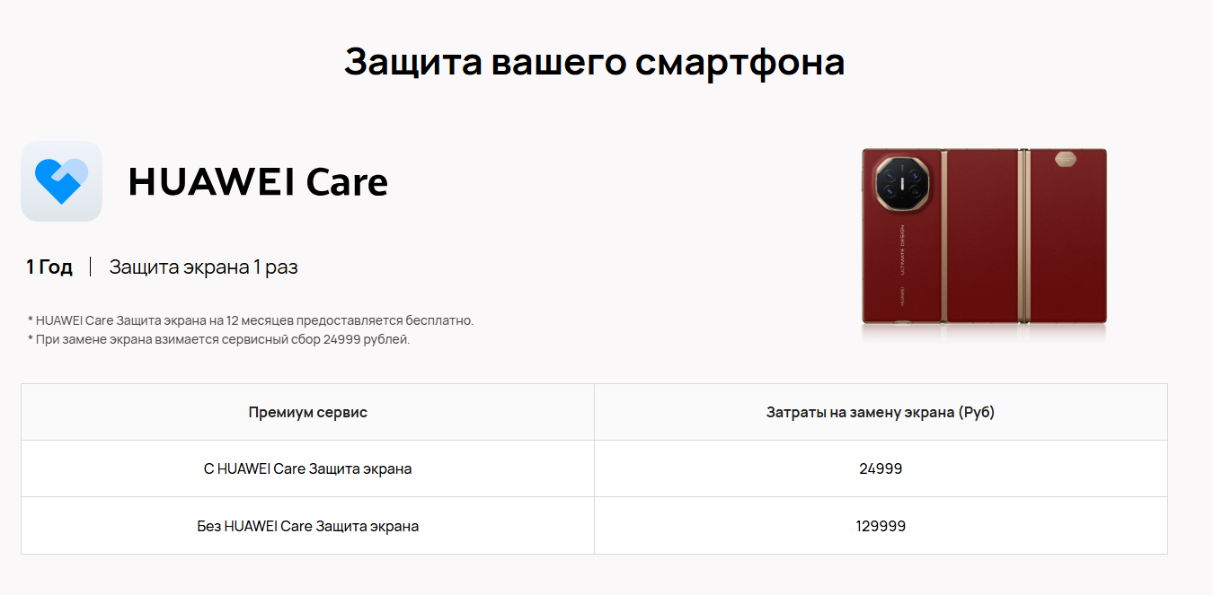 Что до смартфонов, планшетов и ноутбуков – им Huawei Care предоставляет дополнительный срок гарантии. Для первых двух также можно в течение года после покупки заменить экран с сохранением гарантии. Я решил проверить цену замены экрана на самом “сложном” для этого устройстве – Huawei Mate XT. Ну помните, трикладушка, с которой еще Денис какое-то время ходил? У нас обзор есть, кстати. Так вот, в случае повреждения экрана, замена вам обойдется в 130 000 рублей. Нехило! А вот с сервисом HUAWEI Care она будет стоить уже 25 000 рублей. Многовато, да, но это уже не 130 тысяч, согласитесь! С такой выгодой можно себе целый ноутбук купить или второй смартфон. Так что оформляем однозначно.