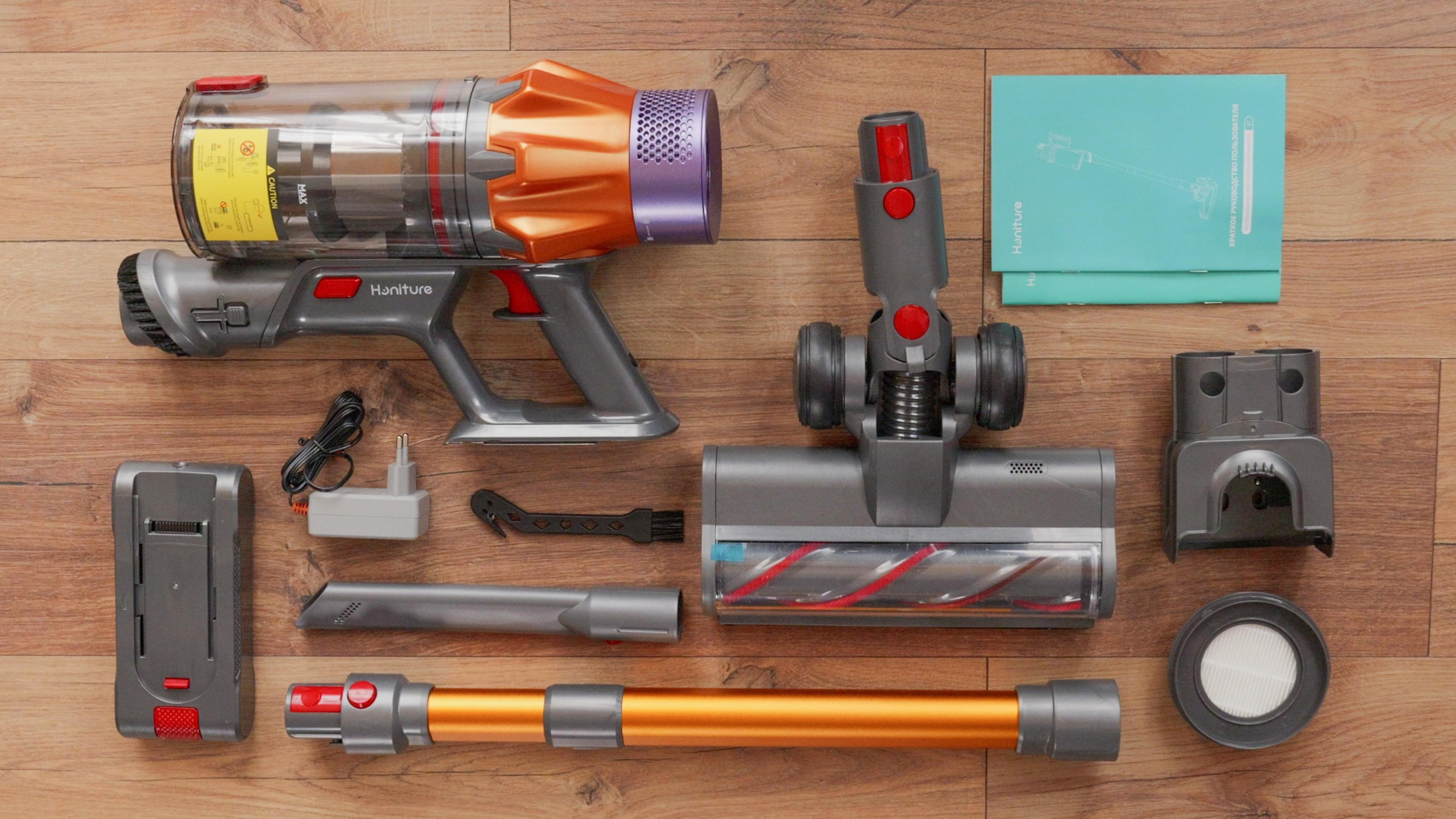 Отставить! В коробке нашлось место буквально всему: сам пылесос, телескопическая труба, турбощетка с подсветкой, щелевая насадка, дополнительный HEPA-фильтр, настенное крепление для «пылика» с держателем насадок, аккумулятор, нож-щетка для обслуживания устройства, блок питания и документация. Все необходимое на месте, осталось только собрать пылесос, что не составит большого труда.