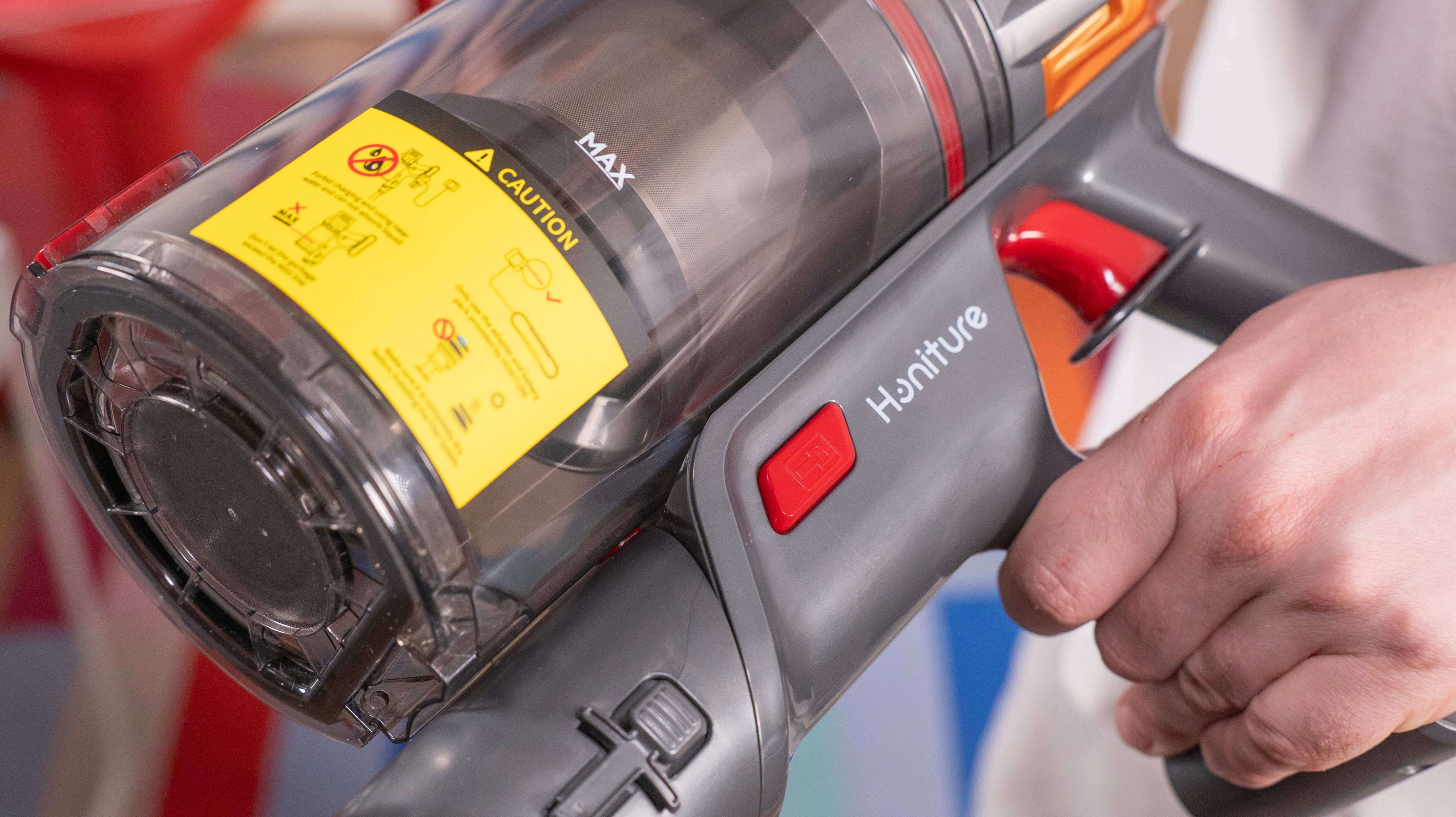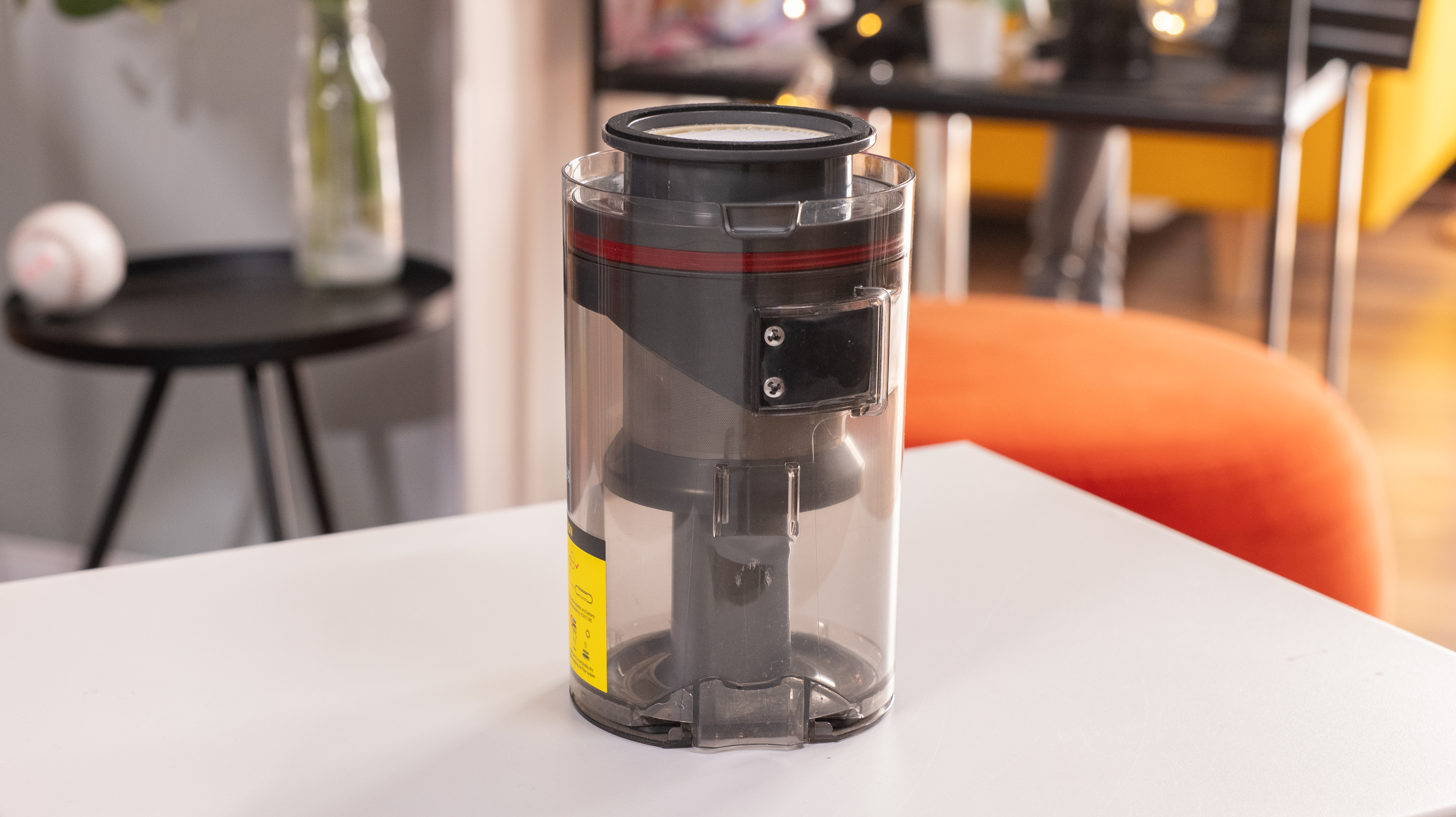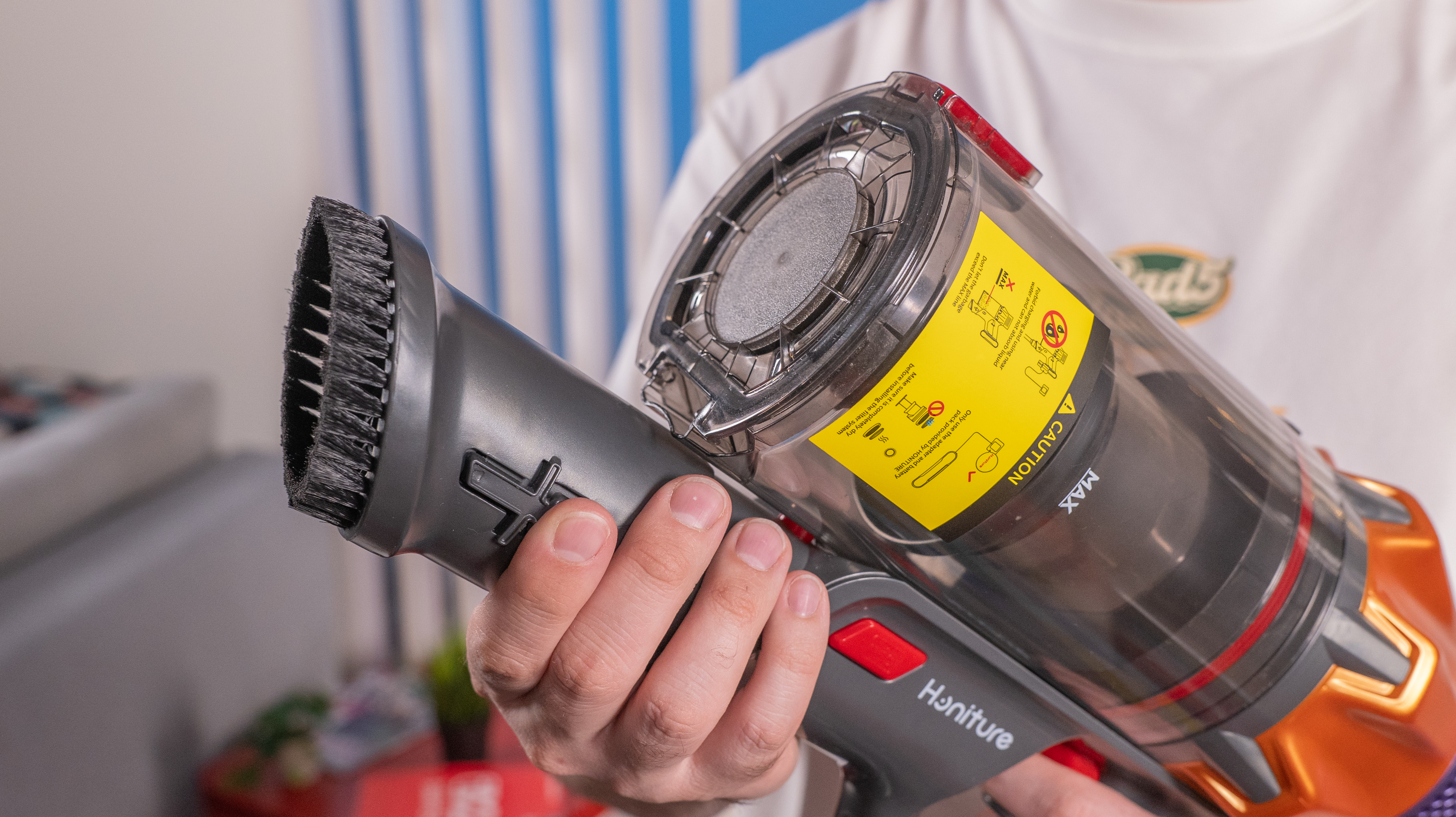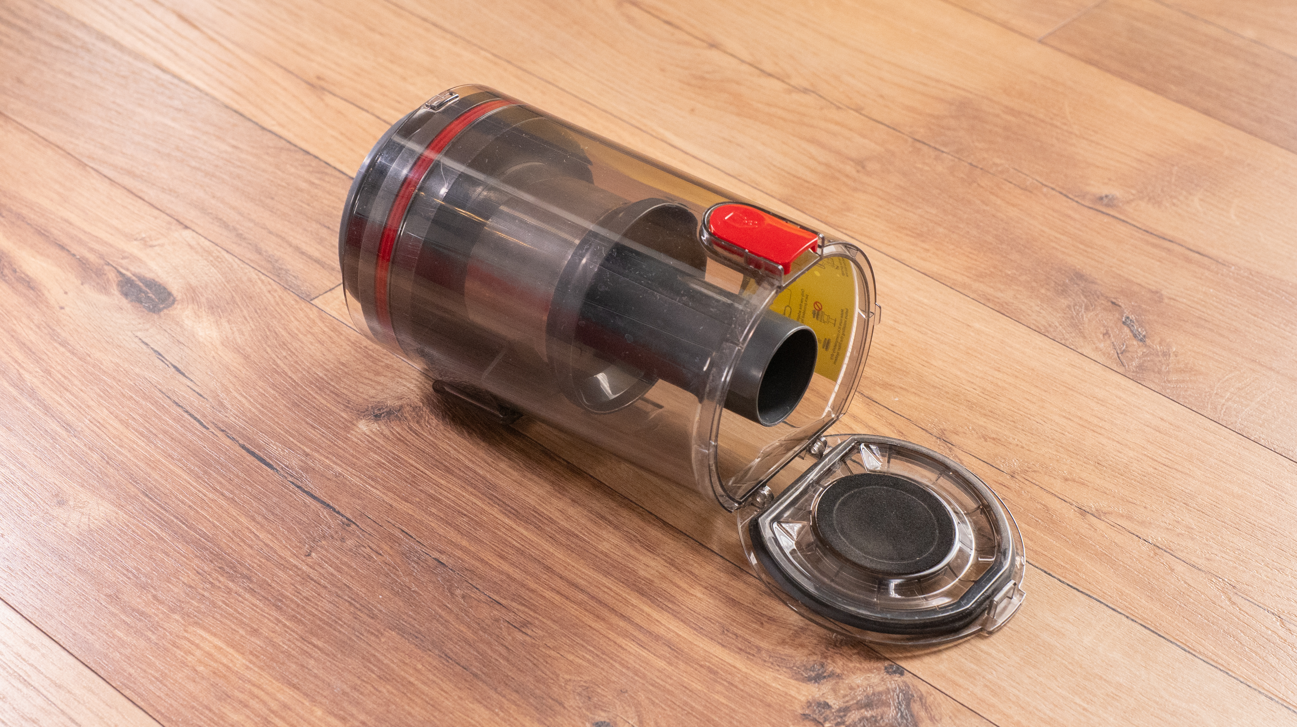 Большую часть корпуса занимает контейнер для мусора объемом 1.2 литра. Он легко опустошается: нажатием кнопки замка на корпусе открывается крышка (дно бака). А для более тщательного обслуживания ниже есть двусторонний замок, с которого бак отстегивается полностью и обнажает один из HEPA-фильтров. «Нулевого» фильтра обнаружено не было.