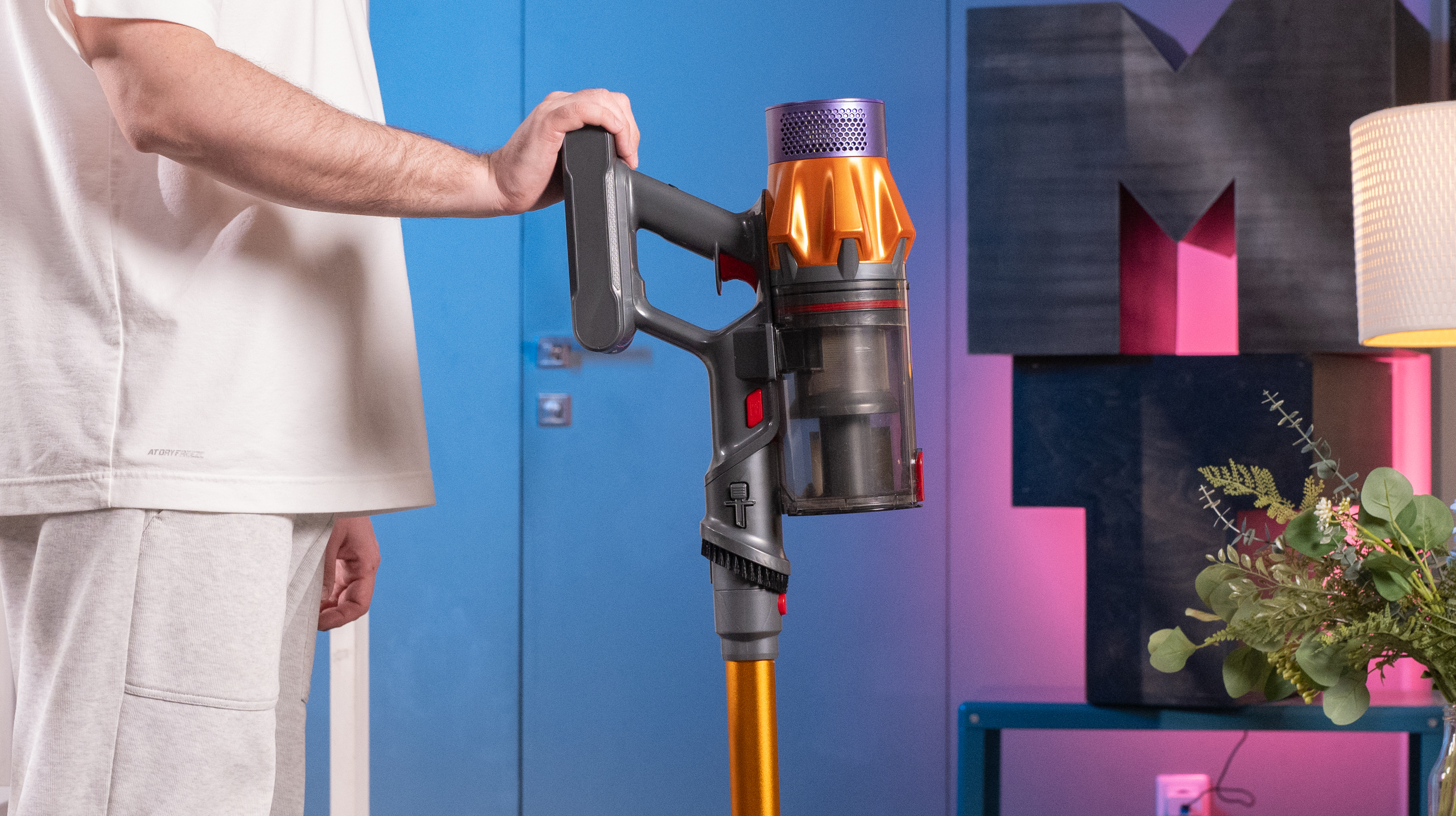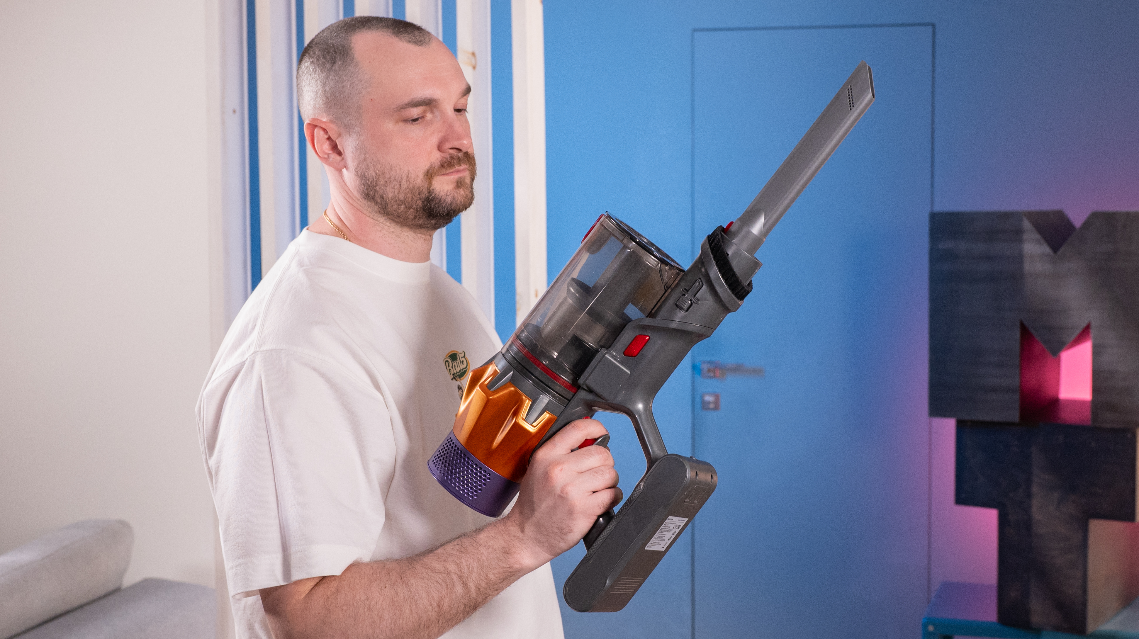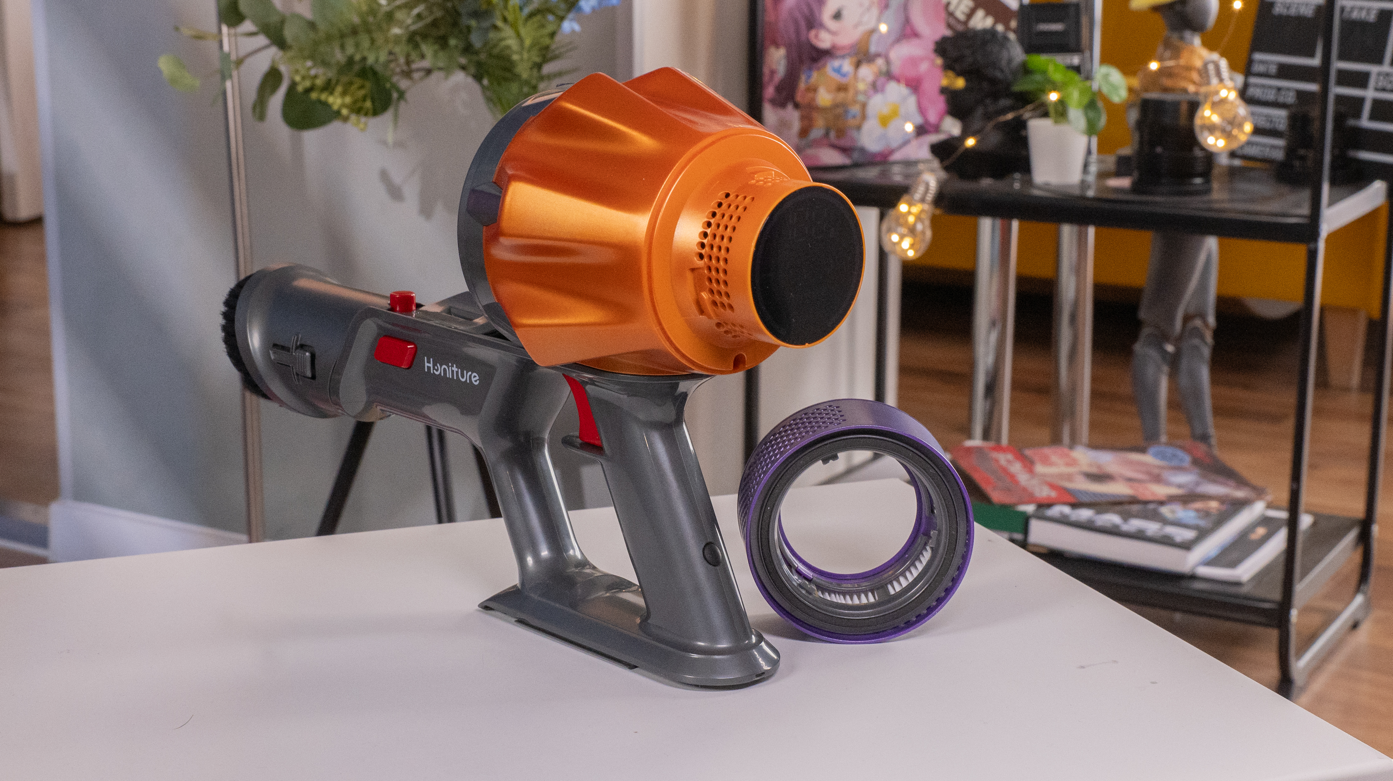 Внешний вид пылесоса явно отсылает к продуктам Dyson, но только Honiture доступнее будет: на Ozon я его видел за 16 500 рублей. Вообще, дизайн, я бы сказал, яркий: позолоченная труба, того же цвета "коронка" на корпусе и фиолетовый обод фильтра. Декоративные элементы сделаны из пластика, но сама конструкция металлическая, так что цветастость в данном случае признаком халтуры не является.