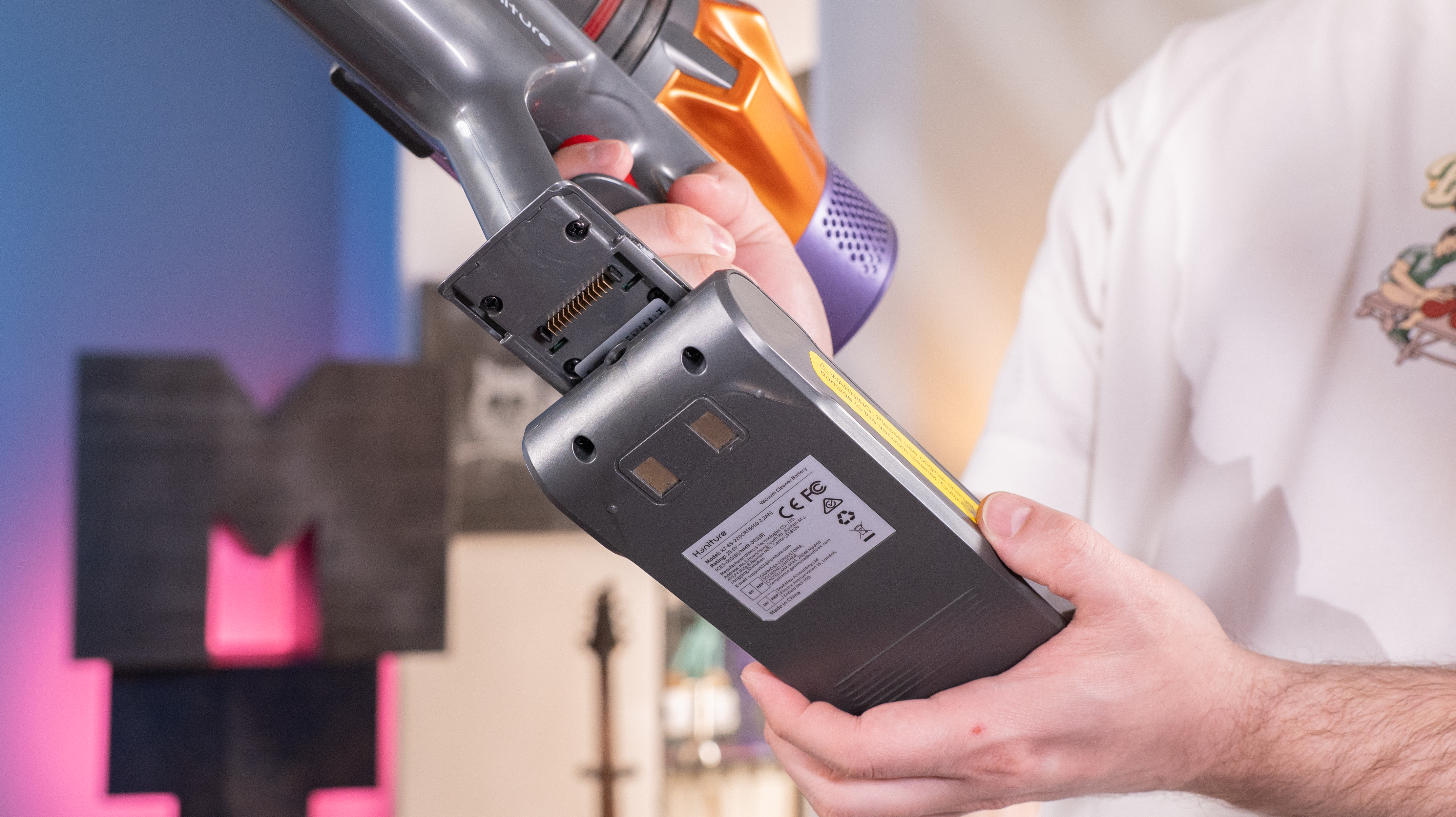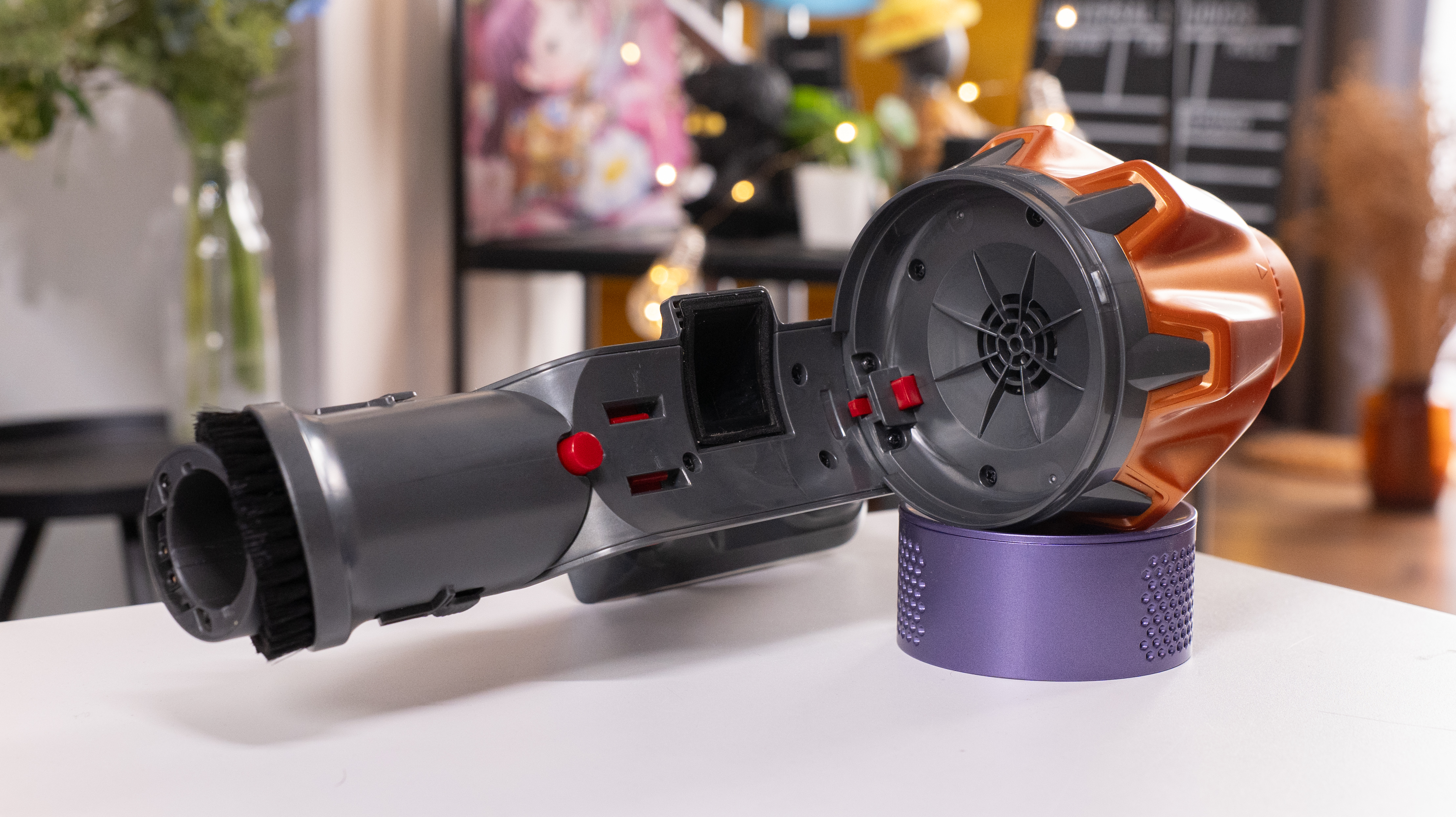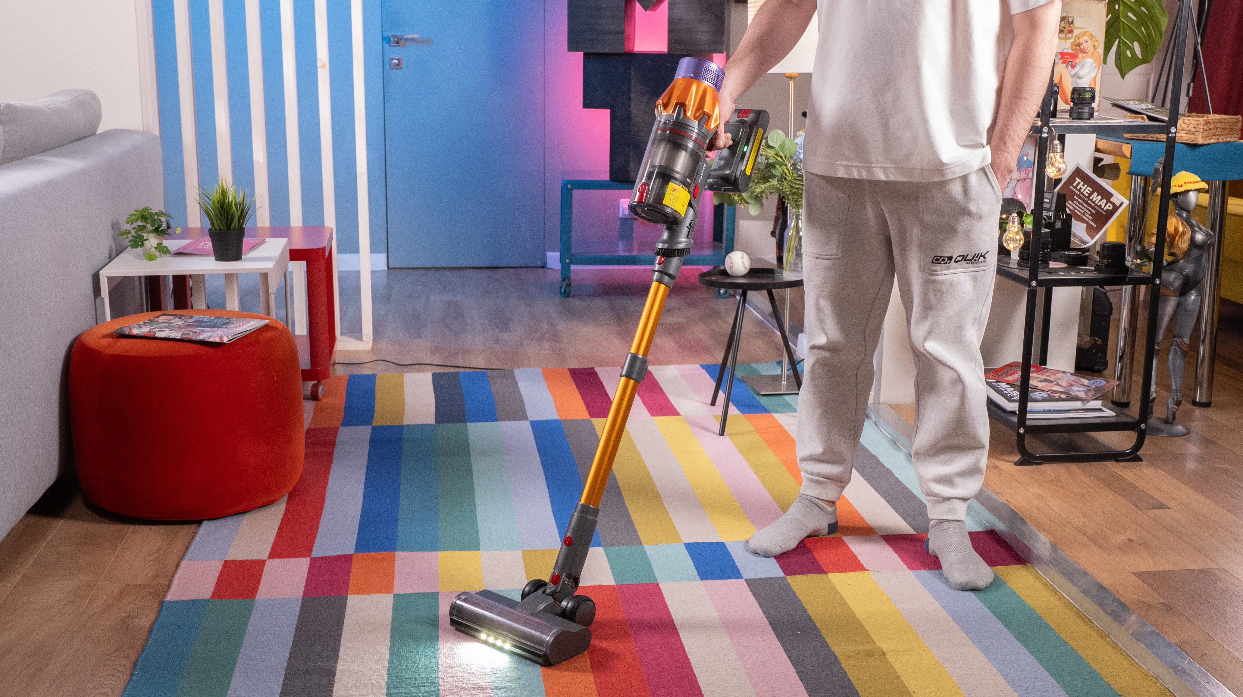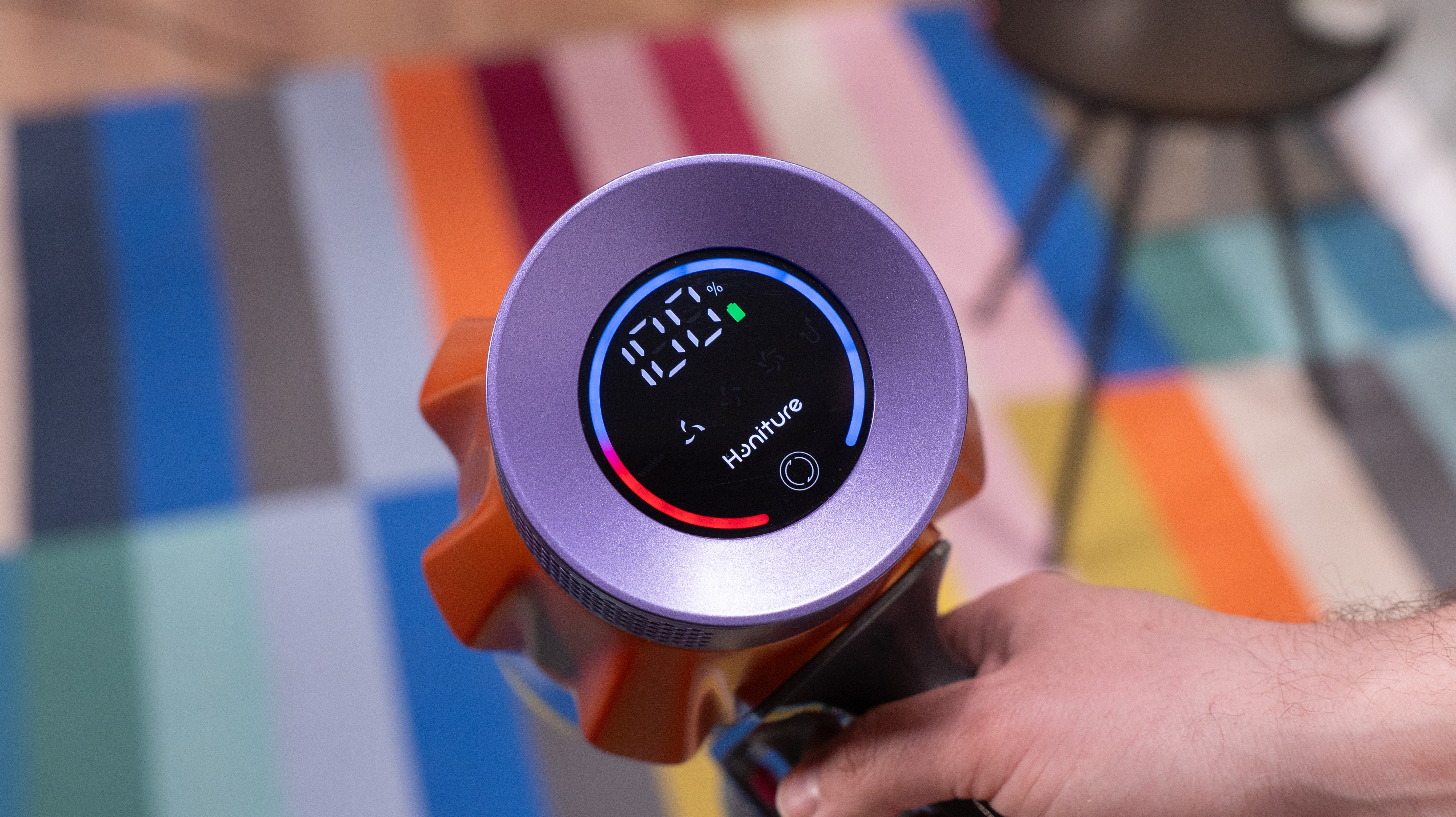 Внешний вид пылесоса явно отсылает к продуктам Dyson, но только Honiture доступнее будет: на Ozon я его видел за 16 500 рублей. Вообще, дизайн, я бы сказал, яркий: позолоченная труба, того же цвета "коронка" на корпусе и фиолетовый обод фильтра. Декоративные элементы сделаны из пластика, но сама конструкция металлическая, так что цветастость в данном случае признаком халтуры не является.