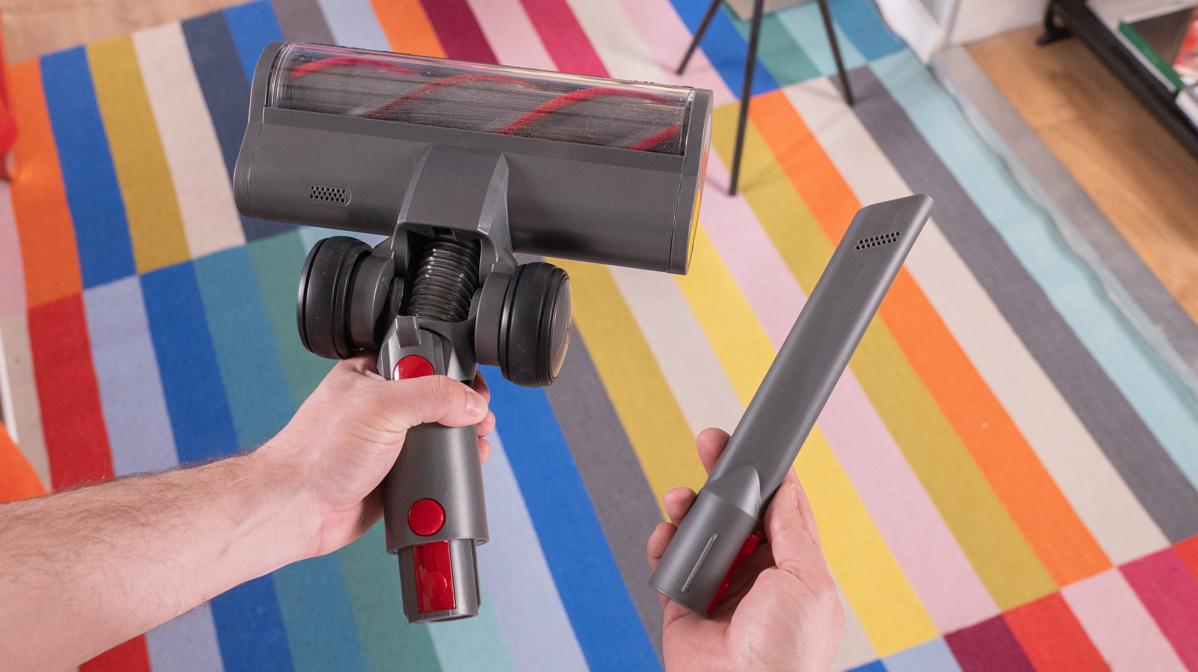 Помимо чудо-насадки имеем еще длинную щелевую насадку. Этот «носик» отлично засовывается во всякие труднодоступные места по типу щелей между мебелью и подушками в диване. А еще есть самая обычная турбощетка с резиновым валиком: она прищелкивается к телескопической трубе, несет в себе LED-подсветку, а валик тут помогает собирать шерсть и волосы. А если сильно спутаются – можно почикать их комплектным «резцом». По сути, стандартная насадка, которая есть у всех вертикальных пылесосов, но у нашей еще подсветочка имеется. Приятный бонус!