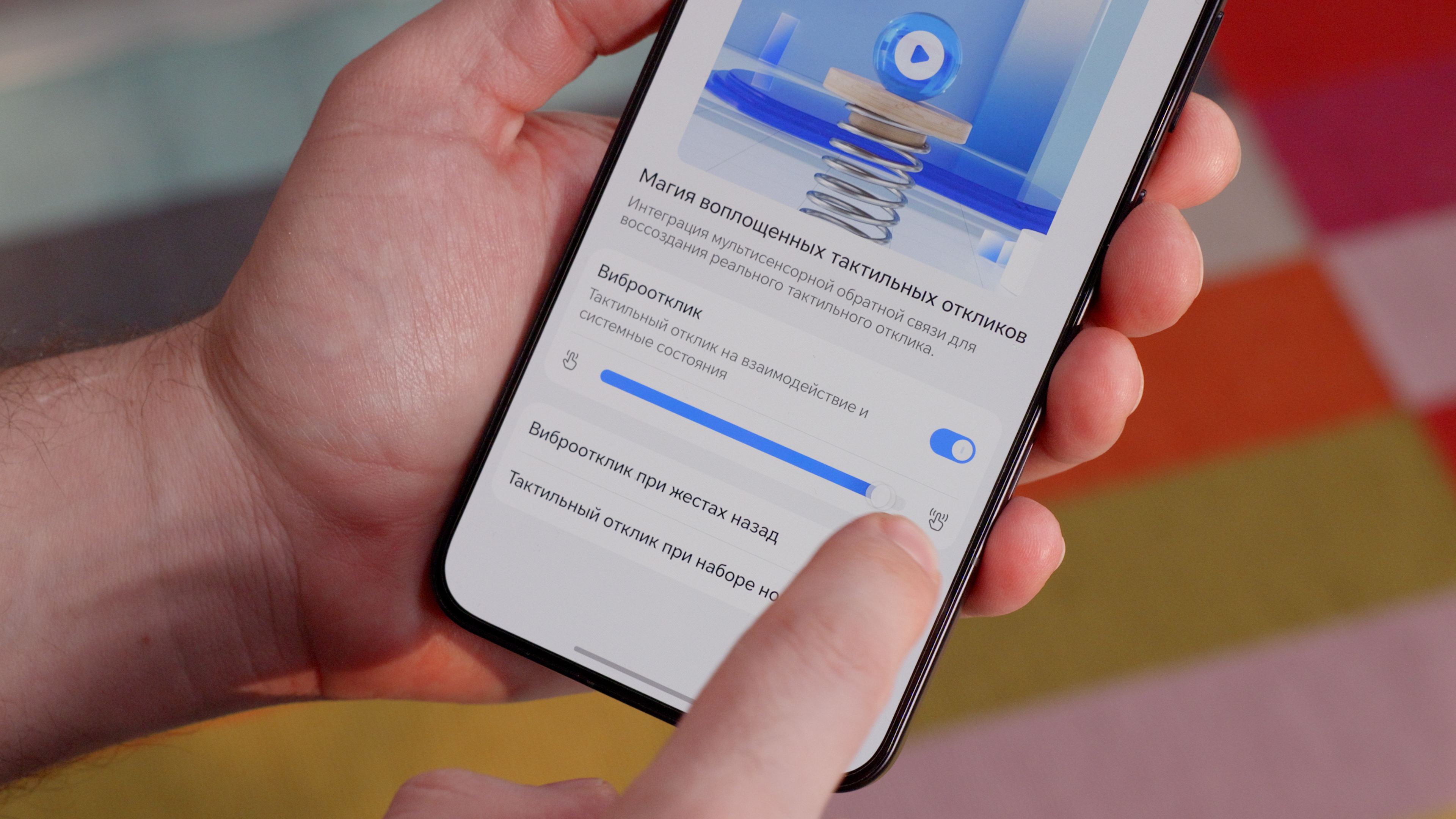 Тактильная вибрация на месте. Ей даже посвящен отдельный раздел в меню, где можно найти настройки и демку (рекомендую запускать ее без звука, чтобы проникнуться вибрацией). Эффекты по системе заметны и я также рекомендую включить вибро при жестах назад.