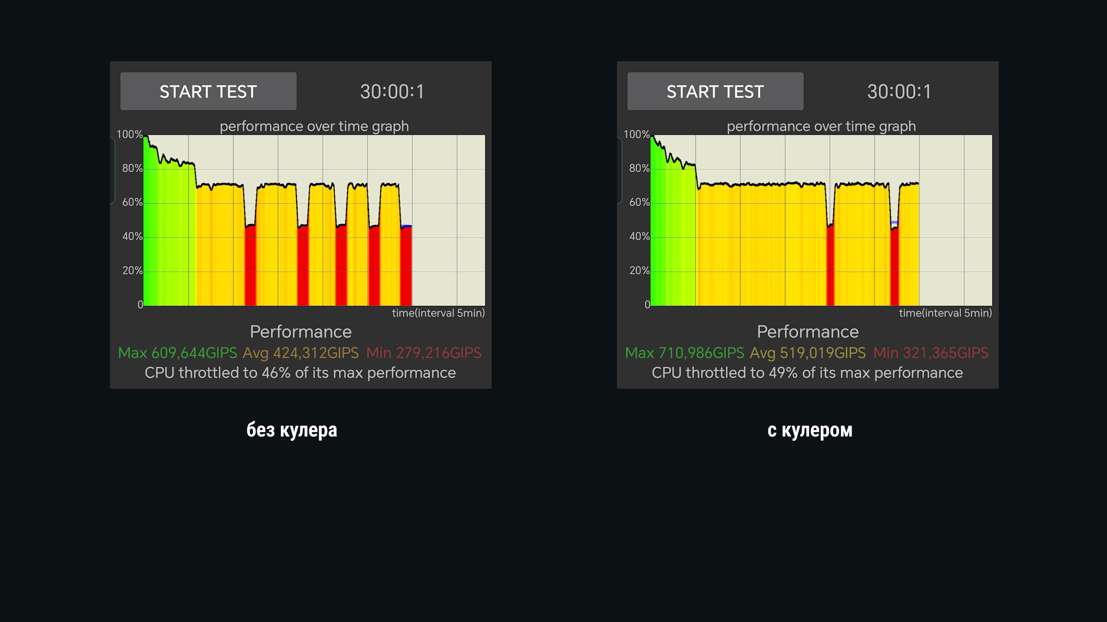 Бенчмарки прогонялись в игровом режиме. В одном случае кулер был выключен, в другом – активирован на максимальных оборотах.