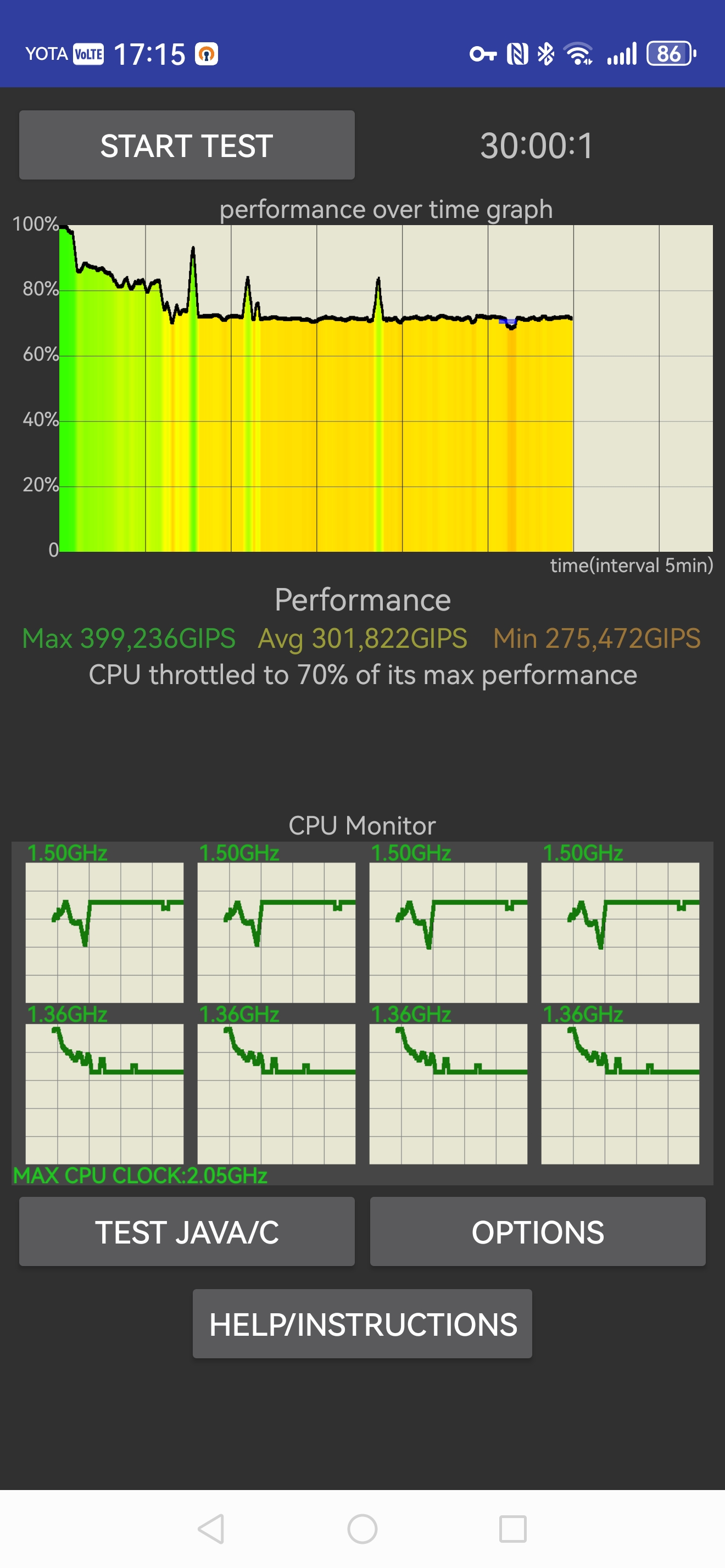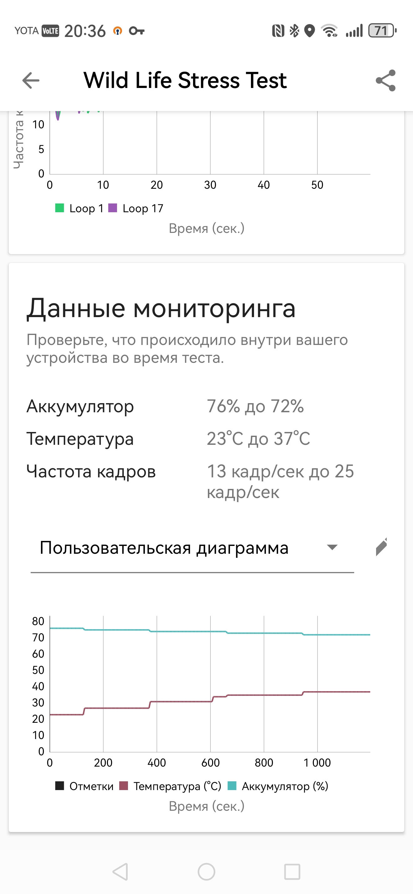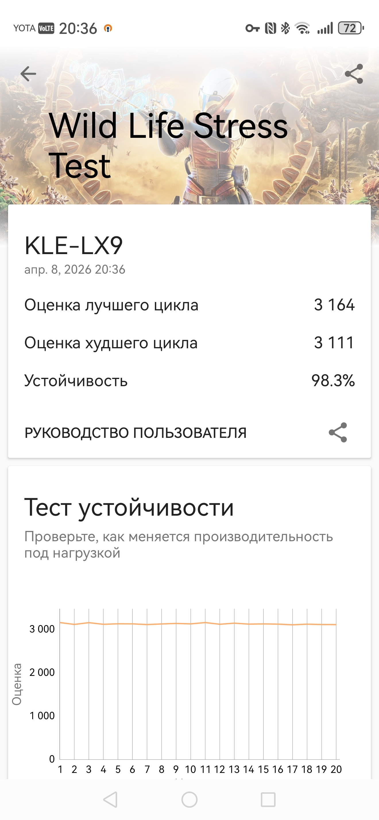 По CPU смартфон быстро сбрасывает производительность в начале, но затем стабильно держит уровень около 70% максимума. Со стабильностью GPU всё намного лучше: 3Dmark не зафиксировал троттлинг вообще, но абсолютные значения относительно невелики. Для сравнения, POCO X8 Pro и X8 Pro Max даже после троттлинга выбивают более 9000 баллов. В играх, однако, всё совсем не так печально, как кажется по этим цифрам.