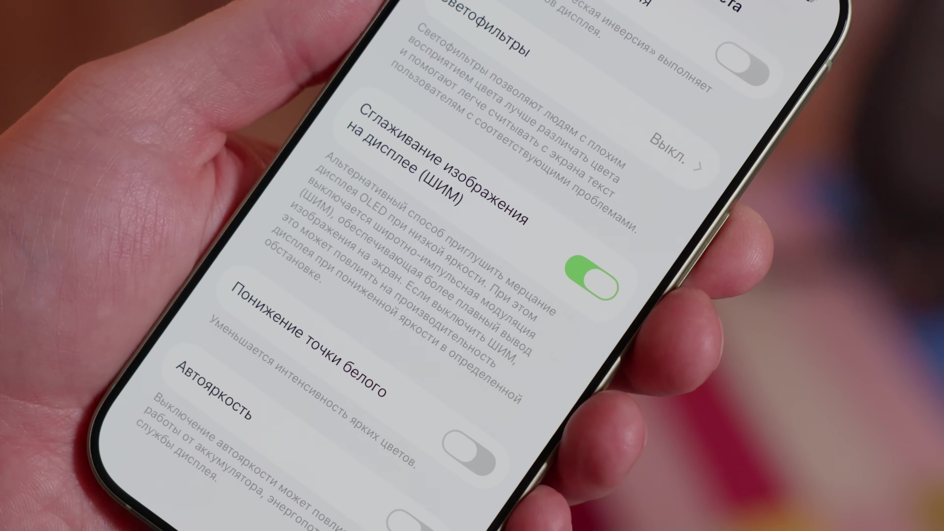 В «универсальном доступе» у 17 айфонов есть пункт «Сглаживание изображения на экране (ШИМ)». С ним мерцания на низкой яркости становится меньше, и я могу назвать опцию рабочей – коэффициент пульсации снижается почти в 2 раза, и лично я ощущаю снижение нагрузки на глаза. Повторяю: чтобы снизить ШИМ-мерцание, надо включить ШИМ.