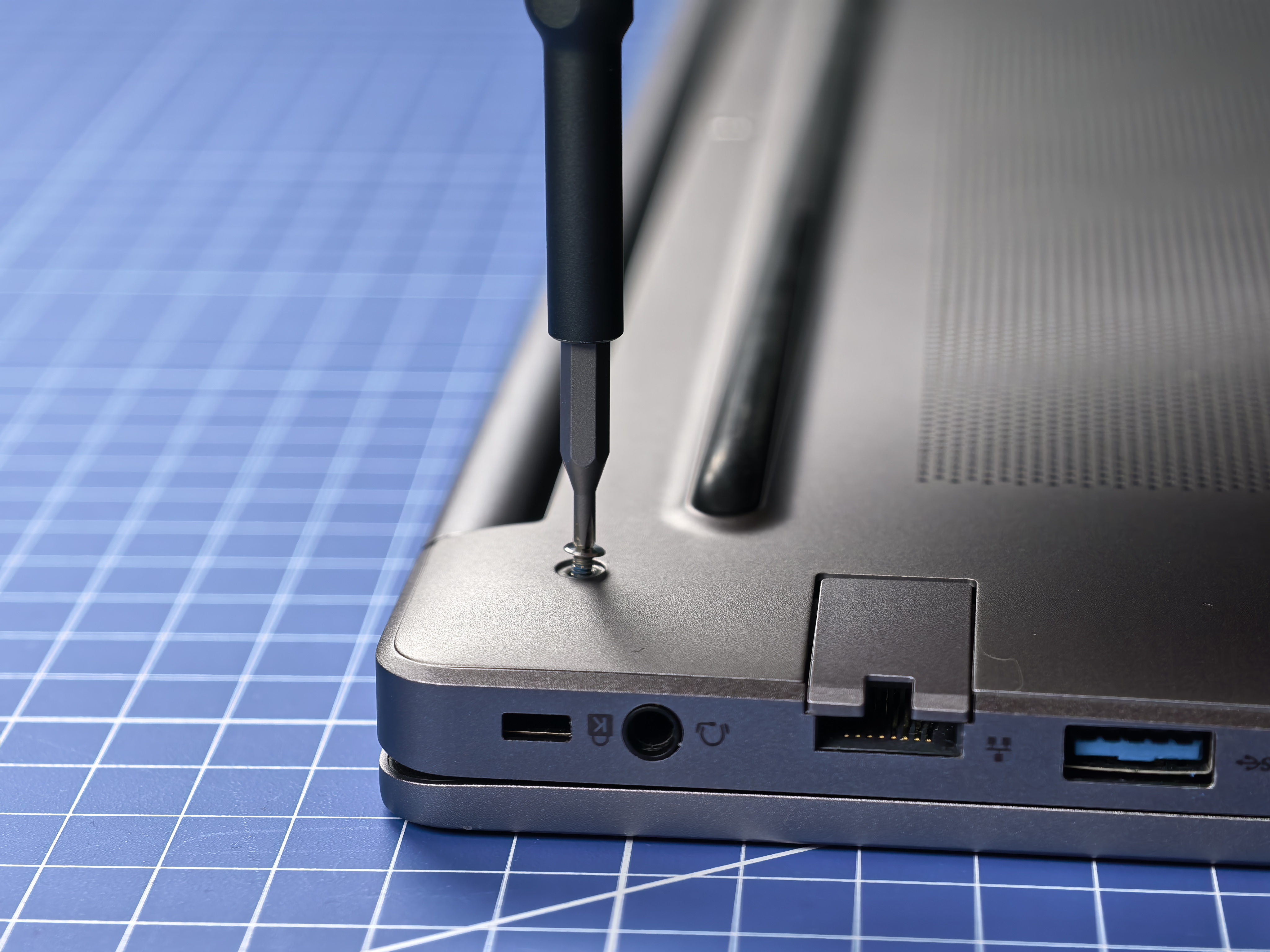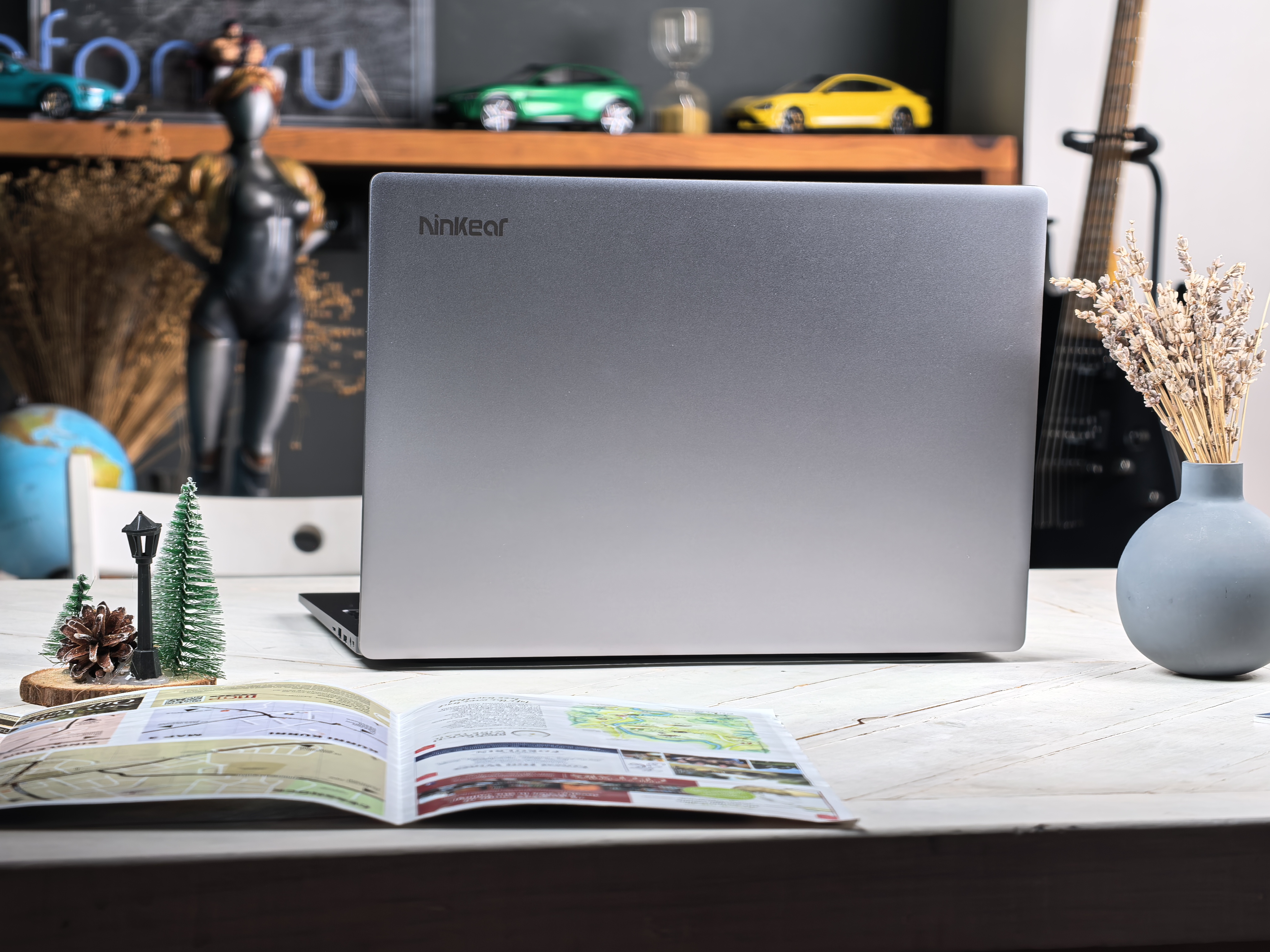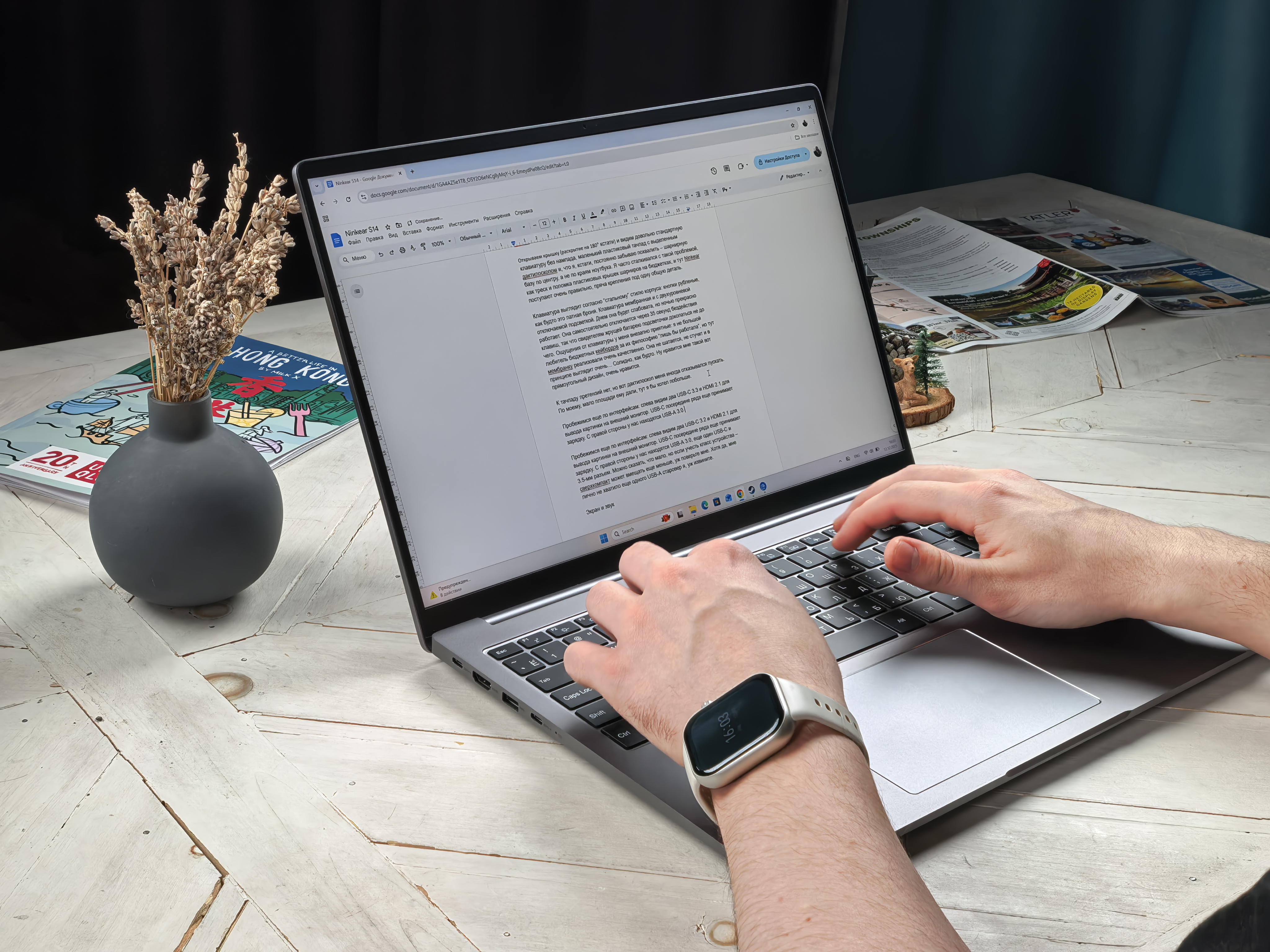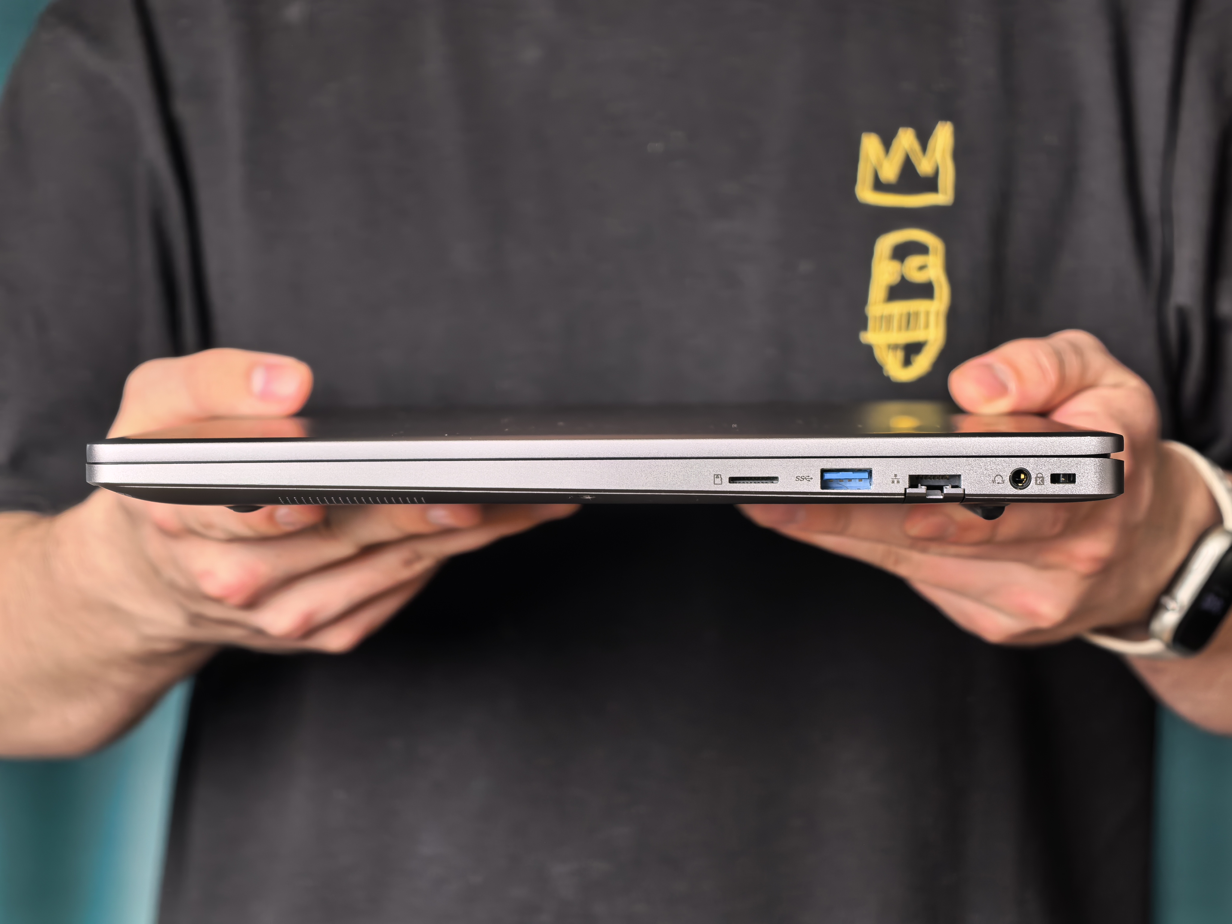 Ноутбук окрашен в серый цвет, как и большинство продукции Ninkear. Весь декор состоит из названия компании. Ни выкрутасов, ни линий – сдержанный офисный стиль. Крышка дисплея металлическая, как и нижняя крышка, а вот остальная часть корпуса в пластике. Снизу видим перфорацию для динамиков, воздуховод, а по бокам разъемы: с левого торца два USB-C (один для зарядки), один USB-A и HDMI; на правом торце, внезапно, обнаруживаем кардридер для microSD, USB-A, LAN-разъем RJ-45, аудиоразъем 3.5 мм и слот для замка Kensington. Приятно удивлен наличию кардридера! Все же рано производители начали забывать про эту тему и вырезать его из своих ноутбуков!