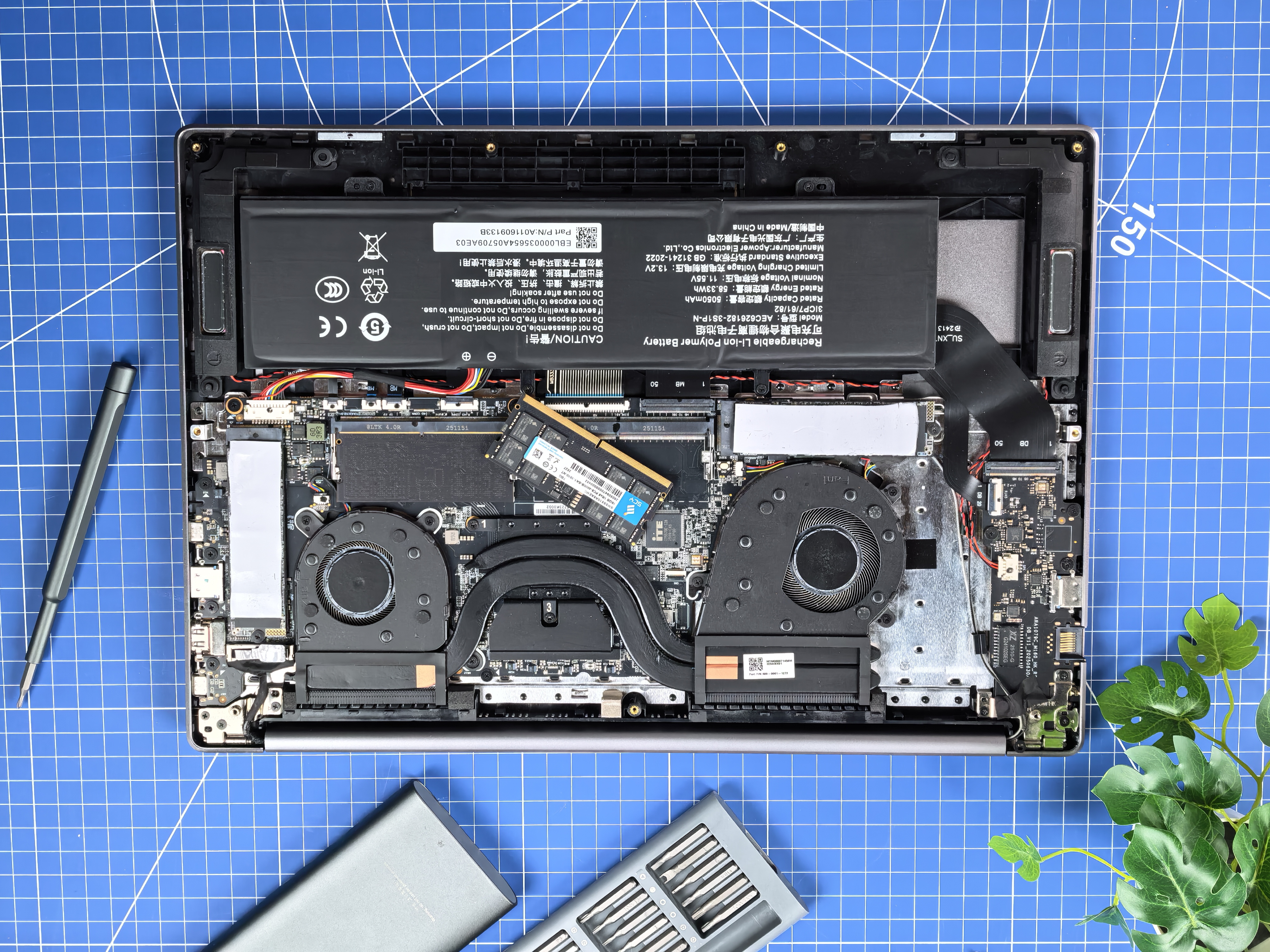 Снимем крышку и посмотрим на богатый внутренний мир. Скрывается он под девятью болтами (юзаем битку PH00). Внутри нас ждет классика: в верхней части – материнская плата с охлаждением, в нижней – аккумулятор. Процессор «скрывается» под двумя трубками охлаждения, которые расходятся к двум разного размера. Сердце – очень яйчистый AMD Ryzen 7 8745HS на 8 ядрах и 16 потоках с рабочей частотой 3.8 ГГц. В бусте частота поднимается до 4.9 ГГц. Красная мощь! Видеокарту тут можете не искать. Видеоядро за нее! И это легендарный Radeon 780m, который получился слишком уж удачным для встроенного видеочипа. Его рабочие частоты 800-2600 МГц.