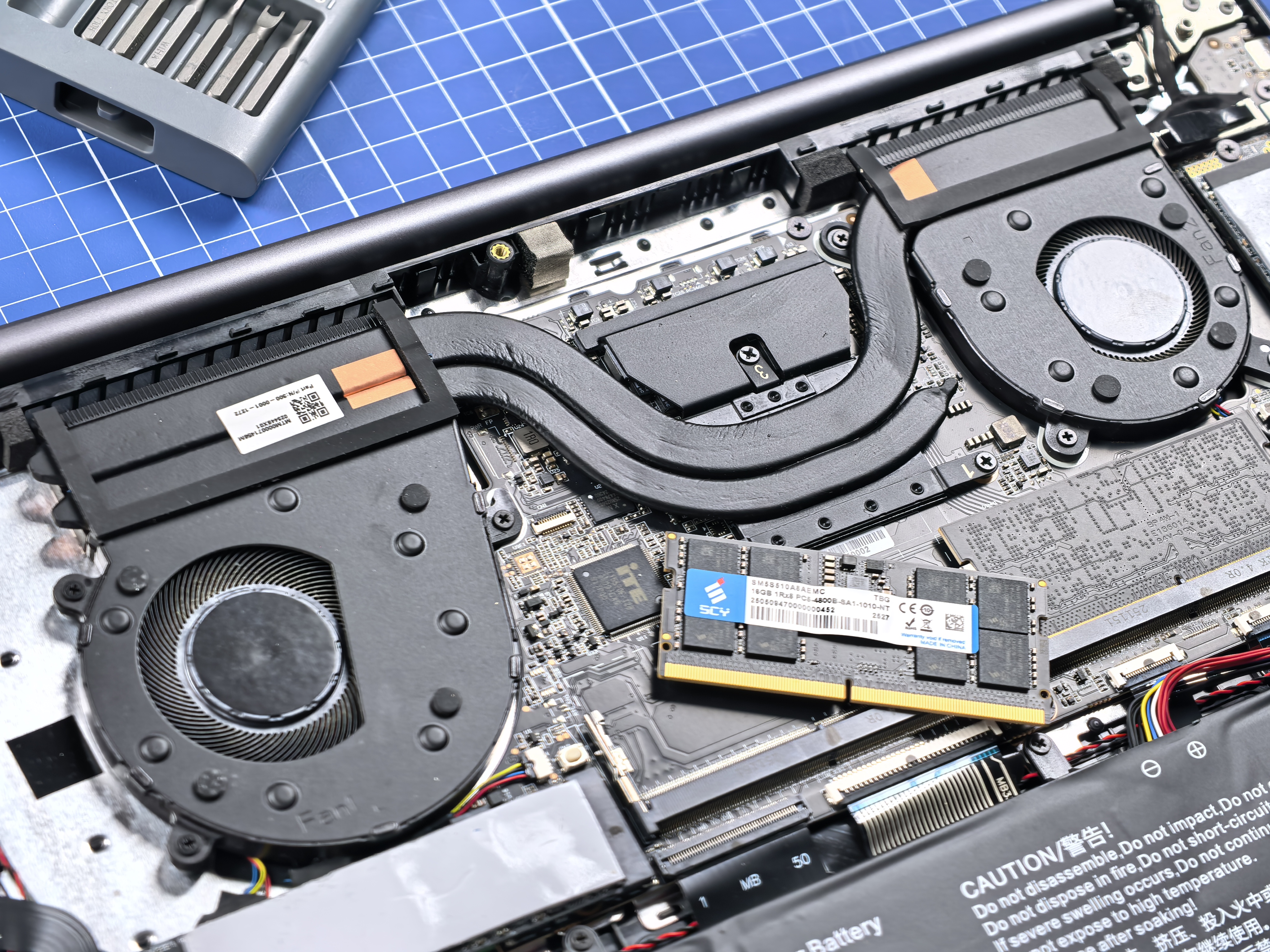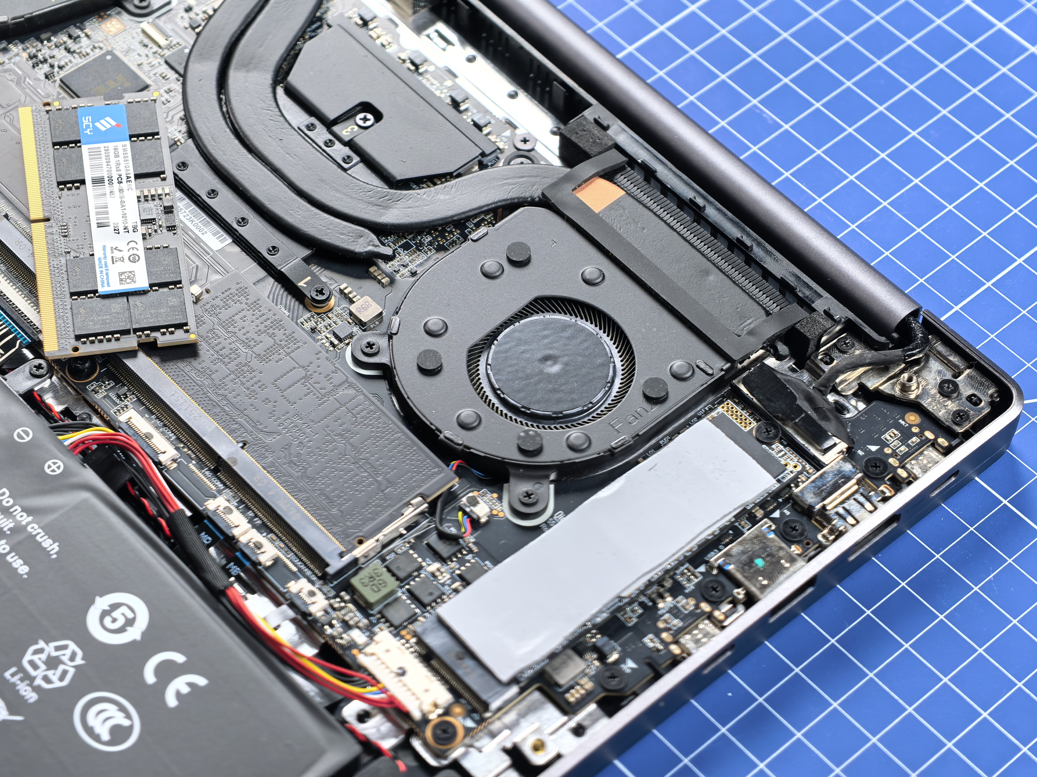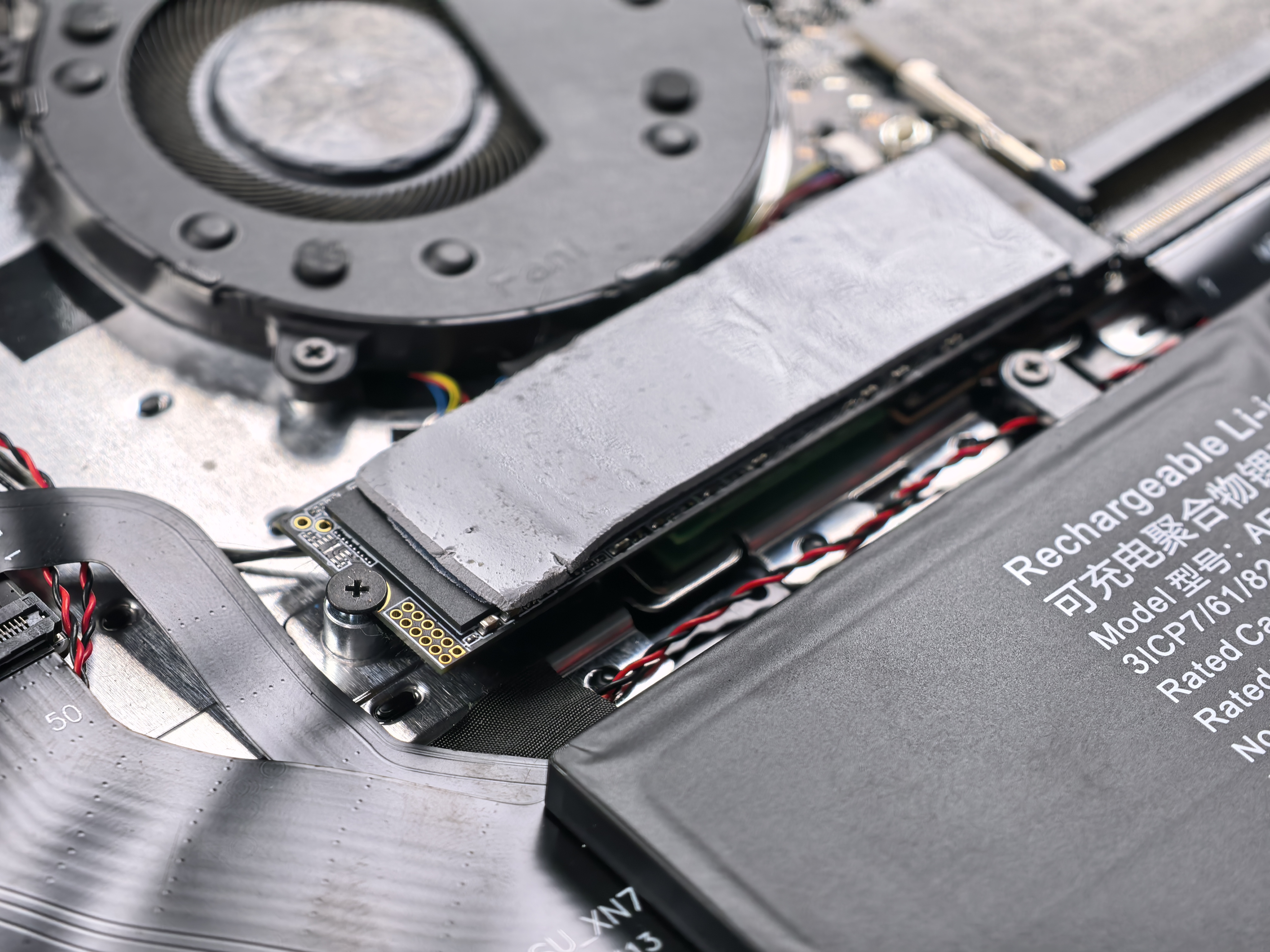 Далее по бокам на плате два NVMe PCI-E 3.0 накопителя по 1 ТБ каждый. Итого: 2 ТБ. Еще жирнее! Добавить памяти, конечно же, можно. Только сначала попробуйте забить 2 ТБ. Кстати, под одним из накопителей находится модуль беспроводной связи. Тоже заменяемый.