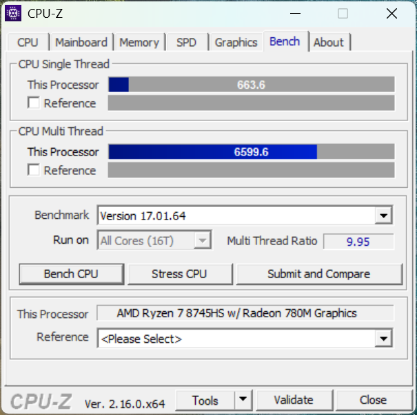 В CPU-Z процессор набирает 663.6 балла на ядро и 6599.6 баллов по всем потокам.
