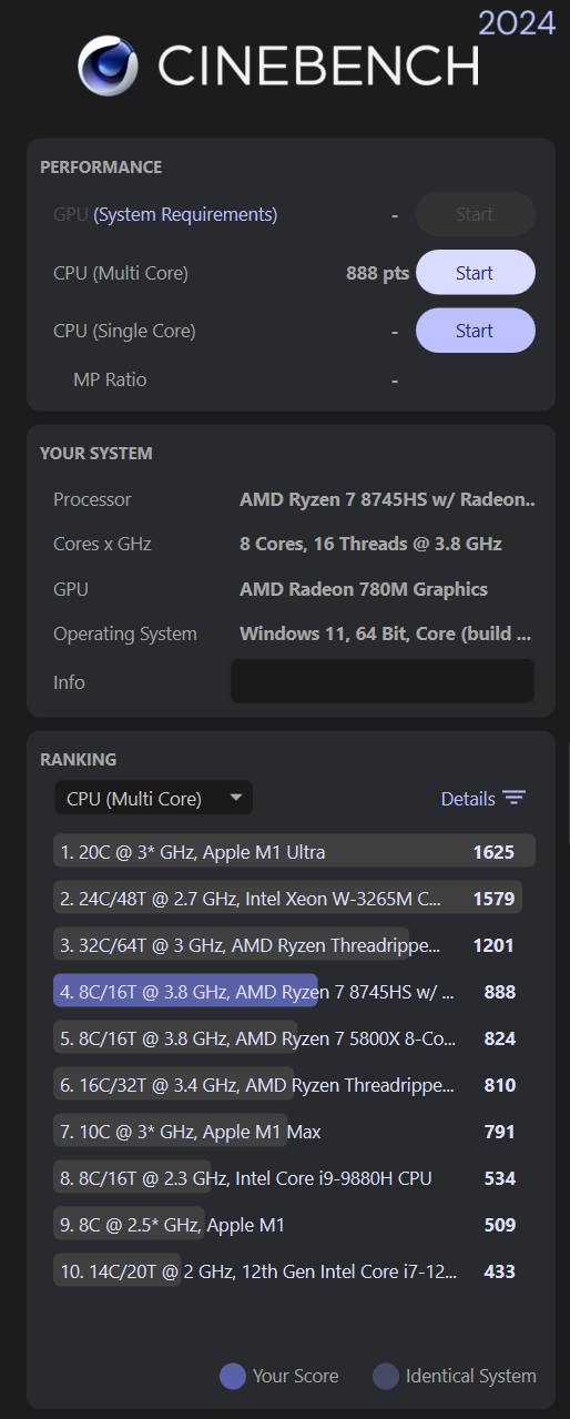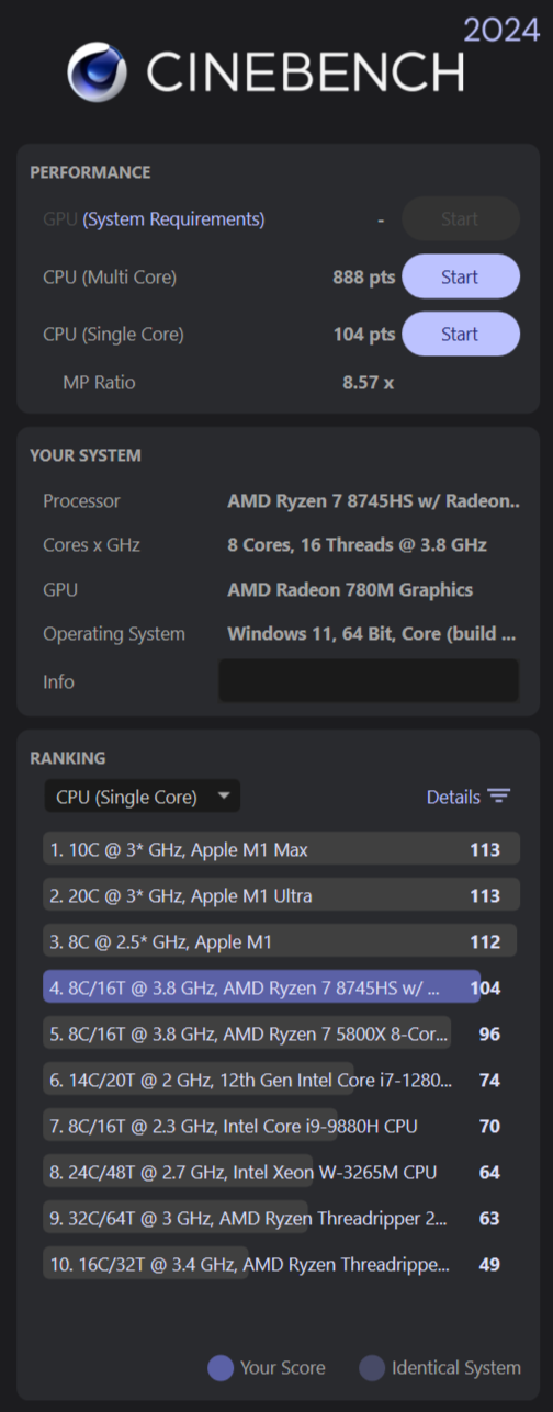 CineBench 24 дает в одноядерном тесте 104 балла и 4-ое место с уступкой призовых только камням от Apple, а многоядерный тест дает красивые 888 баллов и 4-ое место, только уже с более разнообразным пьедесталом победителей.