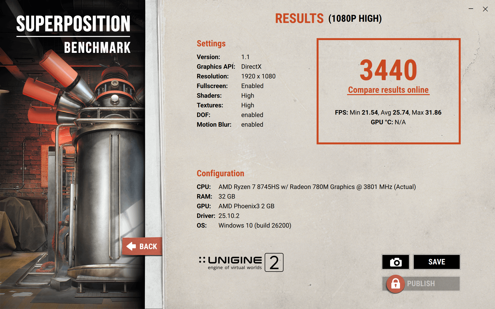SuperPosition Benchmark дает оценку 11 548 баллов со средним fps 86.38 в прогоне 720p. Значение хорошее, но уже к 1080p прогонам несколько теряется резвость прохождения. Однако, для встройки это все еще хорошие результаты.