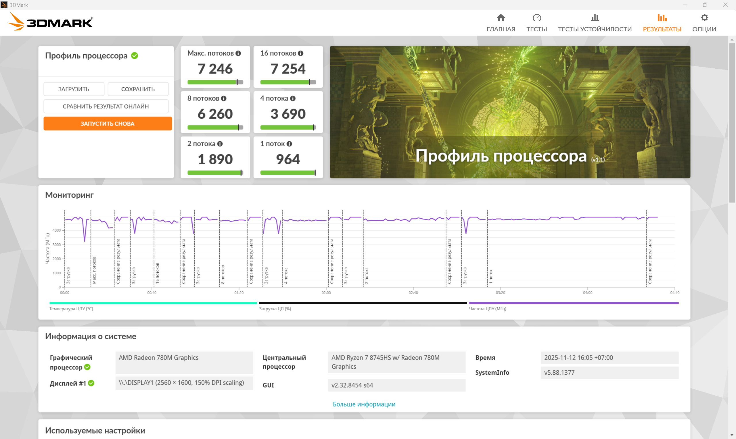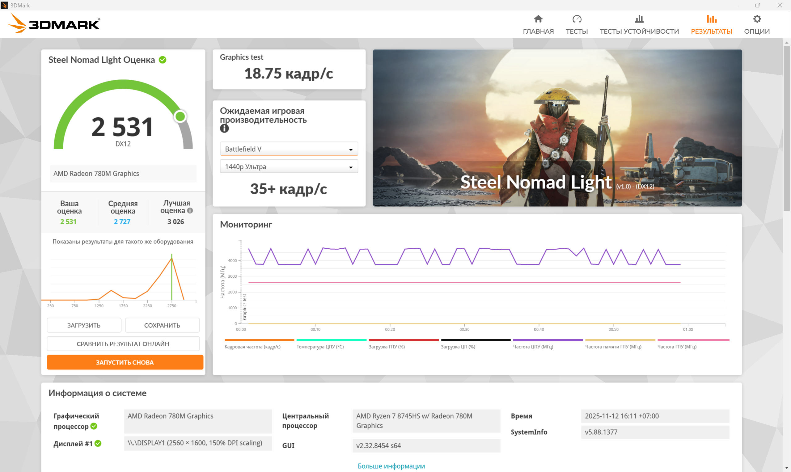 3DMark в тесте “Профиль процессора” оценивает наш 8745HS аж на 7253 балла, а графический тест Steel Nomad Light дает оценку 2531 балл, что все еще очень годно для встроенной графики и ноутбучного камня.