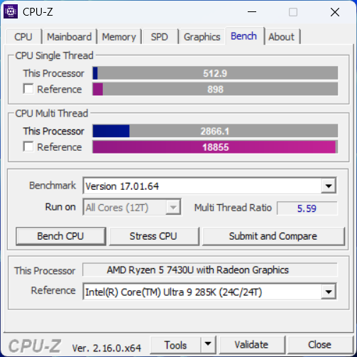 CPU-Z выдал нашему процессору Ryzen R5 7430U оценку в 512.9 балла в однопотоке и 2866.1 балла в многопоточном режиме. Поменьше, чем лэптопная реализация, но не сказать, чтобы сильно хуже.