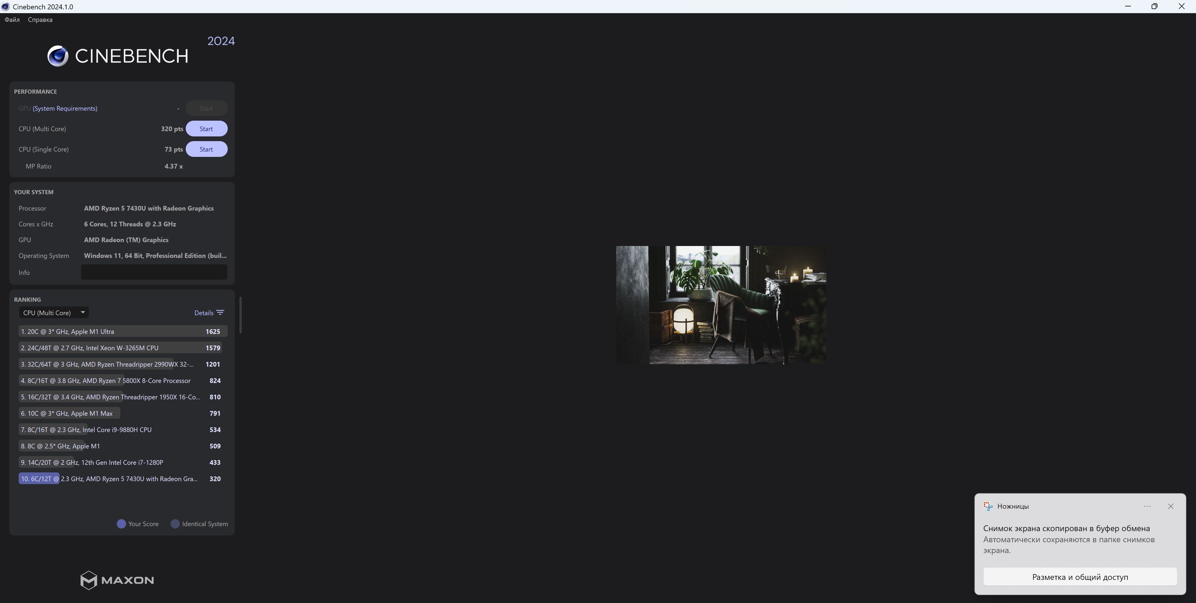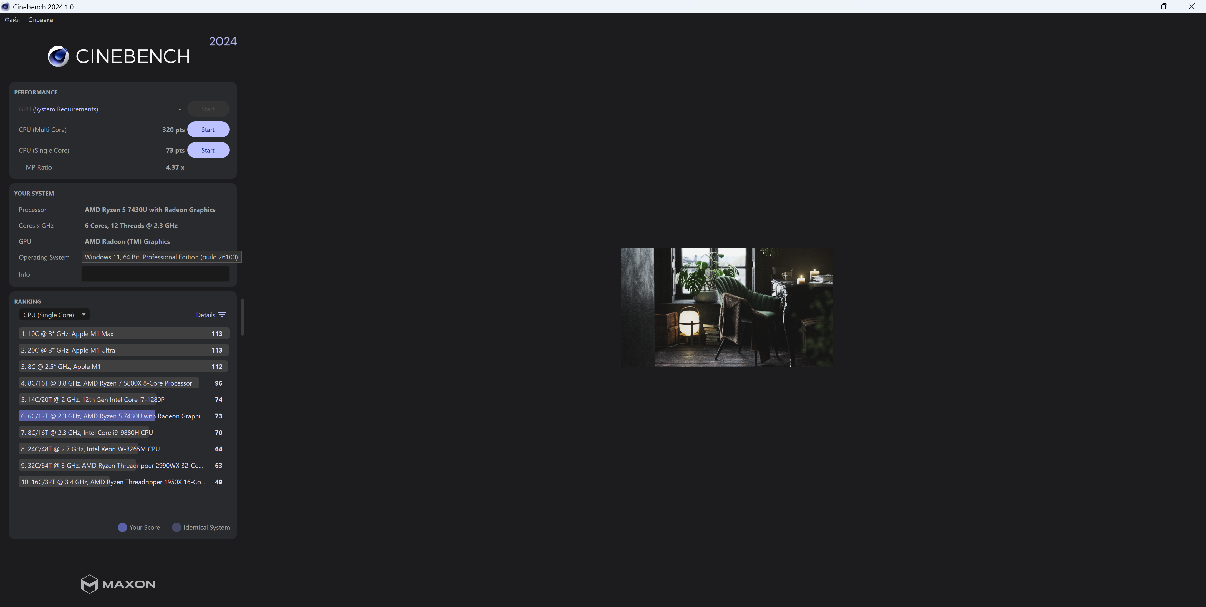 CineBench24 выдал 73 балла за однопоточный рендеринг и 320 – за многопоток. Опять же чуть отстаем от лэптопа, который выдал 75 и 356 баллов соответственно, но разница все еще небольшая.