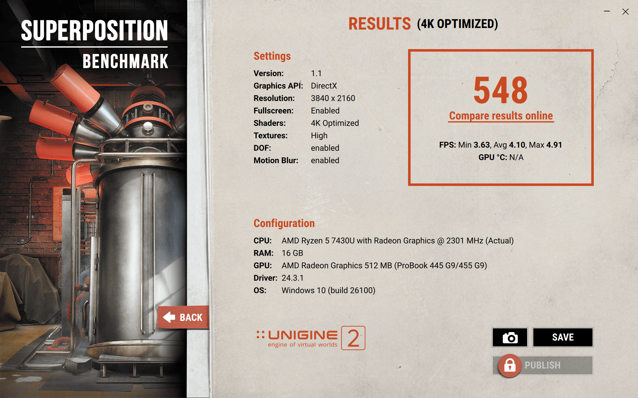 SuperPosition Benchmark показал нормальный результат в 720p, но дальше пошло слайд-шоу. Впрочем, как и ноутбучного собрата. Мини-ПК даже чуть вырвался вперед, если смотреть по баллам: 4090 против 4083 у ноутбука в сцене 720p.