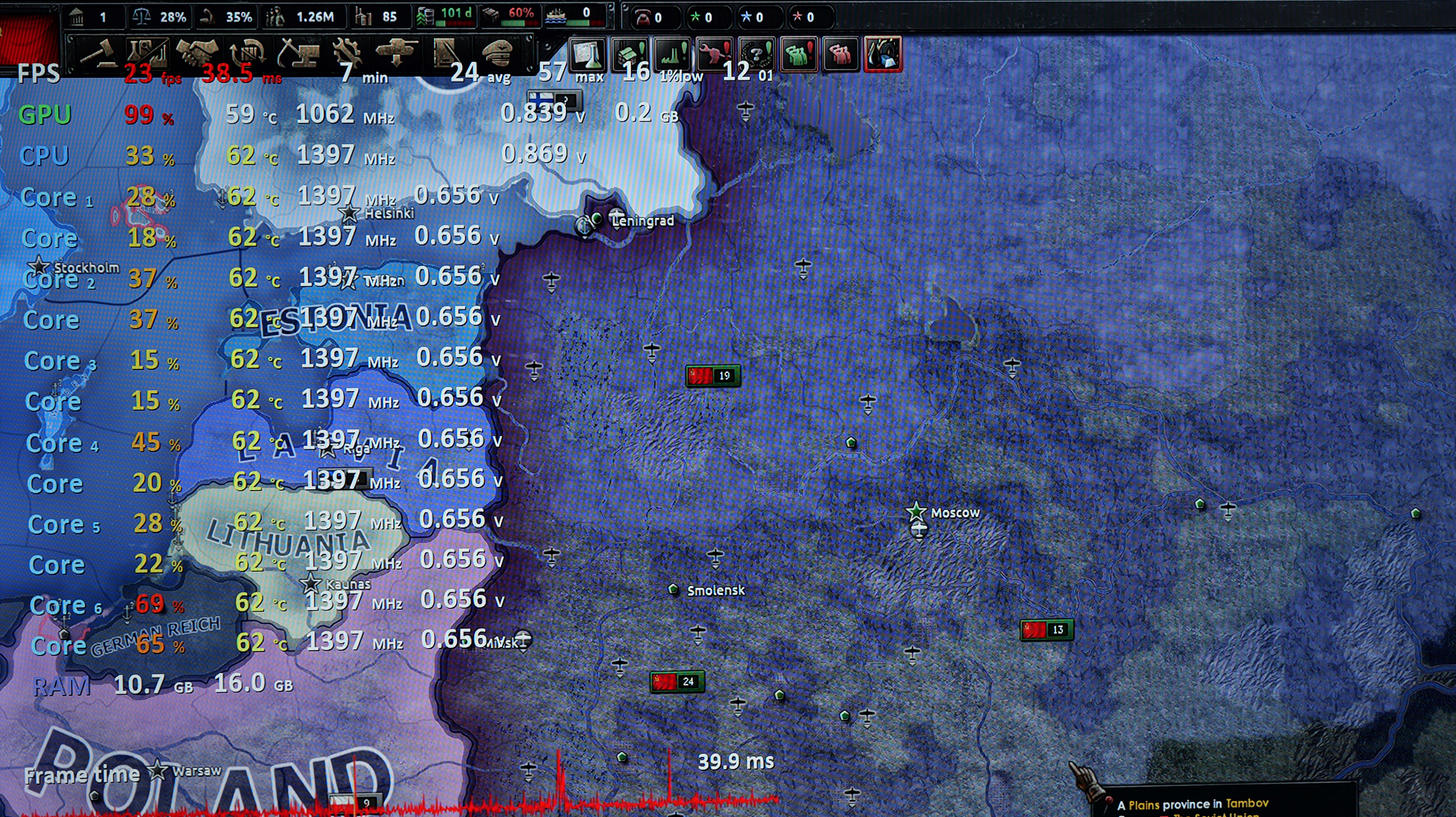 Hearts of Iron IV, как представитель стратегии, в которую можно покатать на диване: FullHD разрешение и 30-40 кадров. Если убрать “рендеринг высокого разрешения”, то картинка сильно размывается, но частота упирается в 60 fps. Тут дилемма: либо играть на FullHD без битой картинки, либо пожертвовать качеством самой картинки ради высокого разрешения, которое теперь без проблем повышается до 1440p. Думайте.