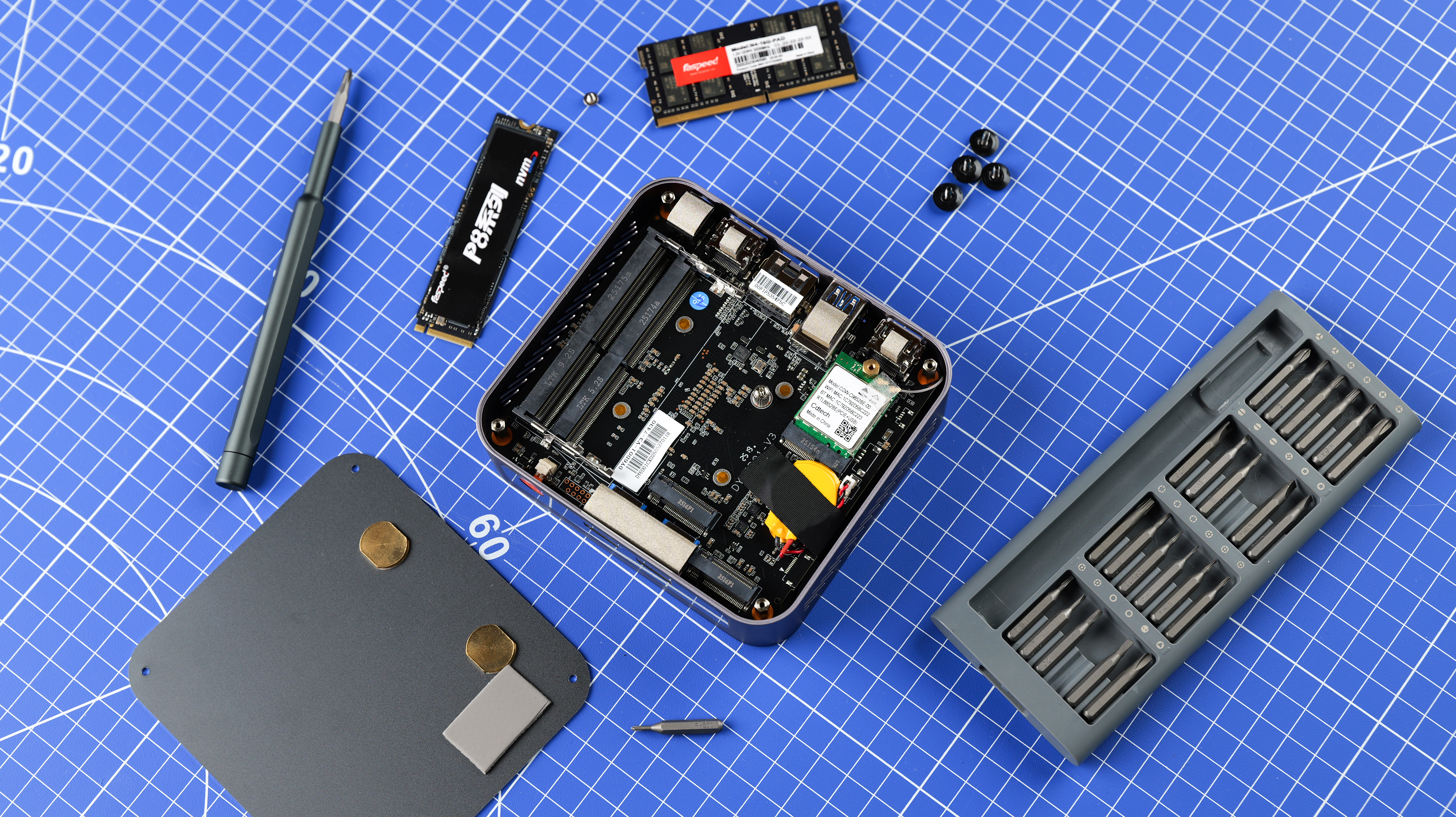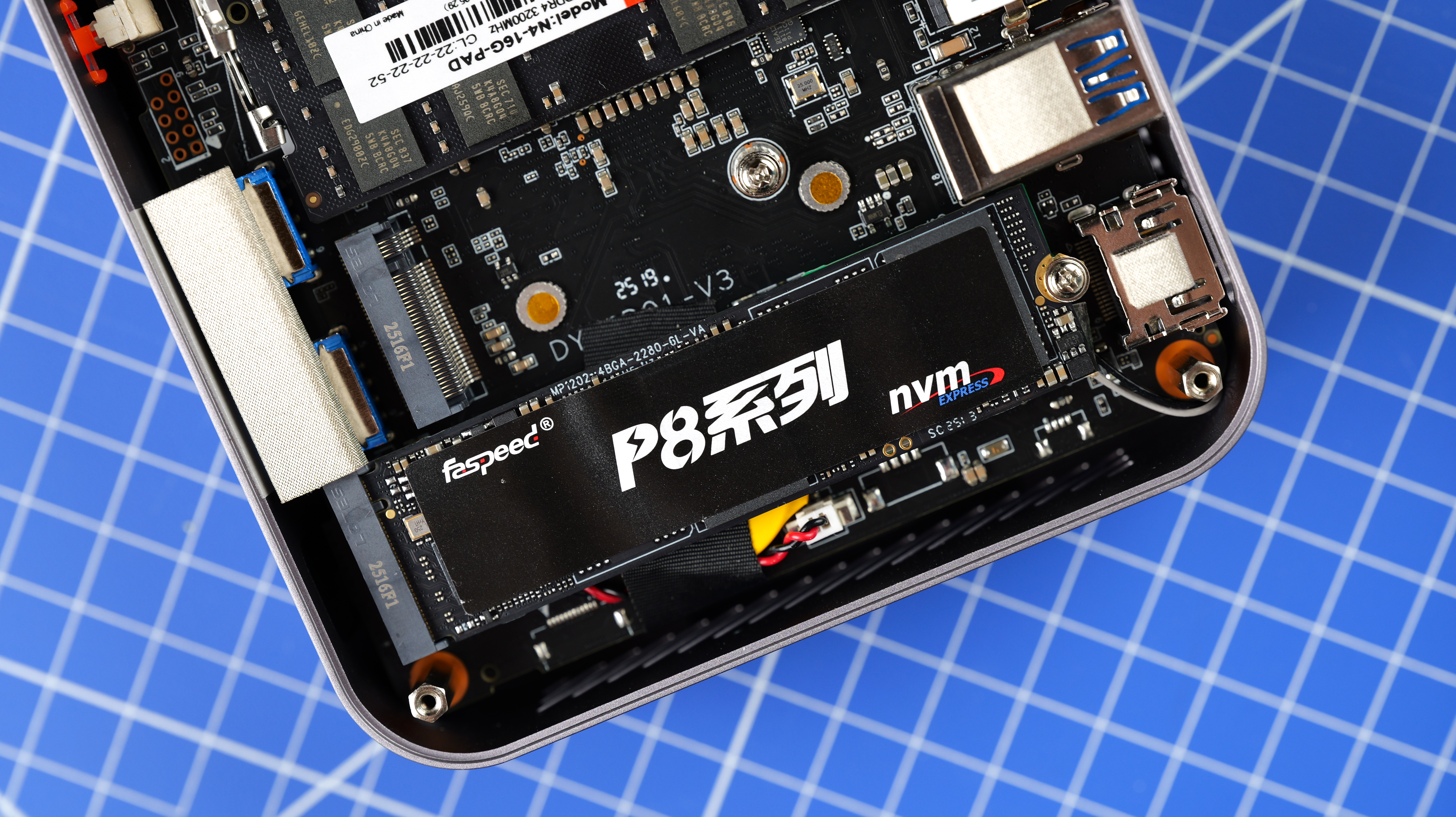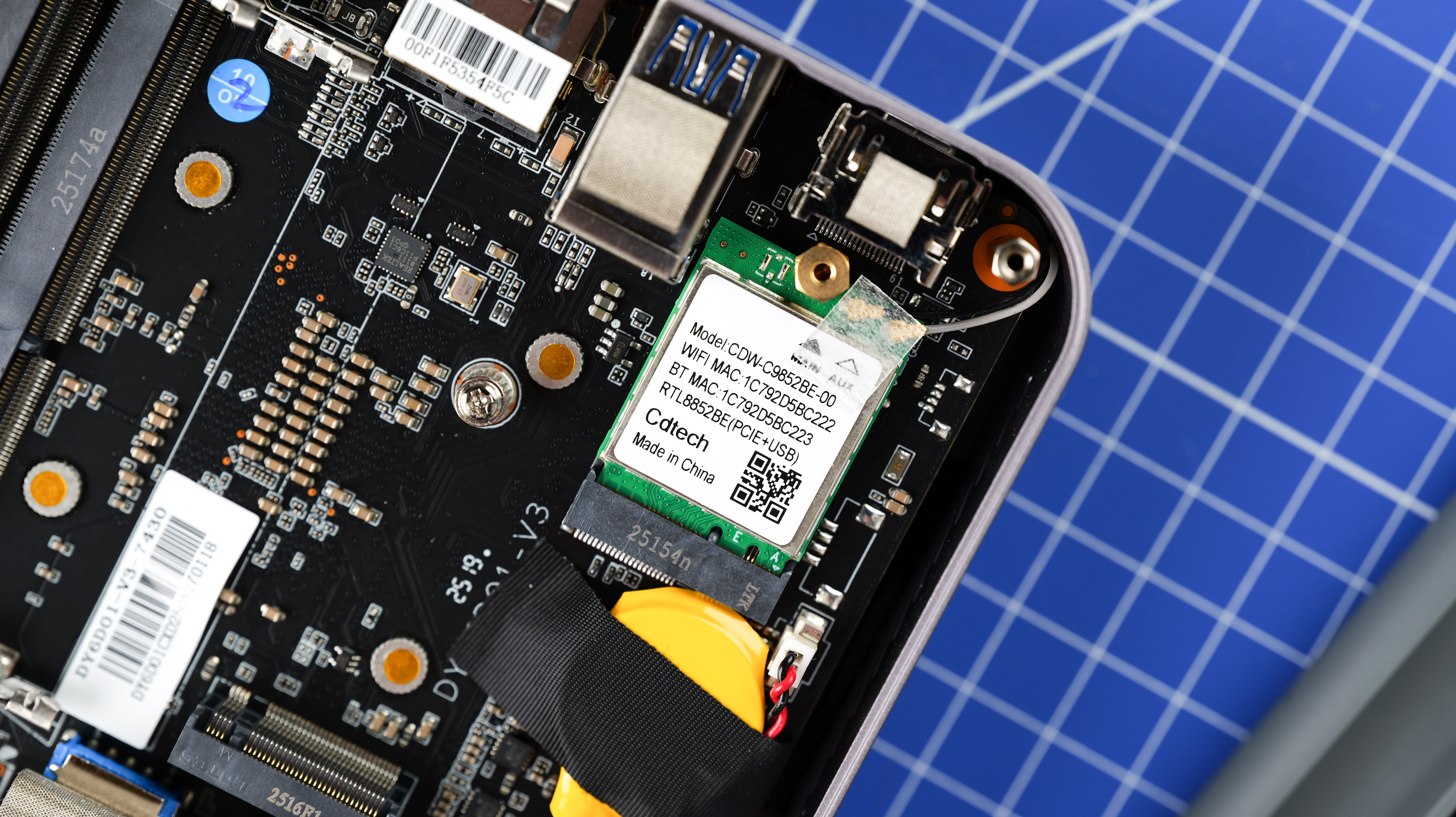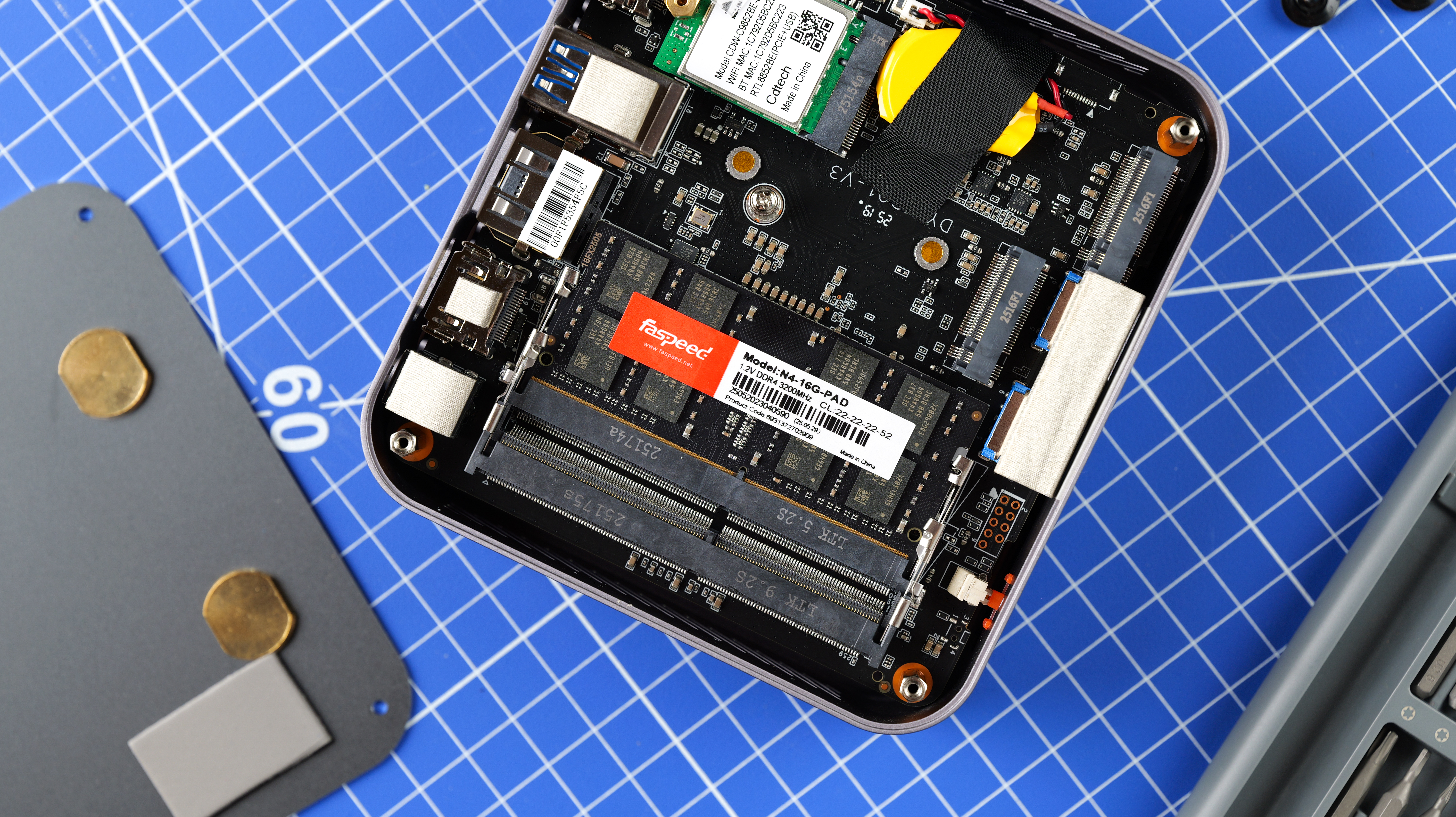 А давайте снимем крышку и посмотрим, как все же удается собрать целый ПК в такой коробочке. Нижняя крышка держится на четырех болтах – снимаем ее и видим крохотную, но аккуратную элементную базу с потенциалом на будущее. DDR4 память, которой нам тут положили 16 ГБ одной плашкой с частотой 3200 МГц, легко заменяется по щелчку пальцев. SSD накопитель тоже съемный, но не в этом даже красота: рядом с ним распаян еще один слот под SSD формата 2242. Так что необязательно заменяться – можно просто добавить еще плашку!