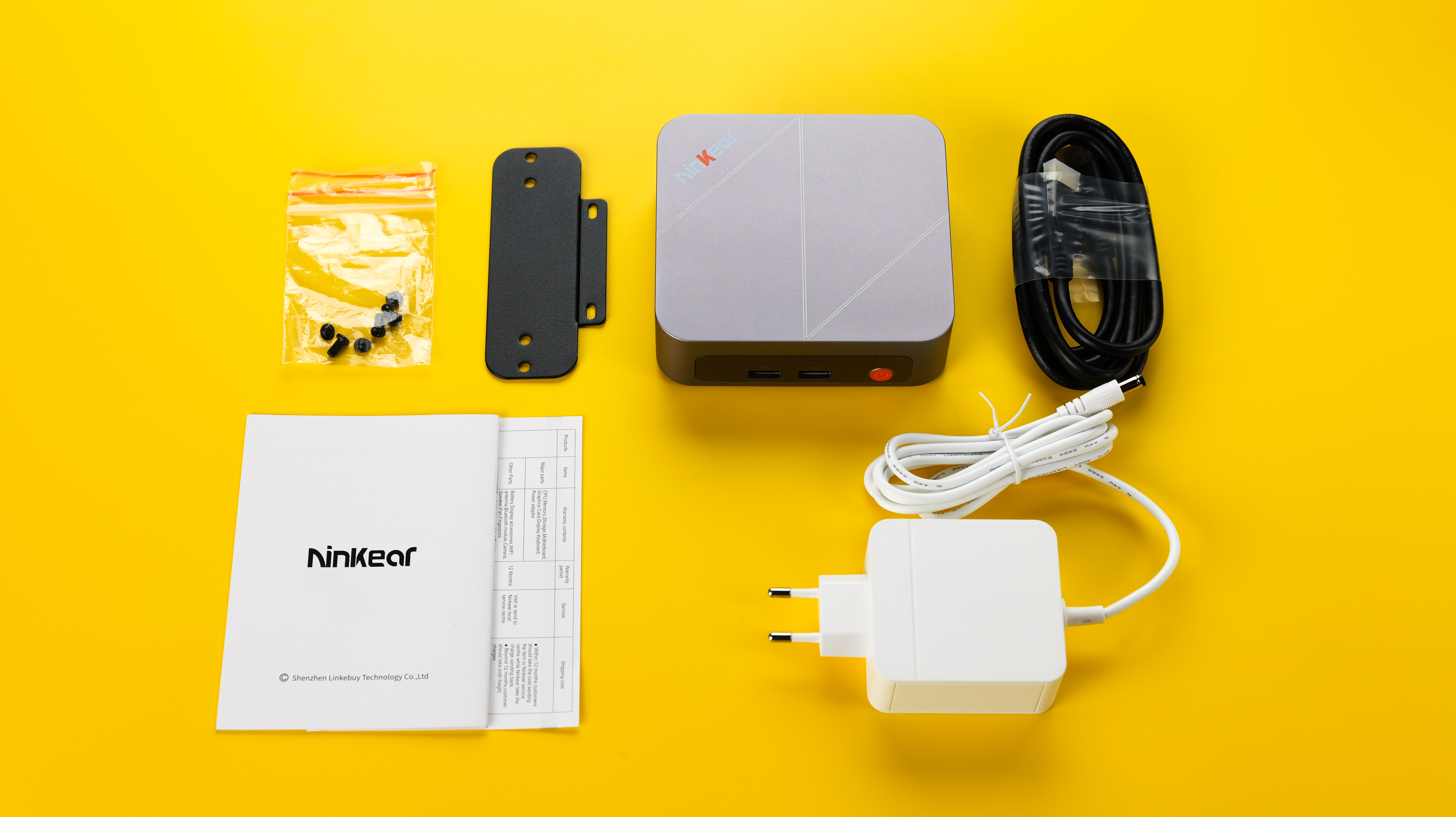 Ninkear M7 поставляется в аккуратной черной коробочке. Сравнимой с упаковкой лапши БигБон. Полный комплект состоит из мини-ПК, проприетарного блока питания на 65 Вт, документации, HDMI-кабеля и кронштейна для крепления на вертикальные поверхности. Плюсом еще идет набор болтиков. Остается только приткнуться к ближайшему монитору и подключить хотя бы мышь.