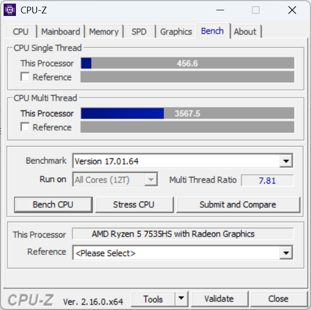 CPU-Z выдает оценку процессору в 456.6 балла по одному ядру и 3567.5 балла в режиме Multi Thread.