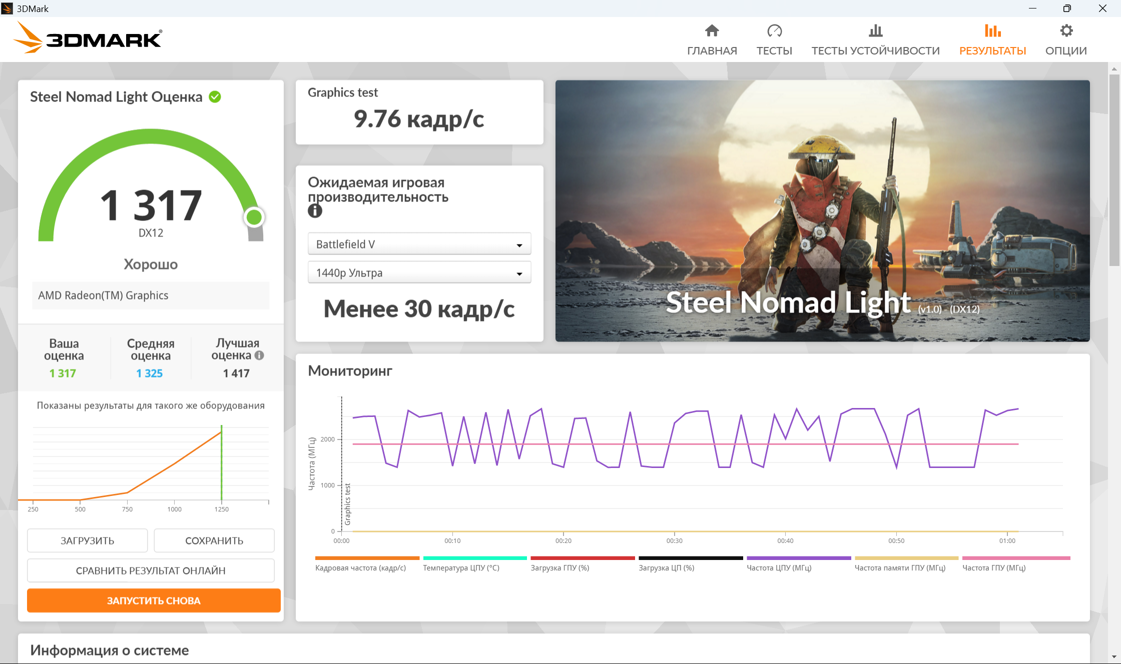 3DMark в графике Steel Nomad Light (для встроек юзаю только Light-версию) дал оценку 1317 баллов, написав нам похвальное “хорошо”. Но в условный Battlefield 5 мы уже не поиграем. “Профиль процессора” оценивает эффективность потоков в 4029 баллов и 644 балла за один поток. График частот вроде бы и ровный, но все норовит показать сброс частот, хотя процессор быстро возвращается в свой “боевой режим” выше 3.0 ГГц.