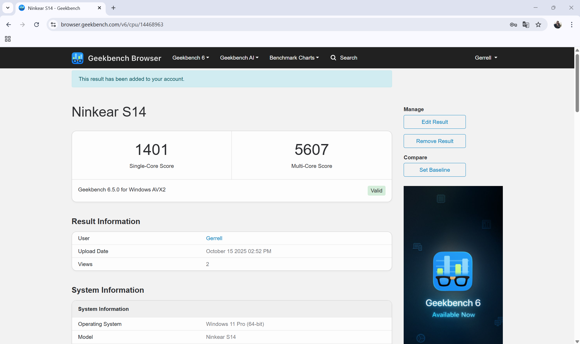 GeekBench 6 показал попугайный результат по потокам в 1401 балл на ядро и 5607 баллов на все ядра.