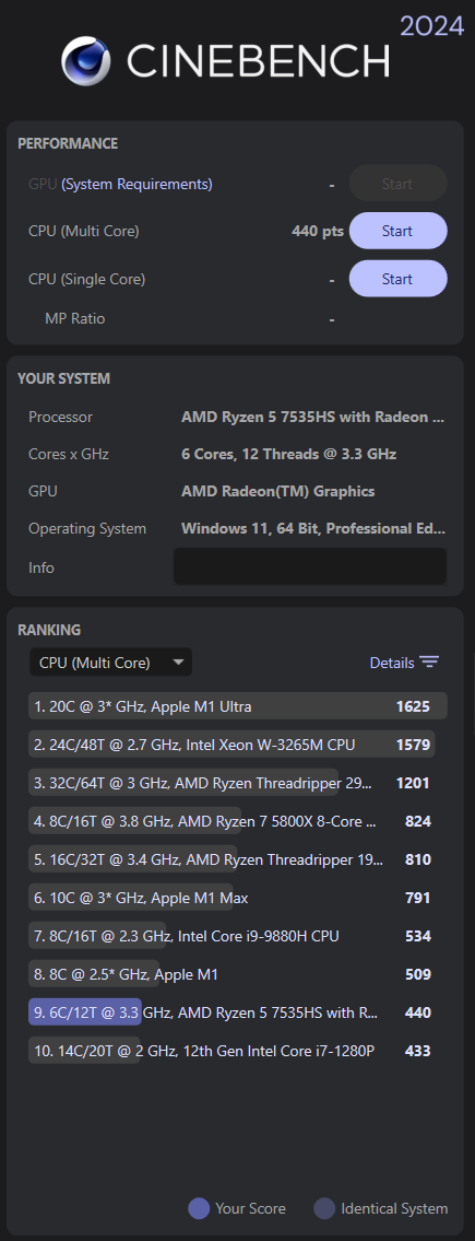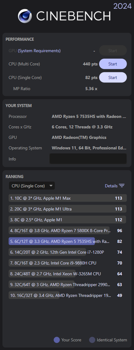 CineBench 24 оценивает производительность на ядро в 82 балла, ставя процессор на 5-ое место. Однако, MultiCore уже приопускает нас на 9-ое место, давая 440 баллов оценки.