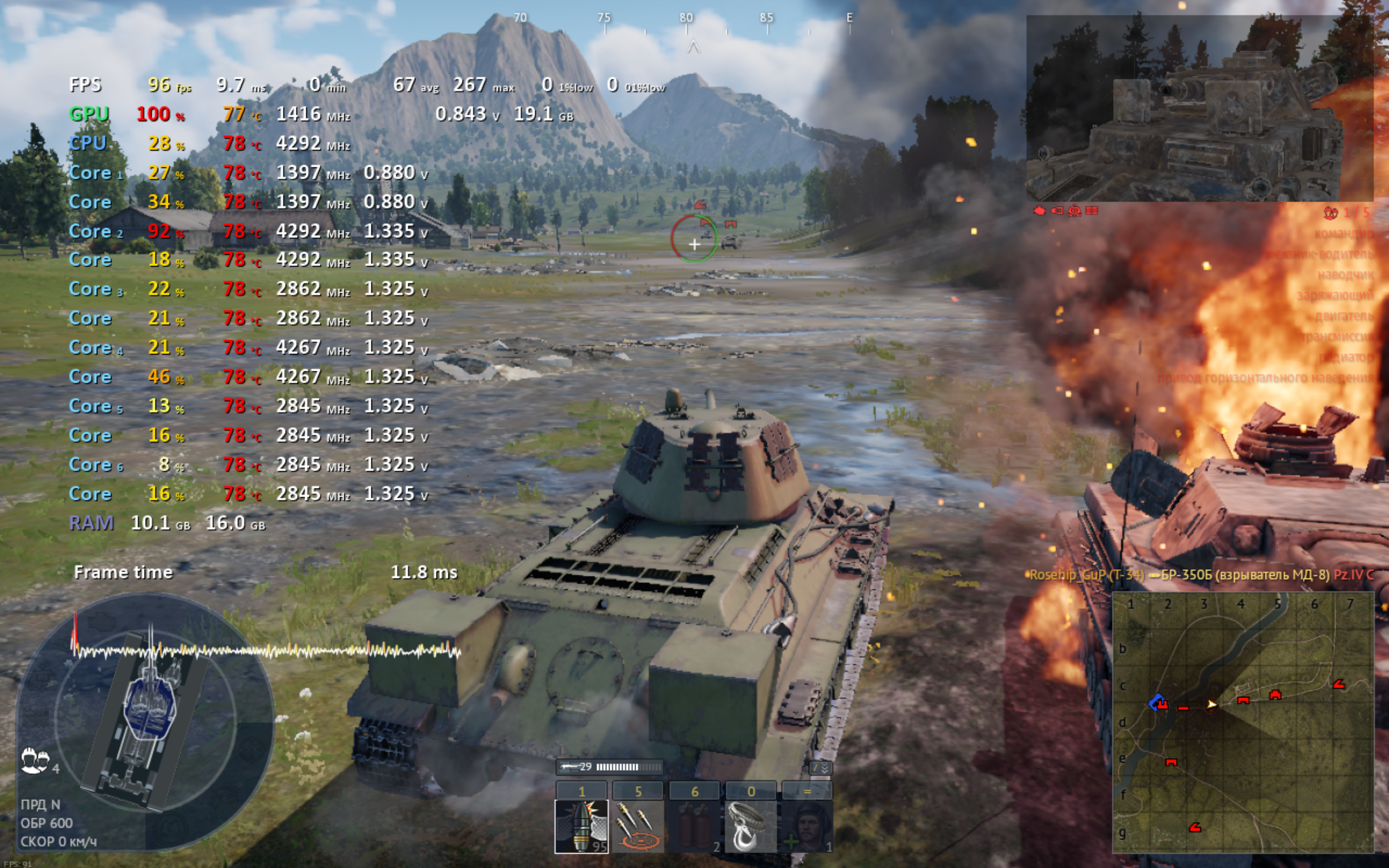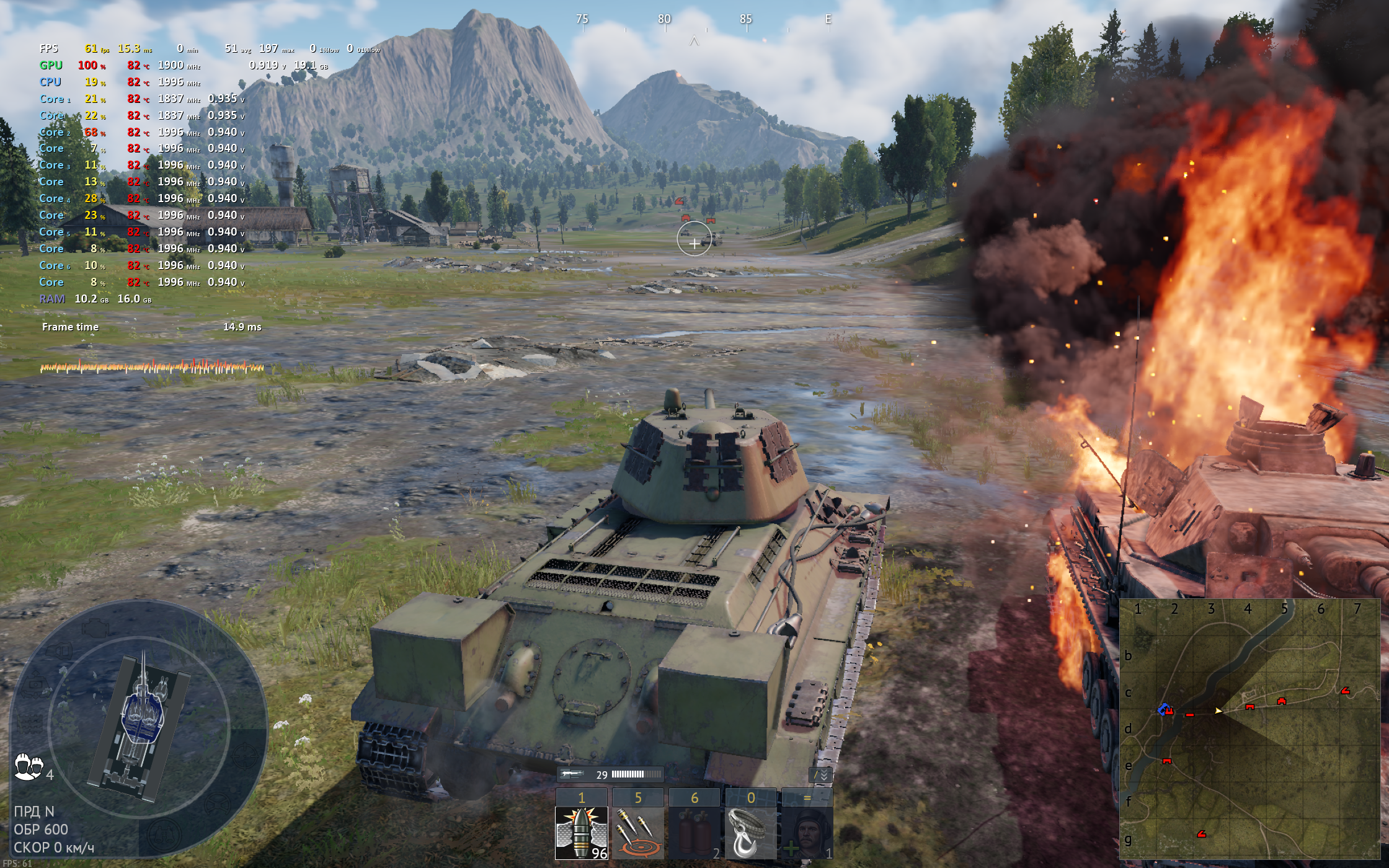 WarThunder на минимальных настройках в родном разрешении радует 60 кадрами. Но при взрыве машины на полигоне есть микрофриз. Думаю, это устраняется со временем, когда после одного-двух боев в кэш подгружаются все нужные модели. Но кому мало 60 кадров – снизьте разрешение до 800p и катайте в 90-120! Тоже вариант, хоть и сверхмыльный.