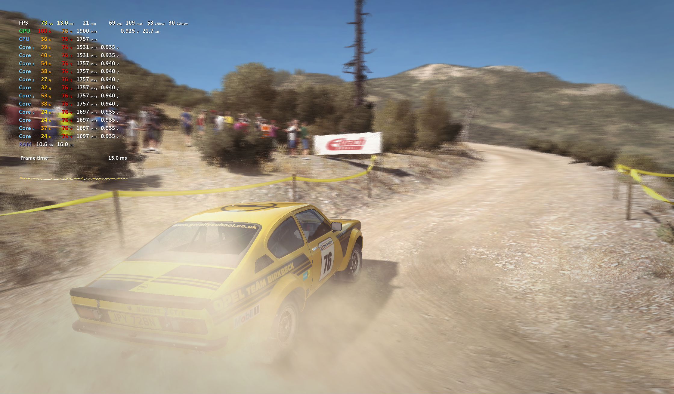 Сегодня сделаю отступление от уже поднадоевшей GTA V и зайду в DiRT Rally – тоже 15-ый год выхода, как никак. И в родном разрешении на средних настройках, но без улучшенного тумана получаем очень даже играбельные 60-80 кадров. Ну не сказка ли? Правда, туман я так и не смог включить: падение катастрофическое, аж до 10-20 кадров. Так что гоняем по грязи без тумана. Но все еще красиво!