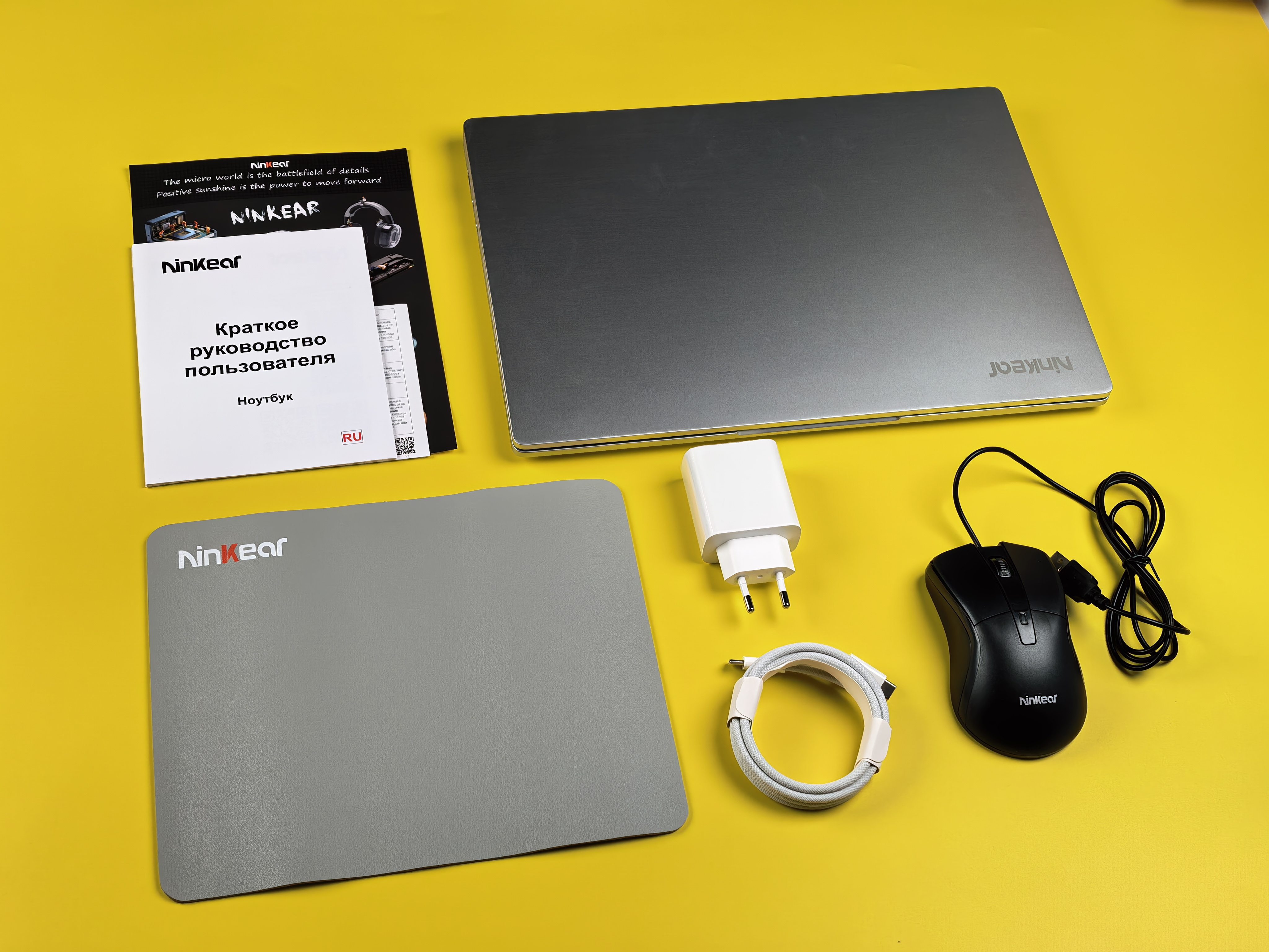 Я уже тысячу раз похвалил Ninkear за бережность упаковки (даже пленки на тачпады наклеивают!), а теперь похвалю еще и за чувство вкуса: посмотрите, как на этот раз к нам приехал ноутбук! Бело-оранжевая коробочка на магните, в которой уместились ноутбук, зарядка USB-C, документация и подарочные стикеры! Маленький приятный бонус. Который, кстати, не исключает стандартного бонуса в виде мышки и коврика, лежащих в отдельной коробке!