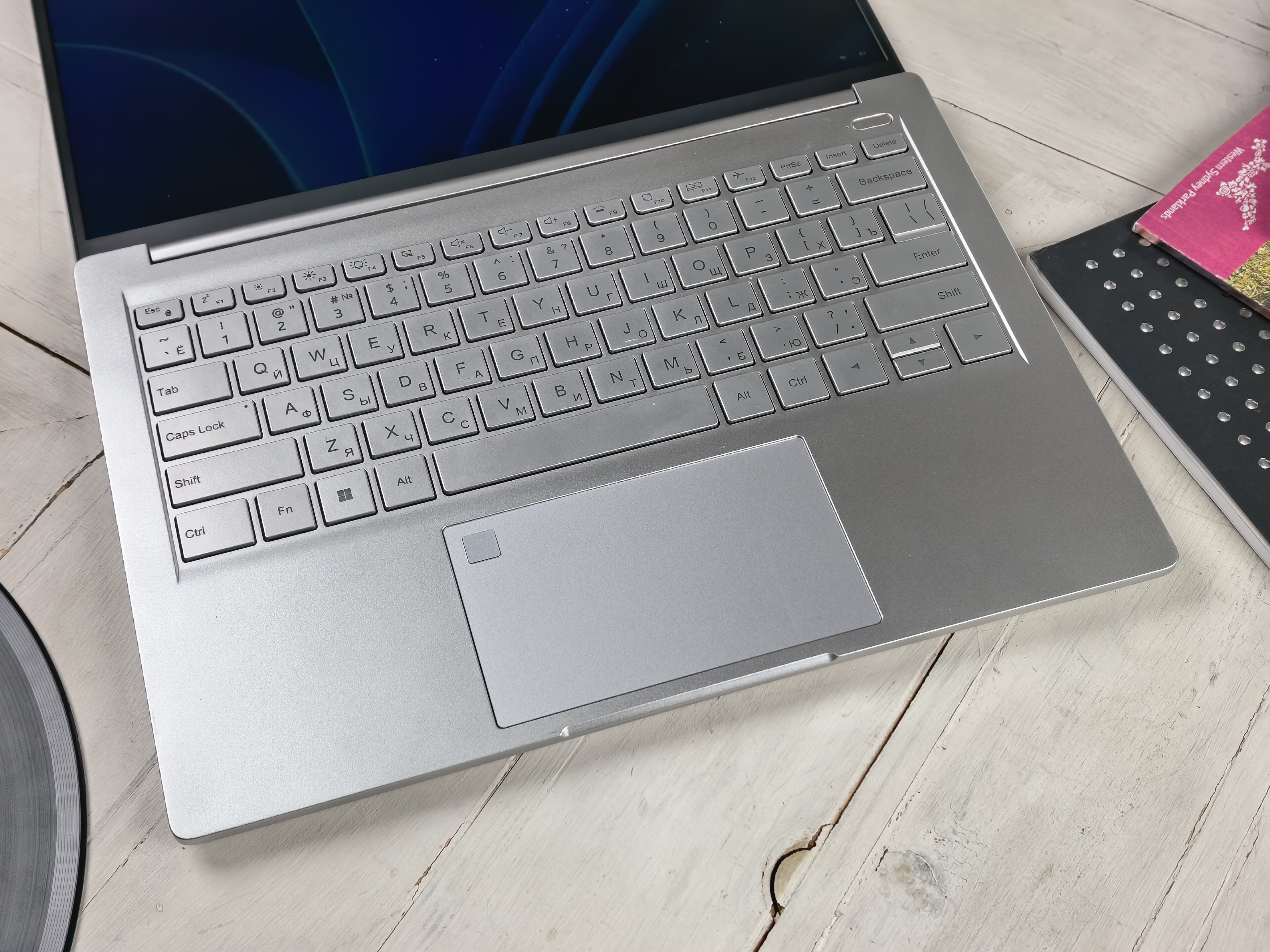 Открываем крышку (раскрытие на 180° кстати) и видим довольно стандартную клавиатуру без нампада, маленький пластиковый тачпад с выделенным дактилоскопом и, что я, кстати, постоянно забываю похвалить – шарнирную базу по центру, а не по краям ноутбука. Я часто сталкивался с такой проблемой, как треск и поломка пластиковых крышек шарниров на бюджетках, и тут Ninkear поступают очень правильно, пряча крепления под одну общую деталь.