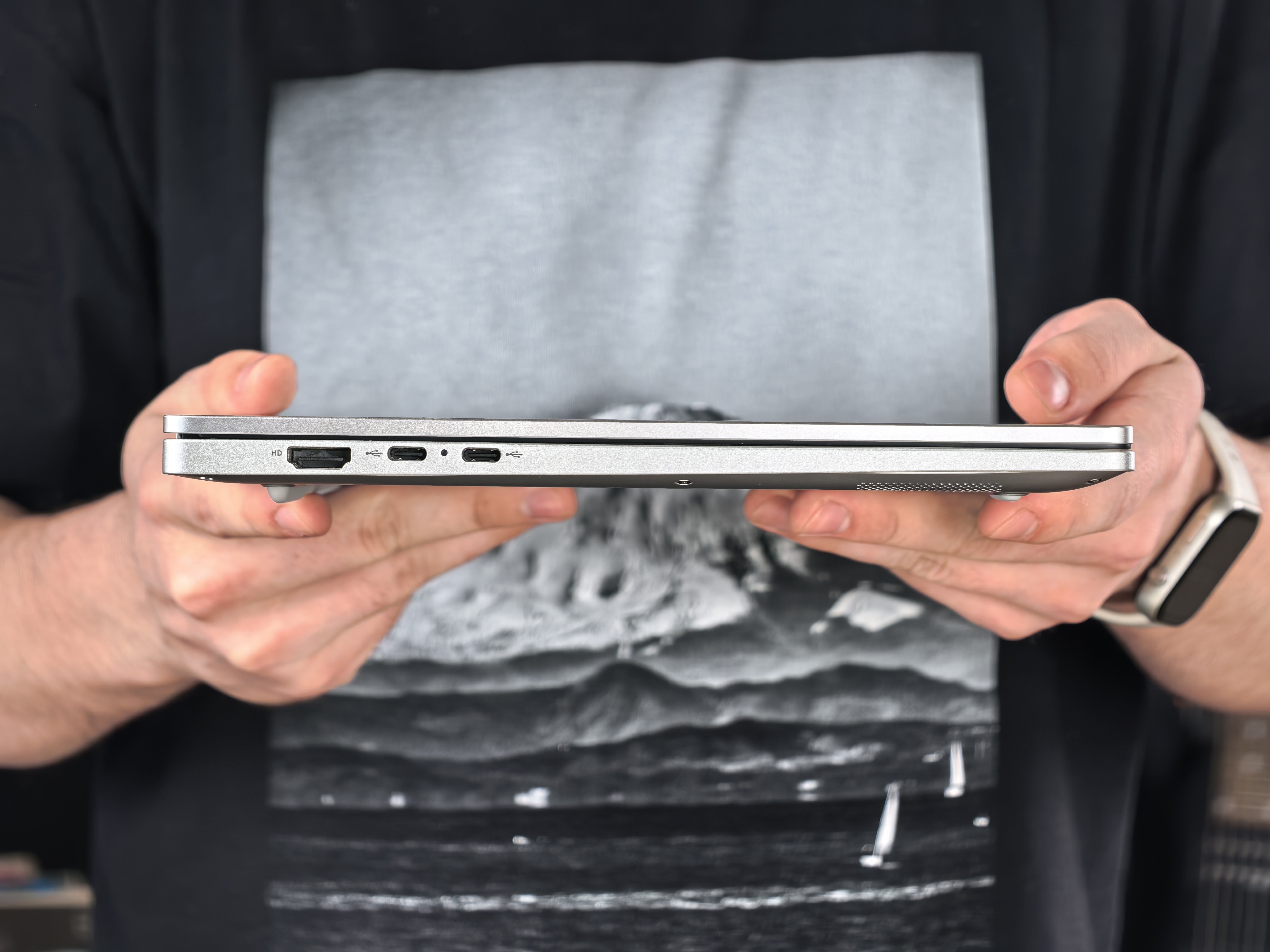 Пробежимся еще по интерфейсам: слева видим два USB-C 3.2 и HDMI 2.1 для вывода картинки на внешний монитор. USB-C посередине ряда еще принимает зарядку. С правой стороны у нас находятся USB-A 3.0, еще один USB-C и 3.5-мм разъем. Можно сказать, что мало, но если учесть класс устройства – сверхкомпакт может вмещать еще меньше, уж поверьте мне. Хотя да, мне лично не хватило еще одного USB-A старовер я, уж извините.