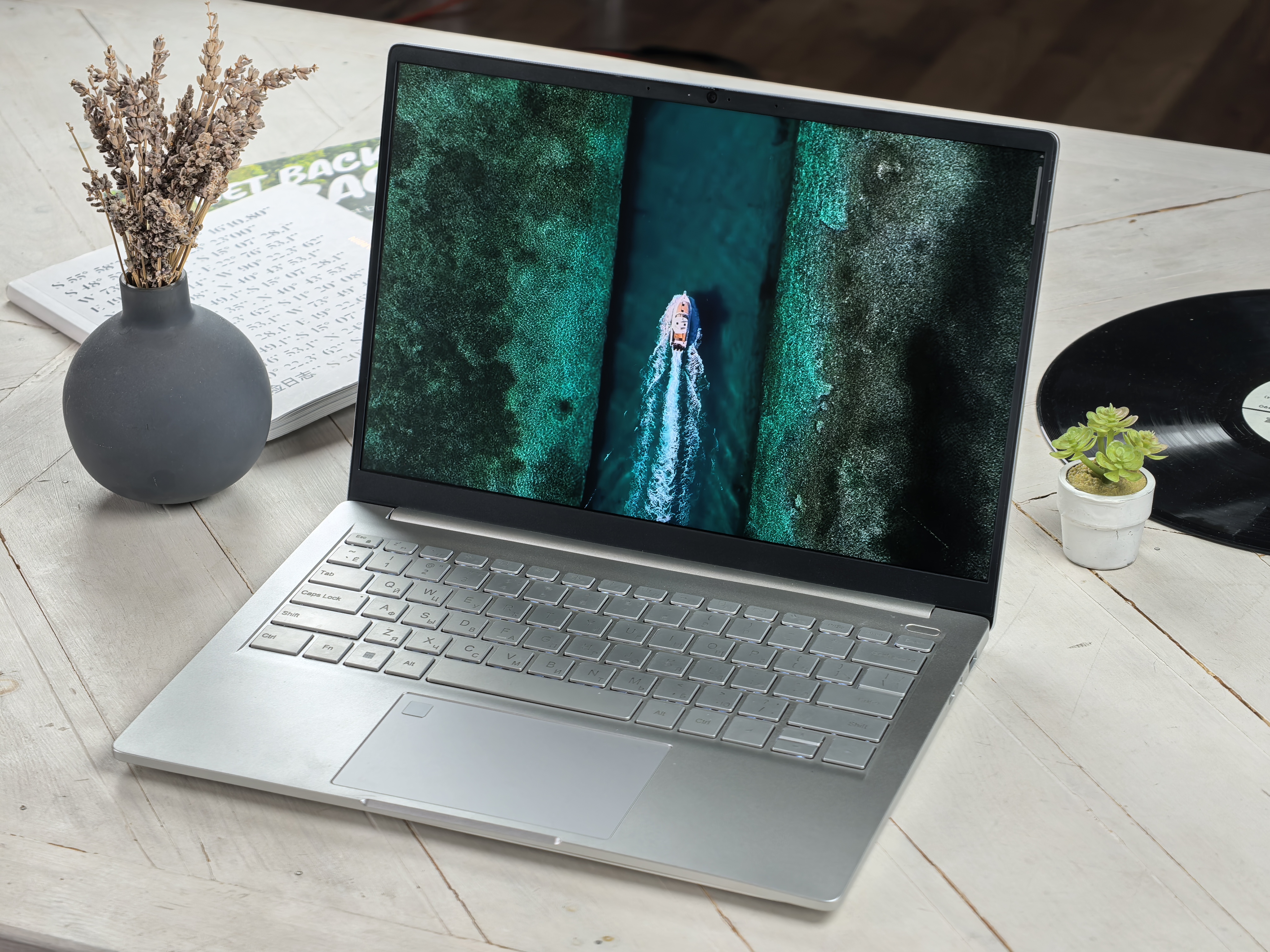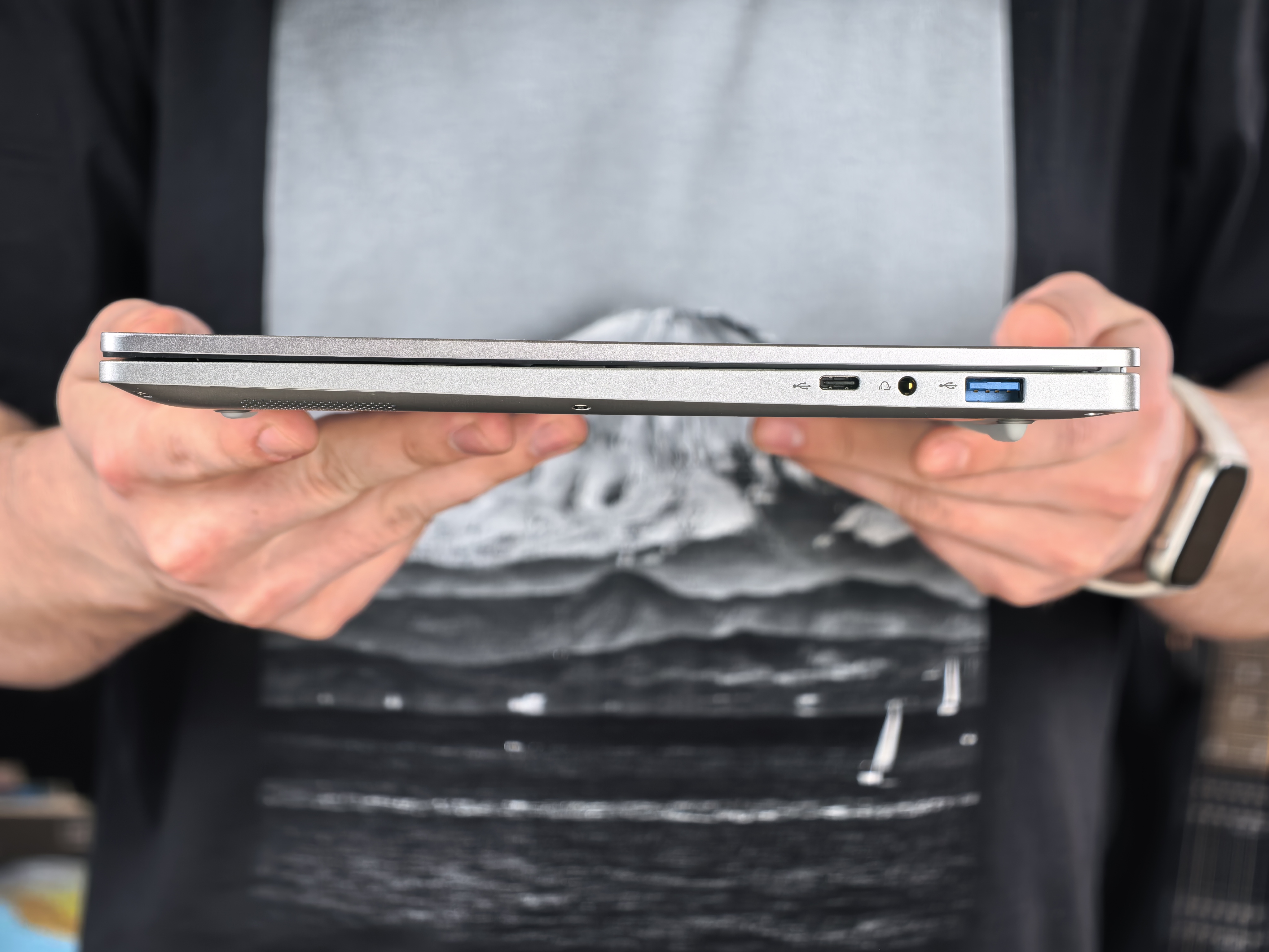 Ну и давайте сразу экран чекнем. Уже заметна стандартная схема в черной рамке и камере сверху, но в каждом аспекте есть плюсики. Рамки тоненькие, камера на 0.9 Мп хоть и очевидно бюджетная, но закрывается (привет параноикам), а сам экран очень большой в плане разрешения: 2240 на 1400 точек! 2K на 14” я, может, уже видал, но не в сегменте до 80к. Правда, яркость тут средненькая, 400 нит по паспорту (я намерил до 394), но ее очень даже хватает при работе в помещении. А цвета он не искажает – покрытие sRGB 100%.
