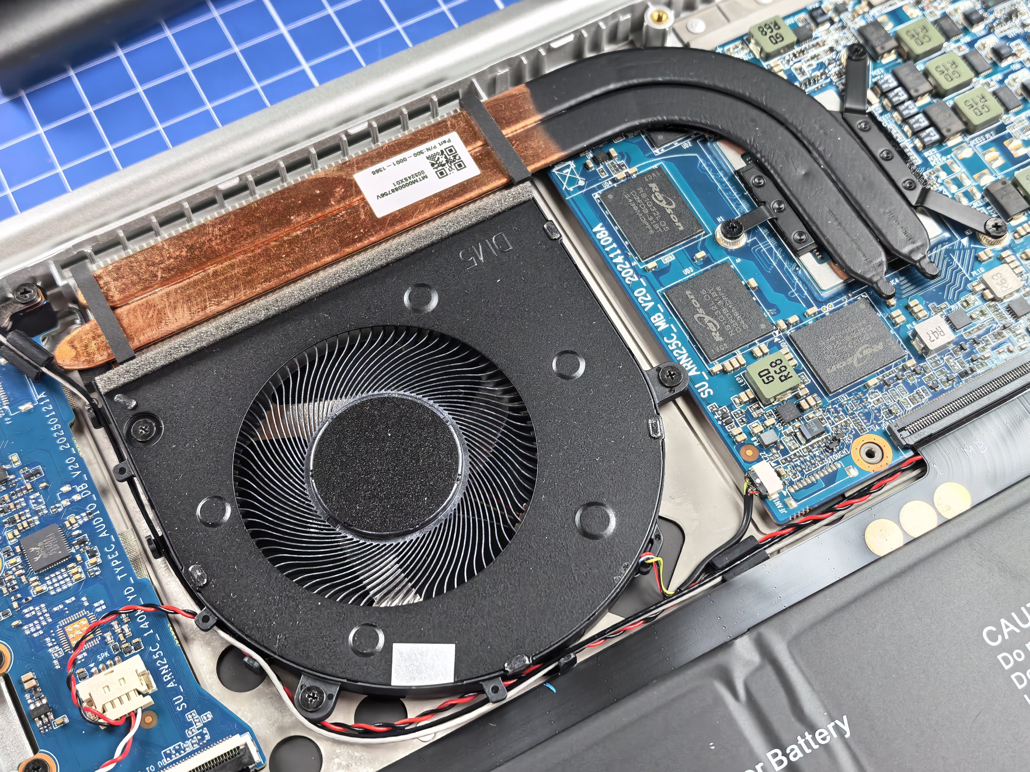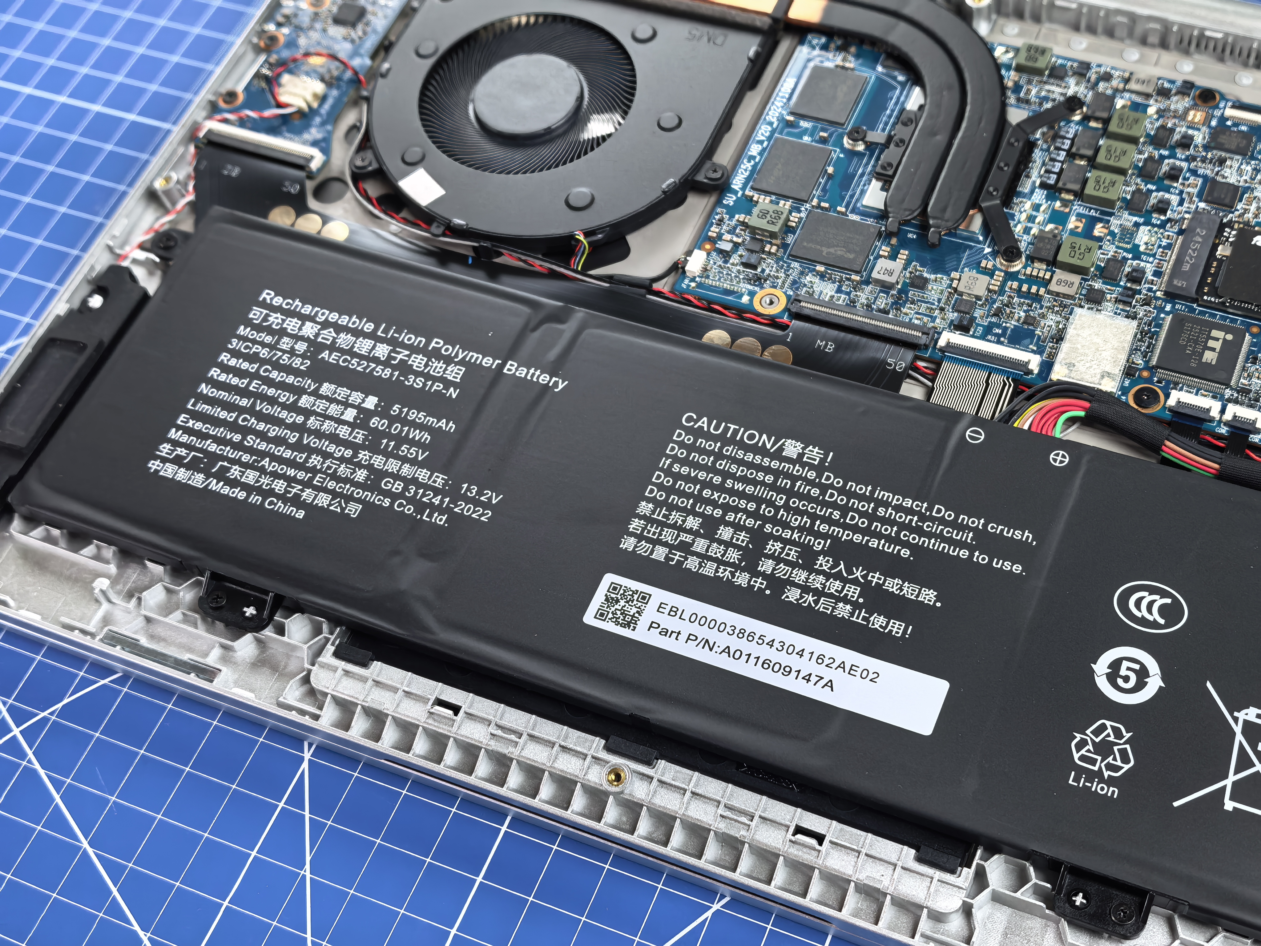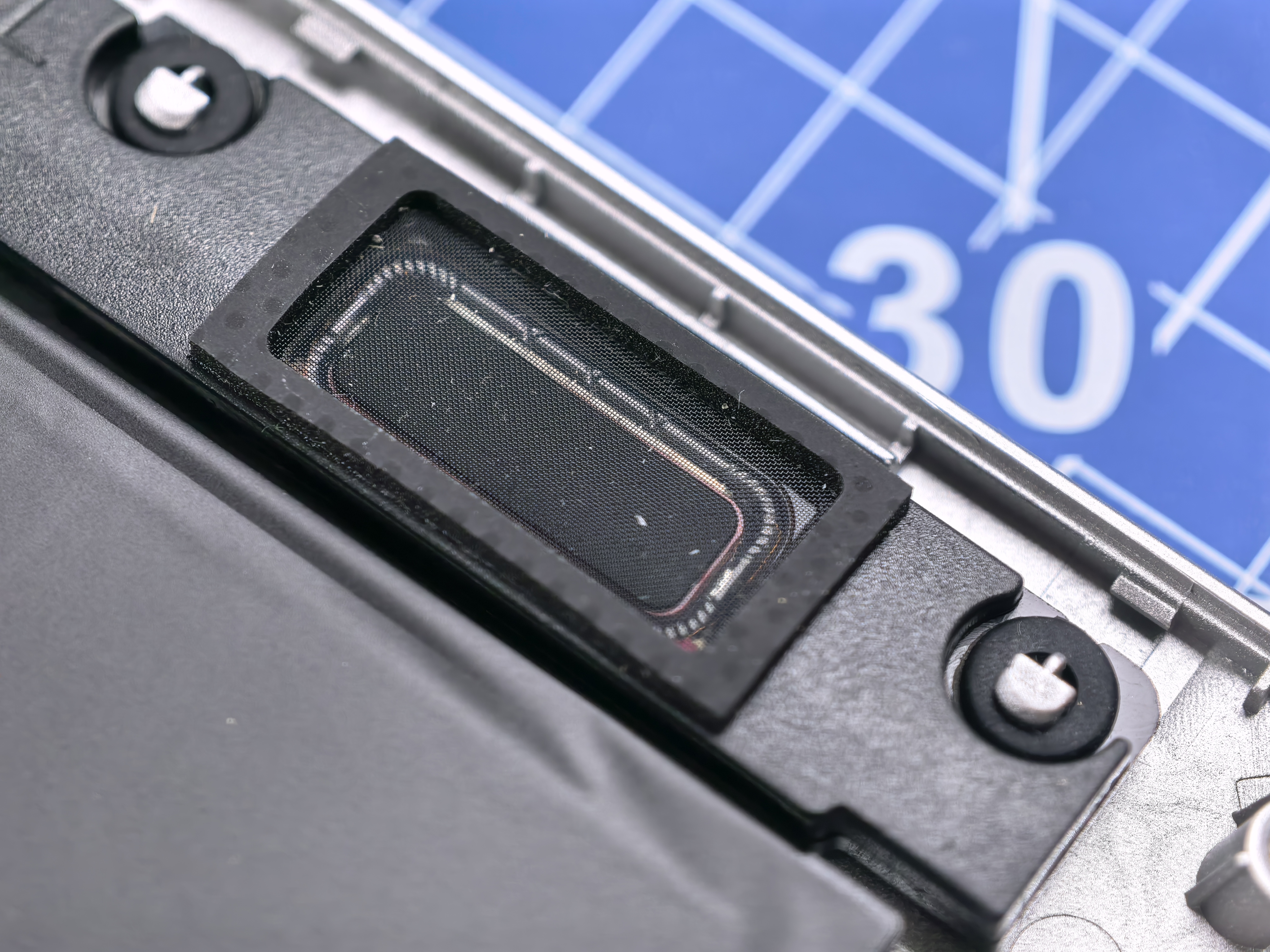 Охлаждение идет по двум тепловым трубкам к одному кулеру, который во время работы не шумит и не раздражает. Ну и батарея на 60 Втч из трех секций довершает эту картину – очень хорошая и емкая для своего класса батарея. Ну и, конечно, динамики вживую – вот они, по бокам от батареи.