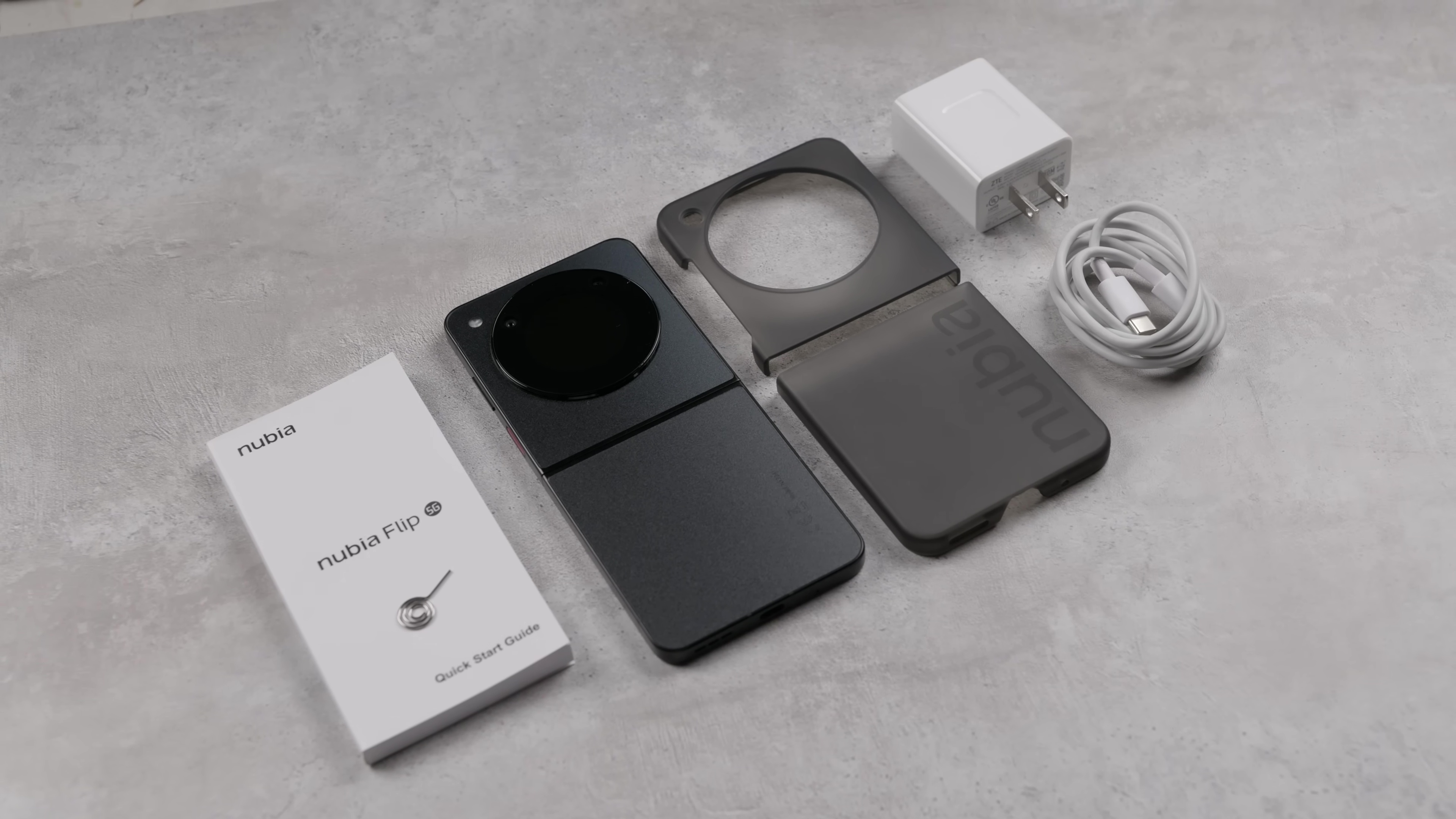 На коробке есть всякие предупреждения о том, что можно и что нельзя делать с раскладным девайсом – так у всех производителей. В комплекте блок питания на 33 Вт (почему-то с азиатской вилкой), кабель, бумажки, иголка SIM и пластиковый кейс из двух половинок с софт-тач покрытием и надписью NUBIA. На внешнем дисплейчике защитной пленки нет, но внутри она присутствует.