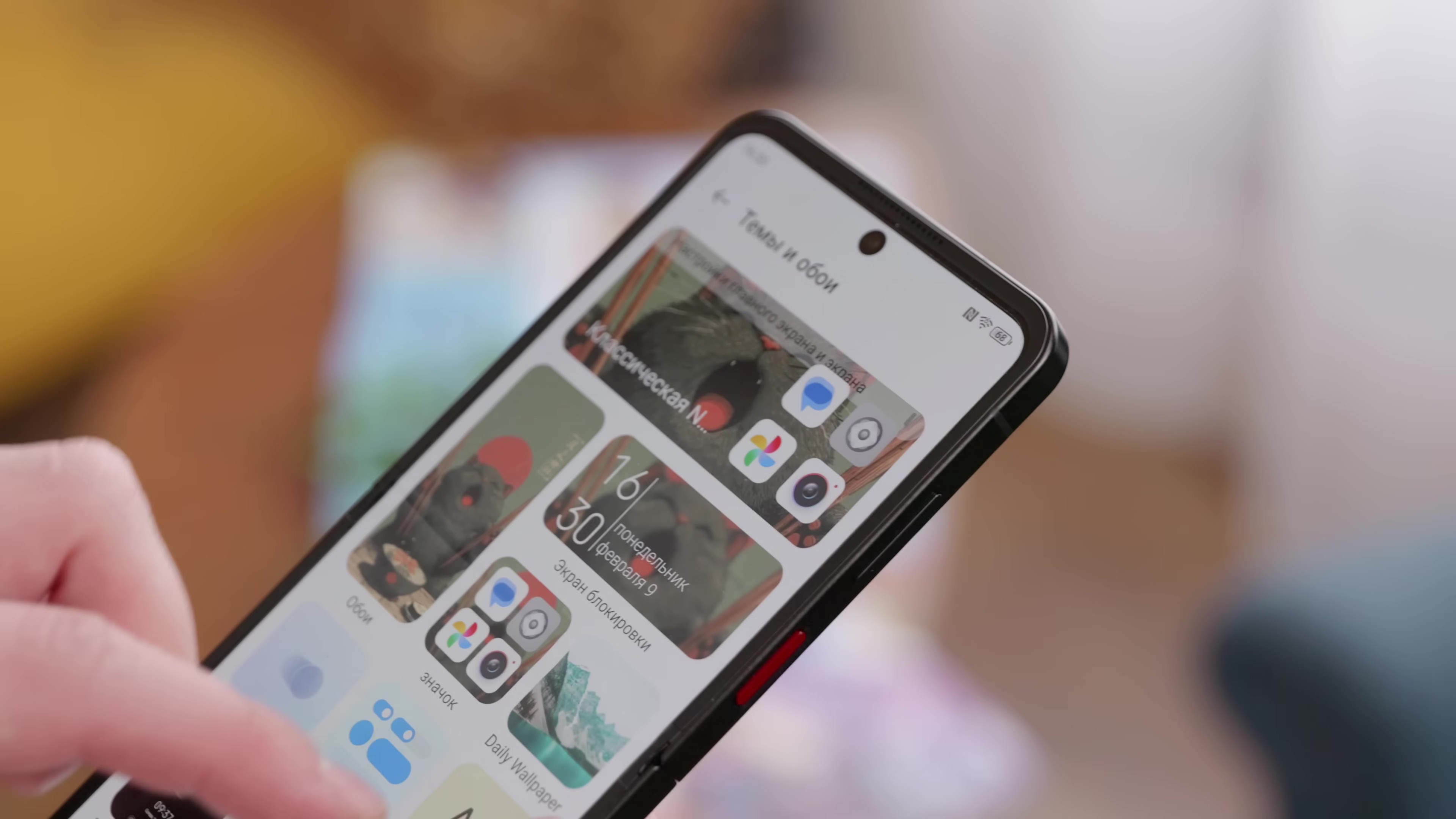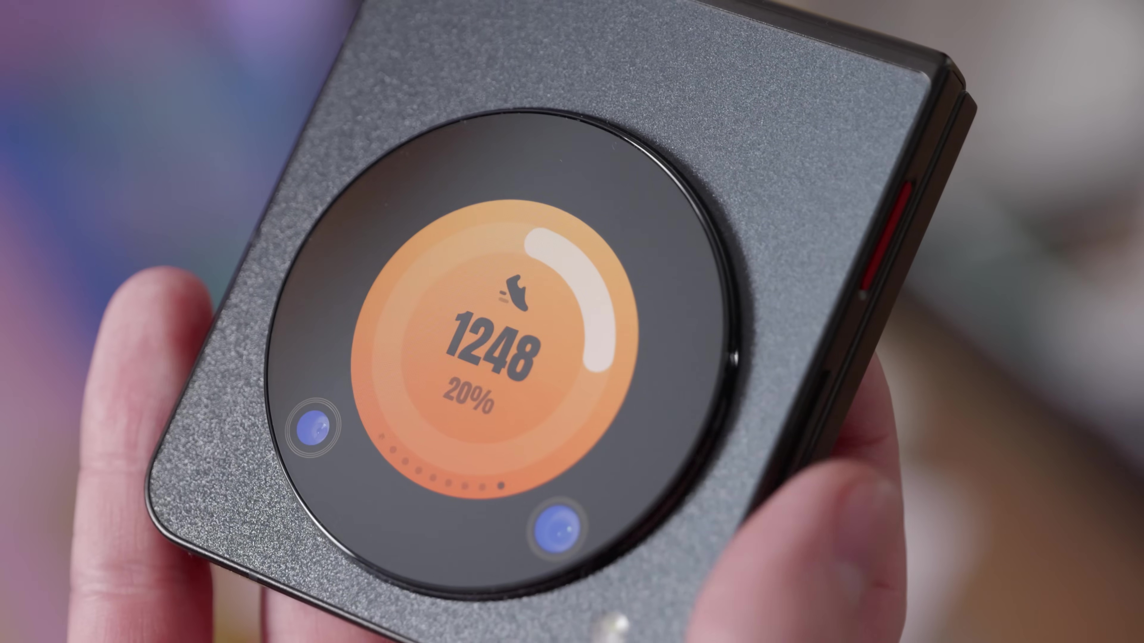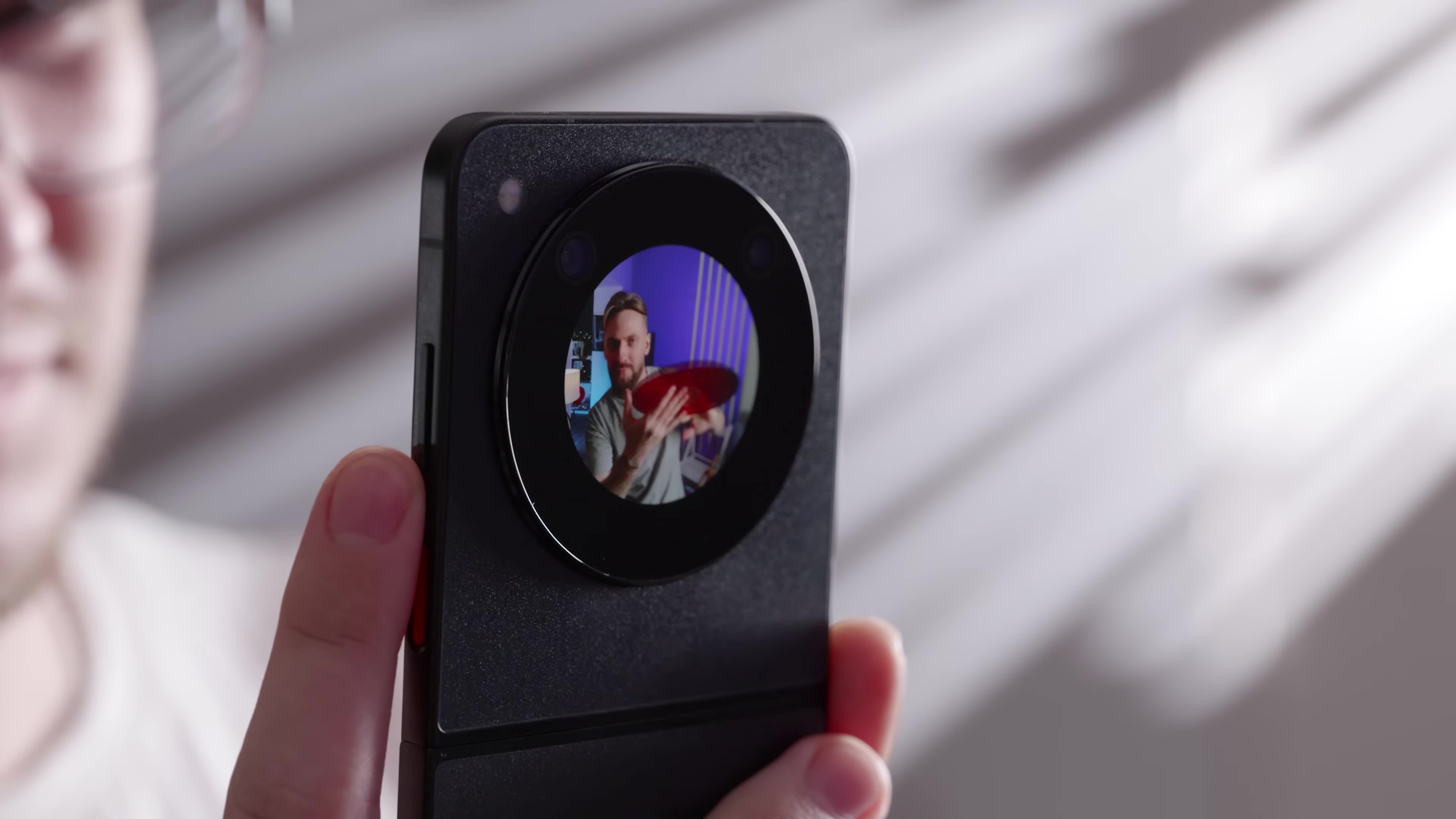 Внешний экранчик круглый и окружен кольцом, куда поместили пару камер. Что можно настроить? Обои, которые могут быть как анимированными, так и статичными. В простое может работать AOD. Еще есть 8 виджетов: типа календаря, камеры, погоды и шагомера. Музыкальный виджет избирательный – с Яндекс.Музыкой дружить не хочет, а вот Spotify признает. Когда пользуетесь камерой, можете активировать предпросмотр на внешнем дисплее – так удобно делать себяшки или дать кому-то возможность принять позу.