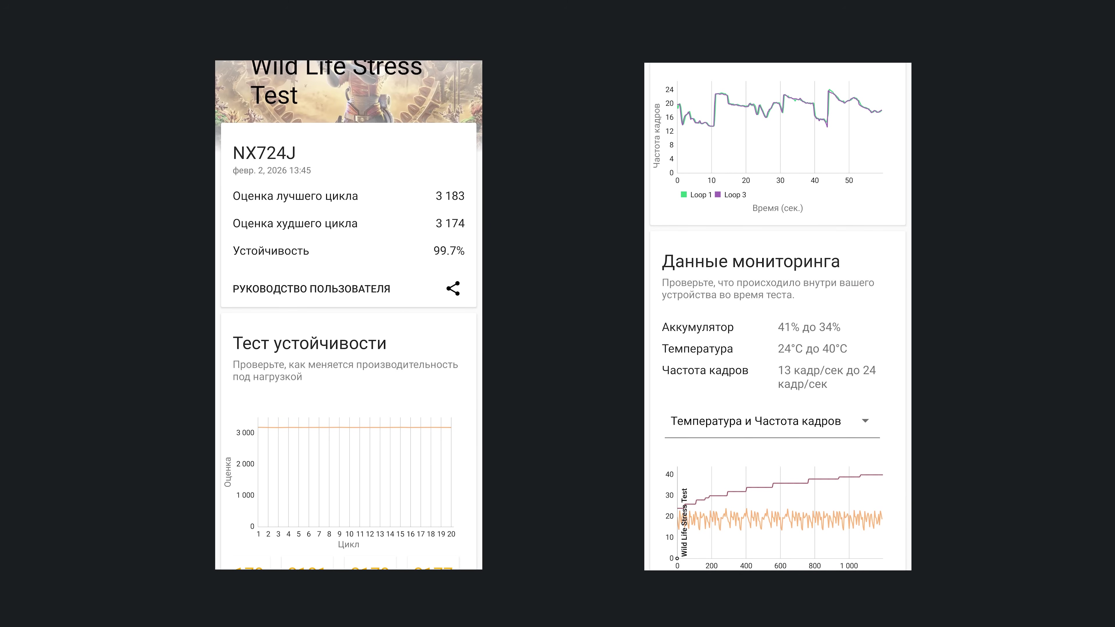 В CPU Throttling Test вычислительные ядра просаживаются примерно на треть. Графический троттлинг-тест 3DMark Wild Life выдал прямую линию и чуть более 3000 баллов. А актуальная версия AnTuTu зафиксировала почти 900 000 попугаев.