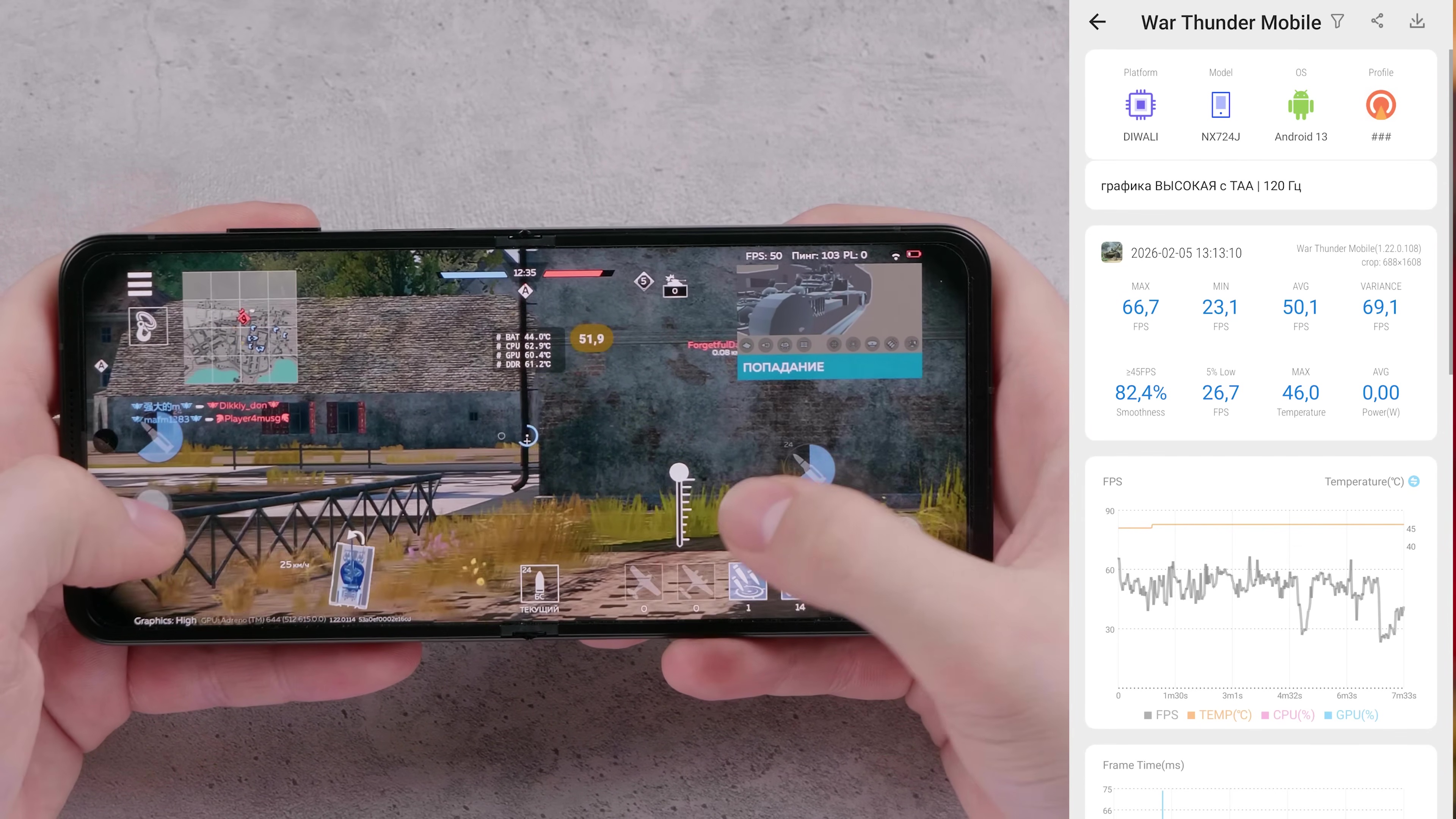 Более тяжелые проекты уровня War Thunder могут идти с просадками. Мы пробовали высокие настройки до 120 фпс, а по факту получили максимум 66 фпс и просадки до 23. При средних 50 кадрах играется неплохо и графоний симпатичный, но не помешало бы понизить визуал.
