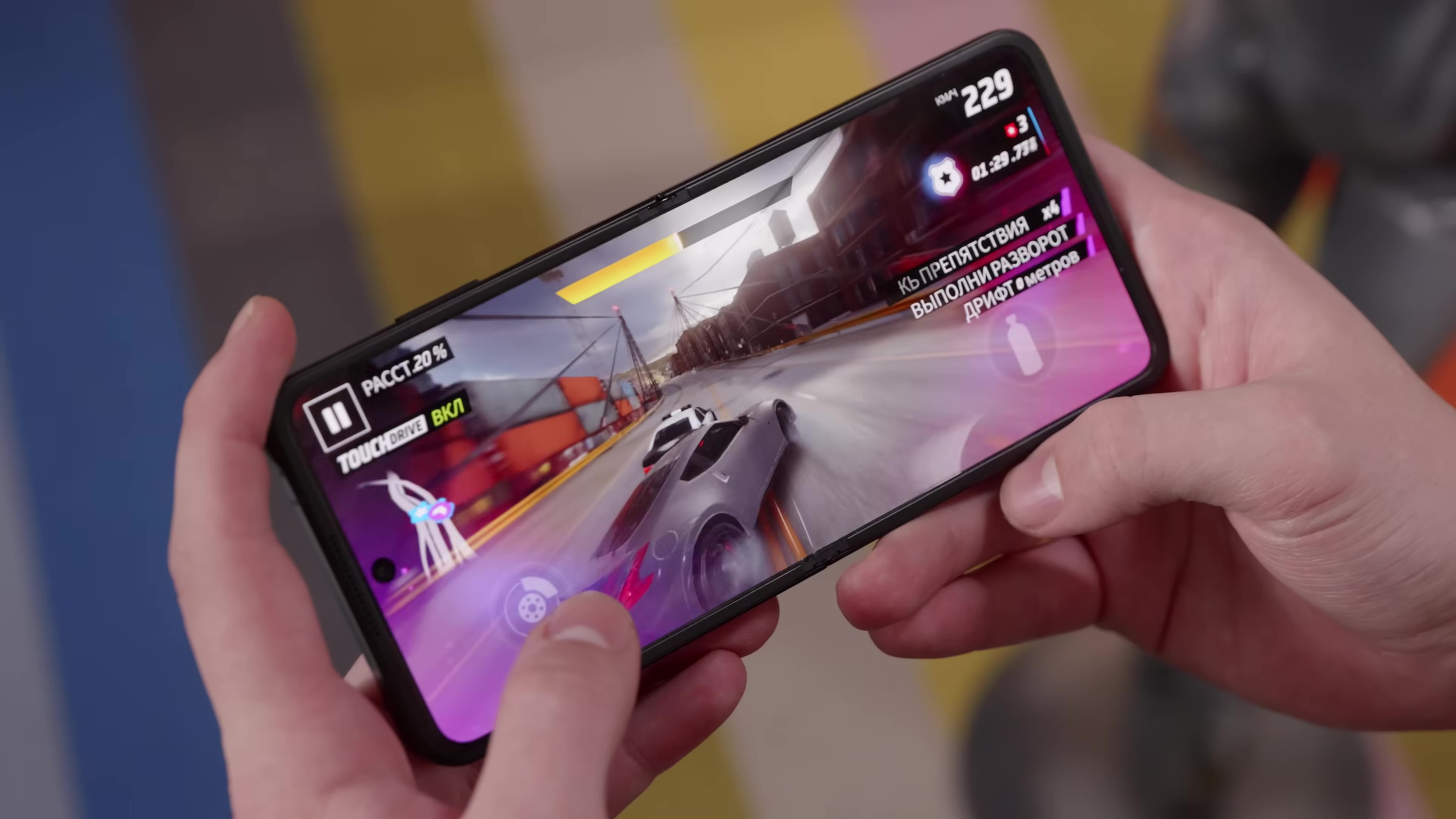 Экран сосисочный 21:9. Матрица LTPS и частота только от 60 до 120 Гц меняется. Сенсорный отклик в интерфейсе и играх составляет до 300 Гц. Гибкость экрана можно использовать в камере или при просмотре видео на YT, поставив смартфон как штатив. В принципе, это стандартные и вполне реальные сценарии – несколько раз живьем подобное наблюдал.