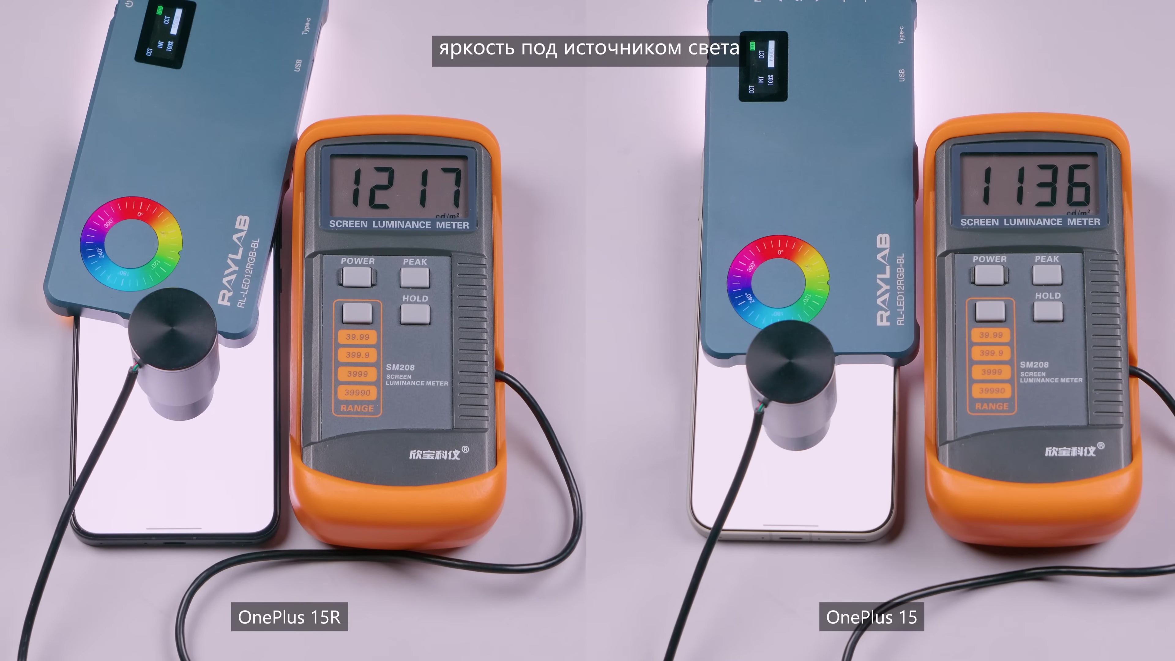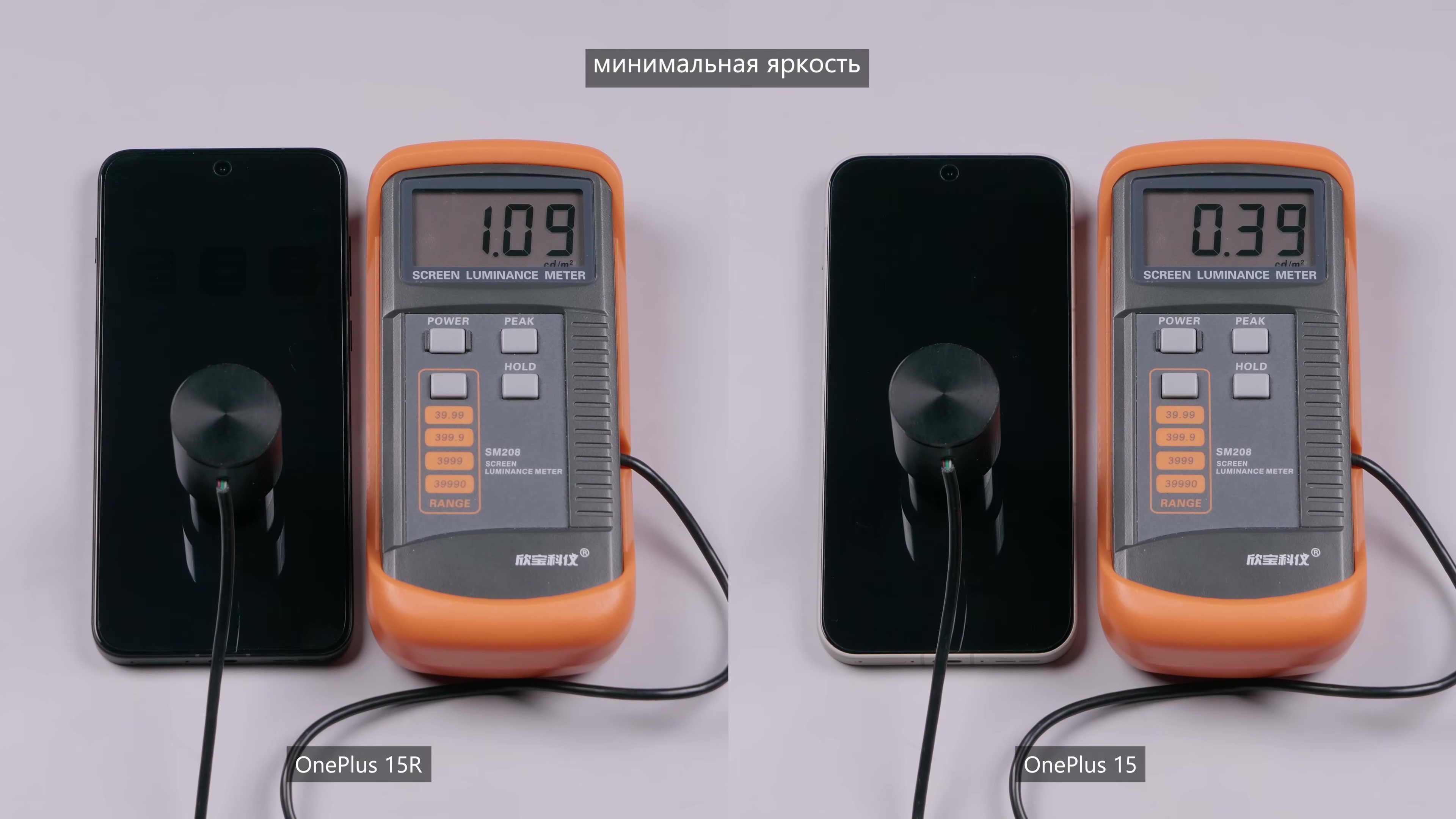 Максимальную яркость компания обещает одинаковую в 1800 нит, а перед вами сейчас наши замеры. Ручная яркость и яркость под источником света с галочкой автояркости. А еще наш высокоточный прибор способен замерять минимальную яркость – получился 1 нит у 15R и полнита у 15, если активировать опцию «Уменьшение точки белого» в специальных возможностях.